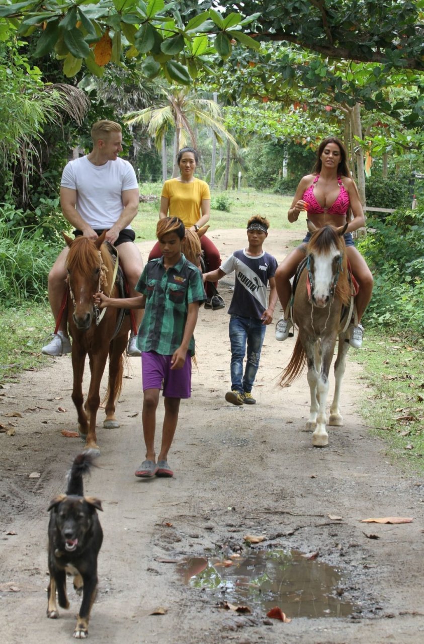La modella britannica di 40 anni Katie Price (o Jordan) con il suo fidanzato Kris Boyson vanno a cavallo sulle spiagge di Koh Samui, 22/07/2018. Katie ha cavalcato a cavallo mostrando uno spettacolo sorprendente con un serio décolleté in un reggiseno rosa stretto e decorato. Kris ha cavalcato senza maglietta mentre la coppia riportava con attenzione i loro cavalli alle scuderie.