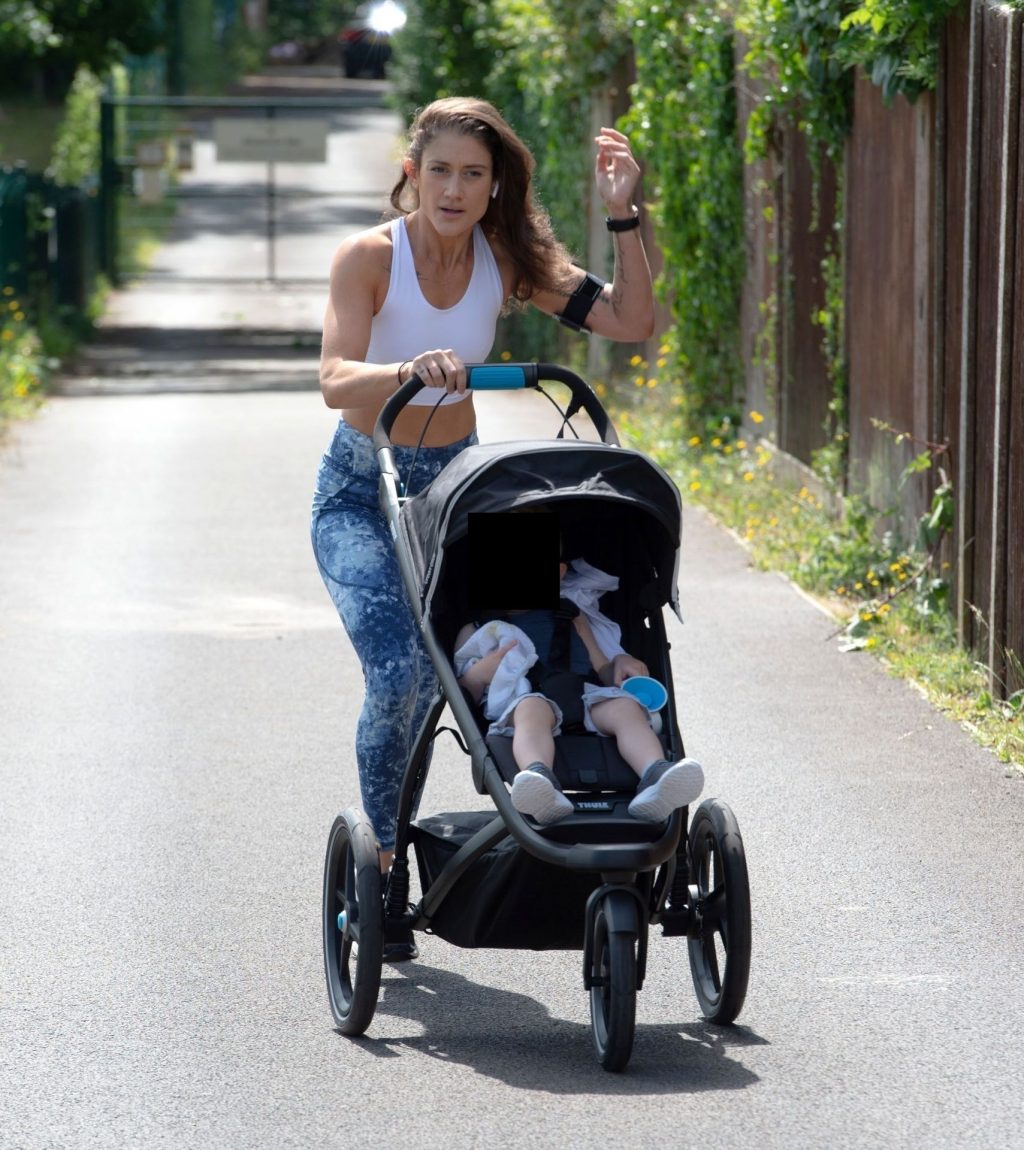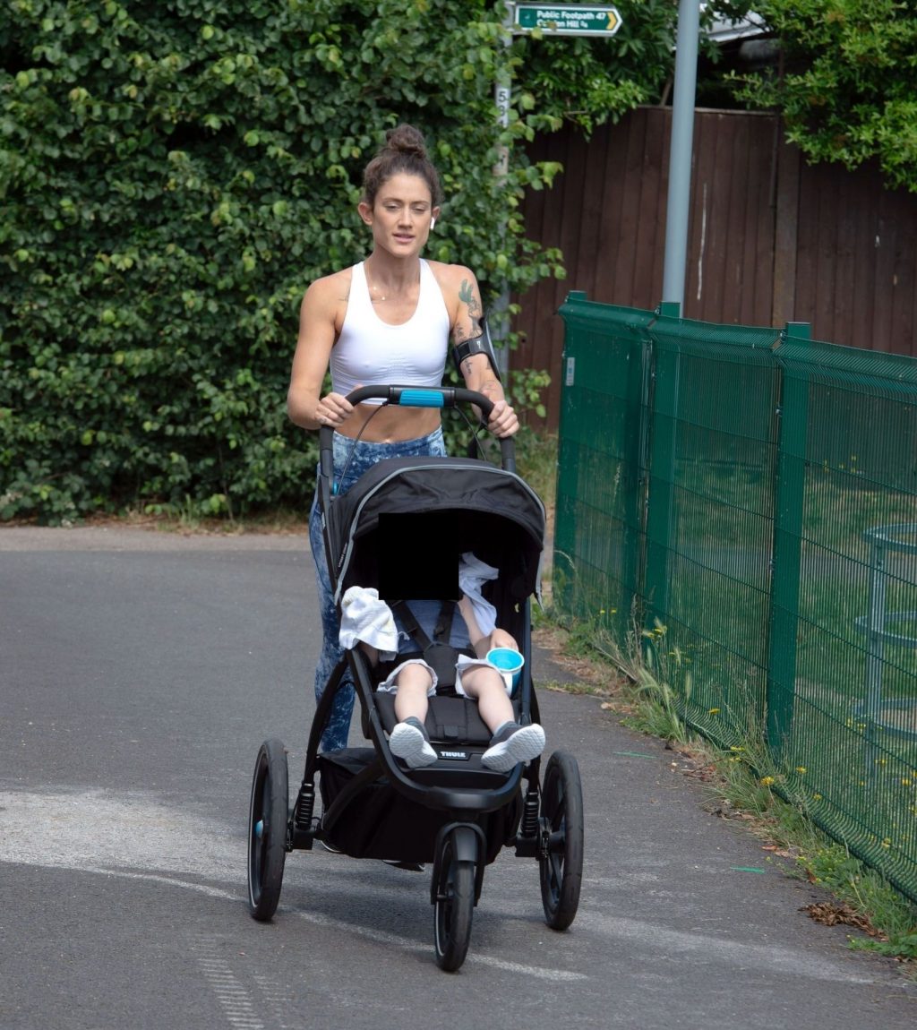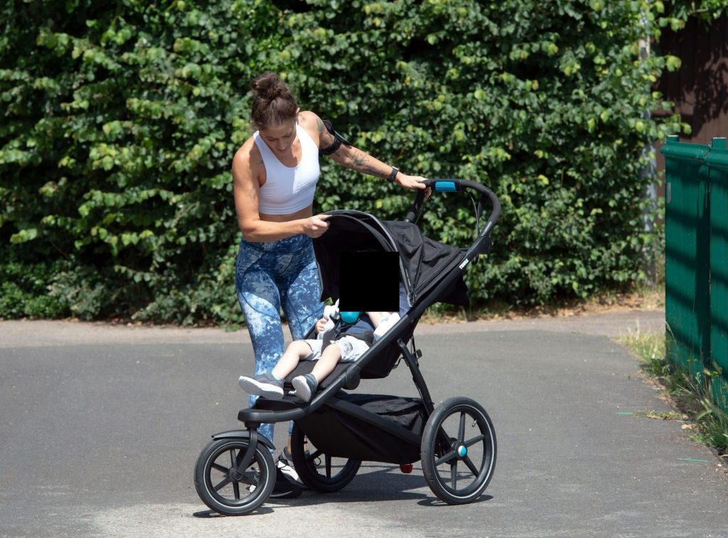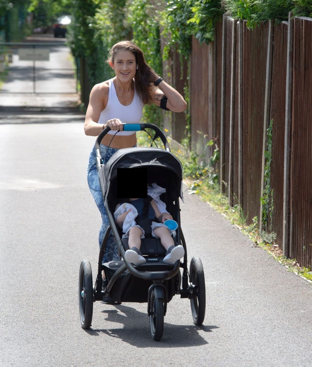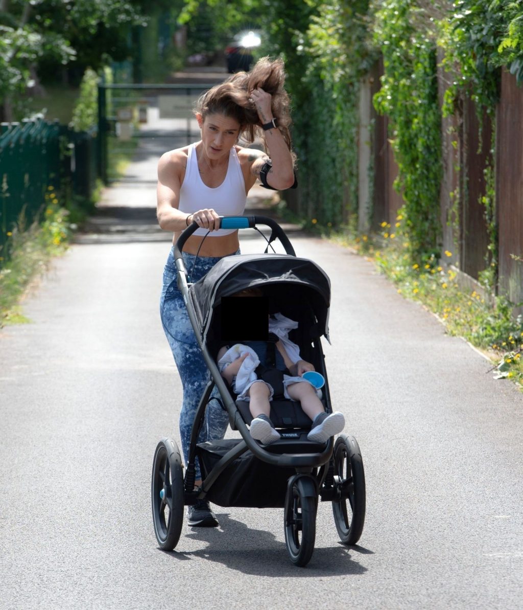 “X-Factor” star Katie Waissel mostra il suo fisico muscoloso mentre porta a spasso il figlio Hudson nel Nord di Londra, 16/06/2020. La mamma single mostra i suoi addominali scolpiti con un paio di pantaloni da jogging blu e una maglietta bianca mentre viene vista vicino a casa sua.