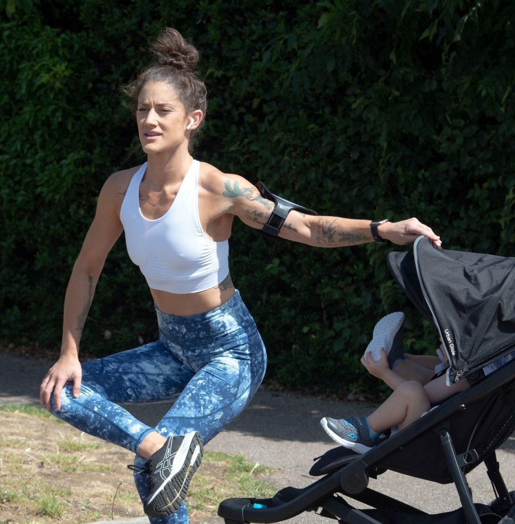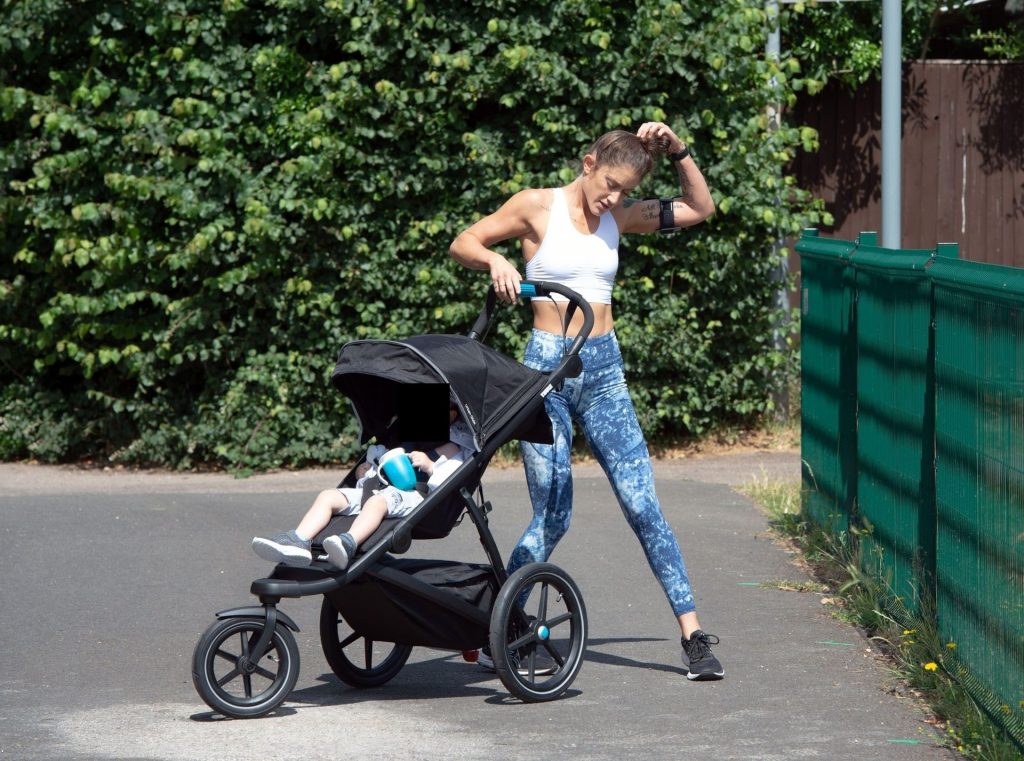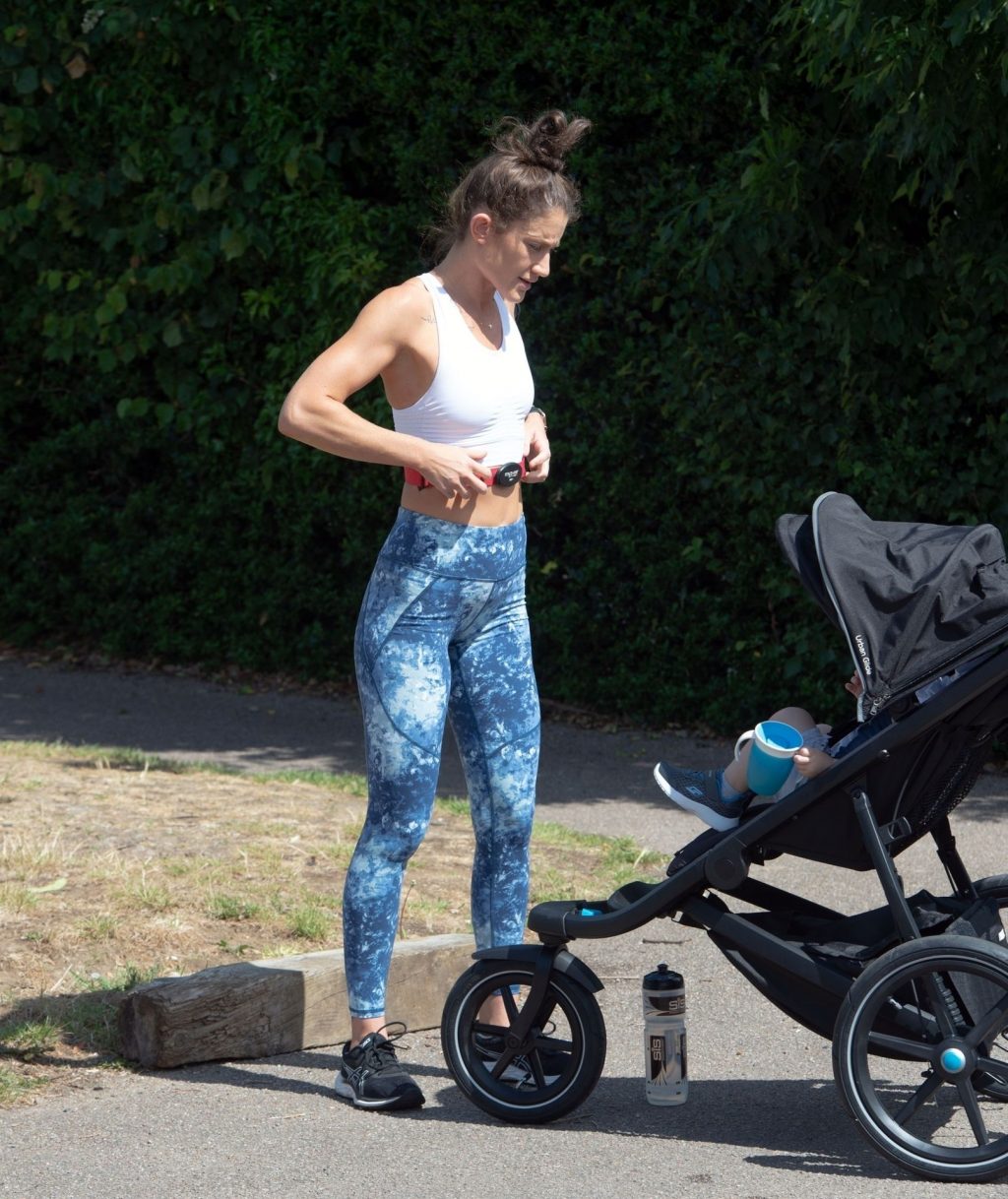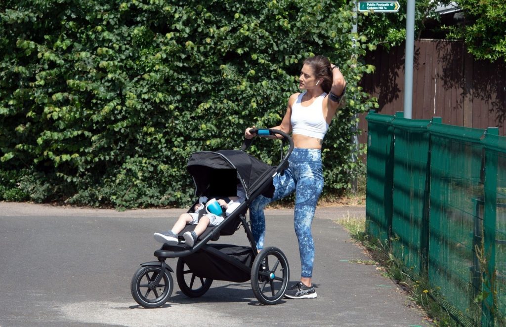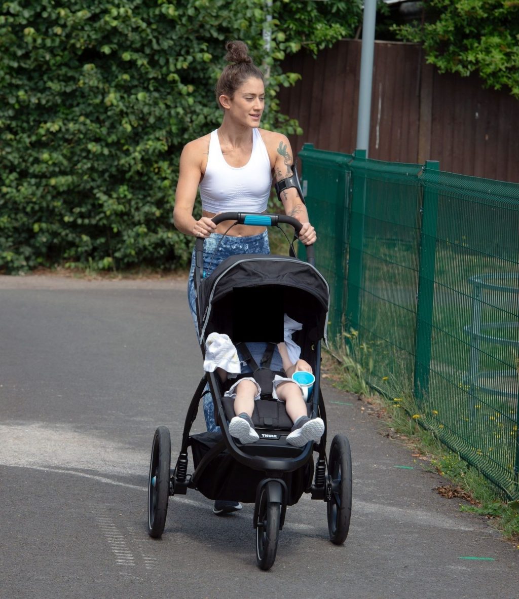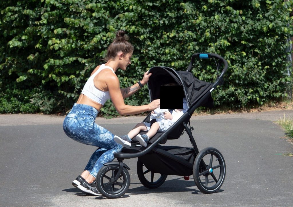 “X-Factor” star Katie Waissel mostra il suo fisico muscoloso mentre porta a spasso il figlio Hudson nel Nord di Londra, 16/06/2020. La mamma single mostra i suoi addominali scolpiti con un paio di pantaloni da jogging blu e una maglietta bianca mentre viene vista vicino a casa sua.