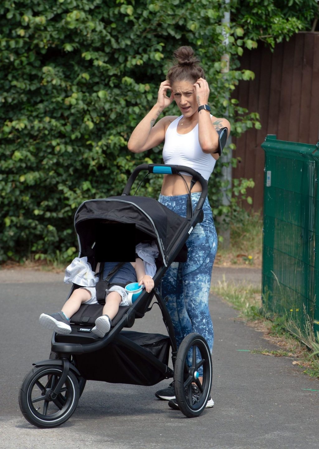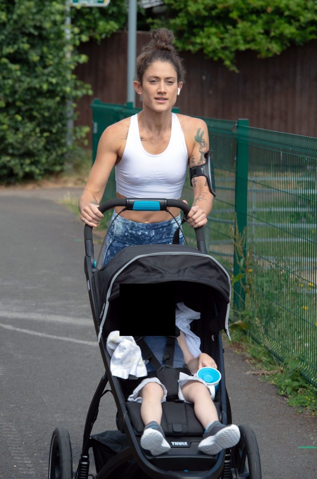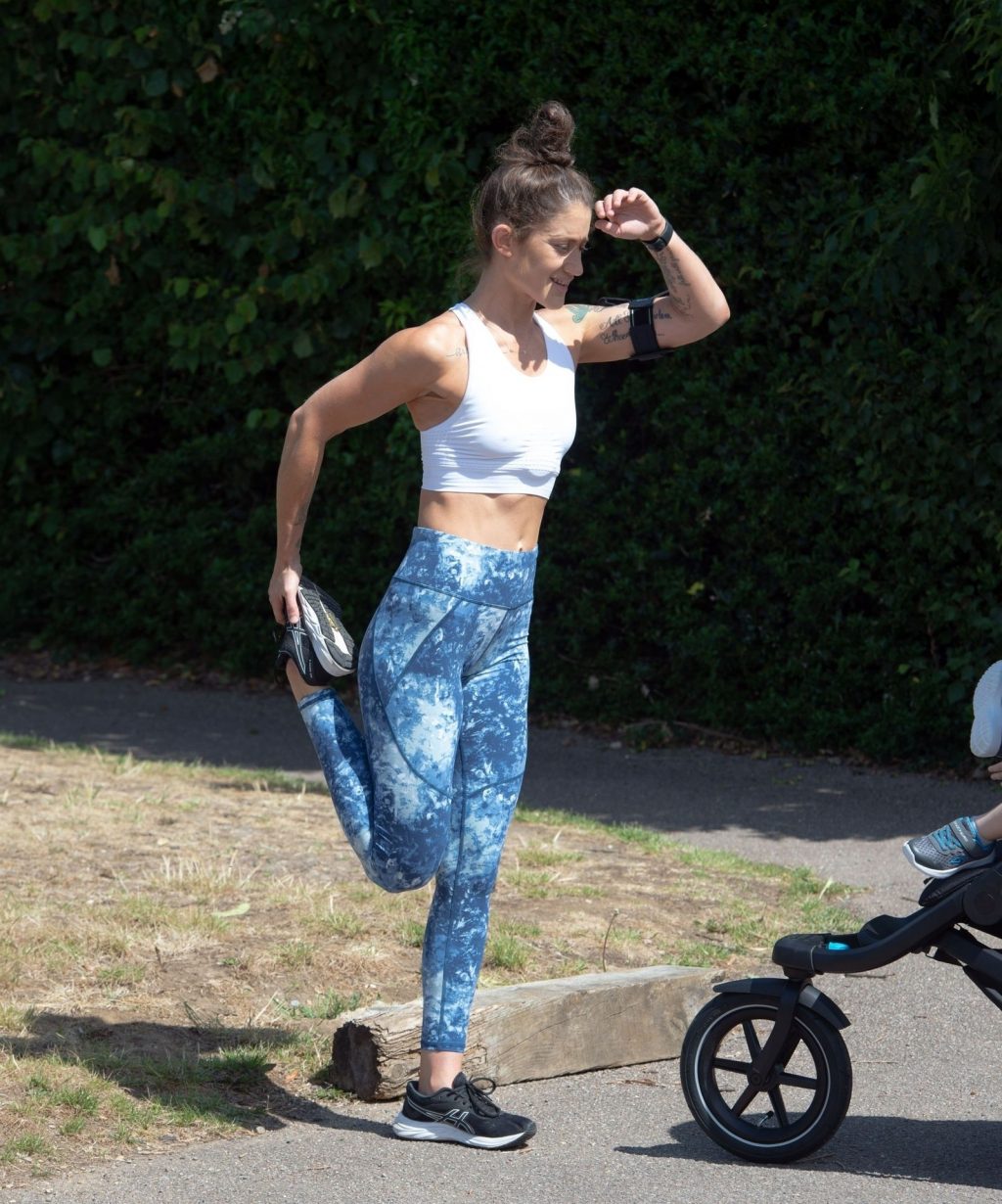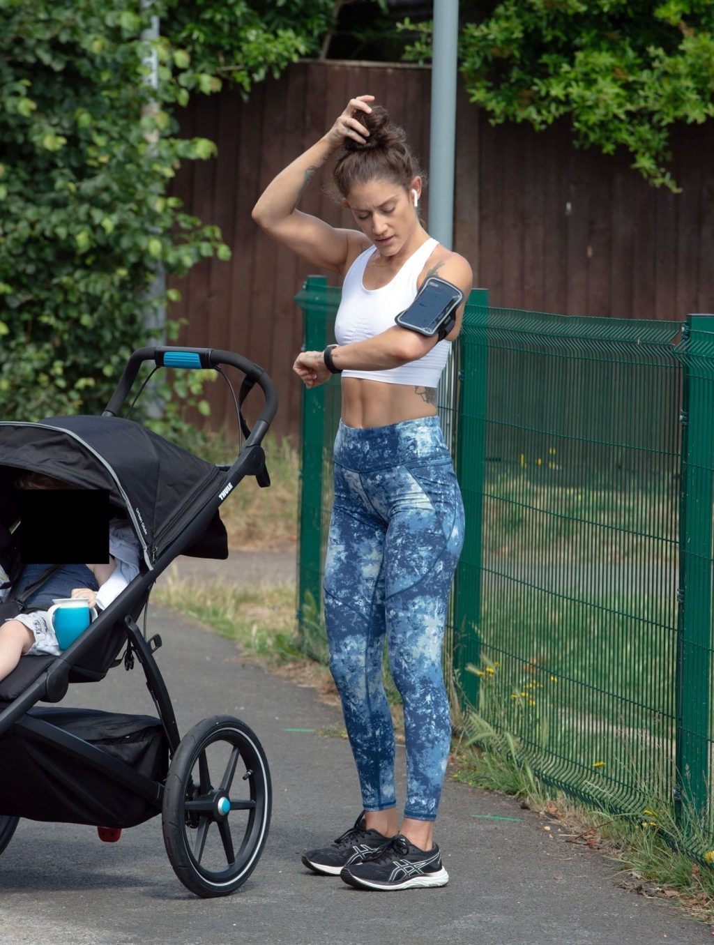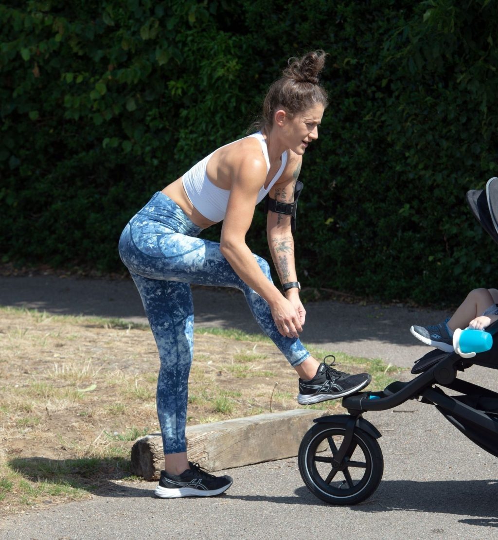“X-Factor” star Katie Waissel mostra il suo fisico muscoloso mentre porta a spasso il figlio Hudson nel Nord di Londra, 16/06/2020. La mamma single mostra i suoi addominali scolpiti con un paio di pantaloni da jogging blu e una maglietta bianca mentre viene vista vicino a casa sua.