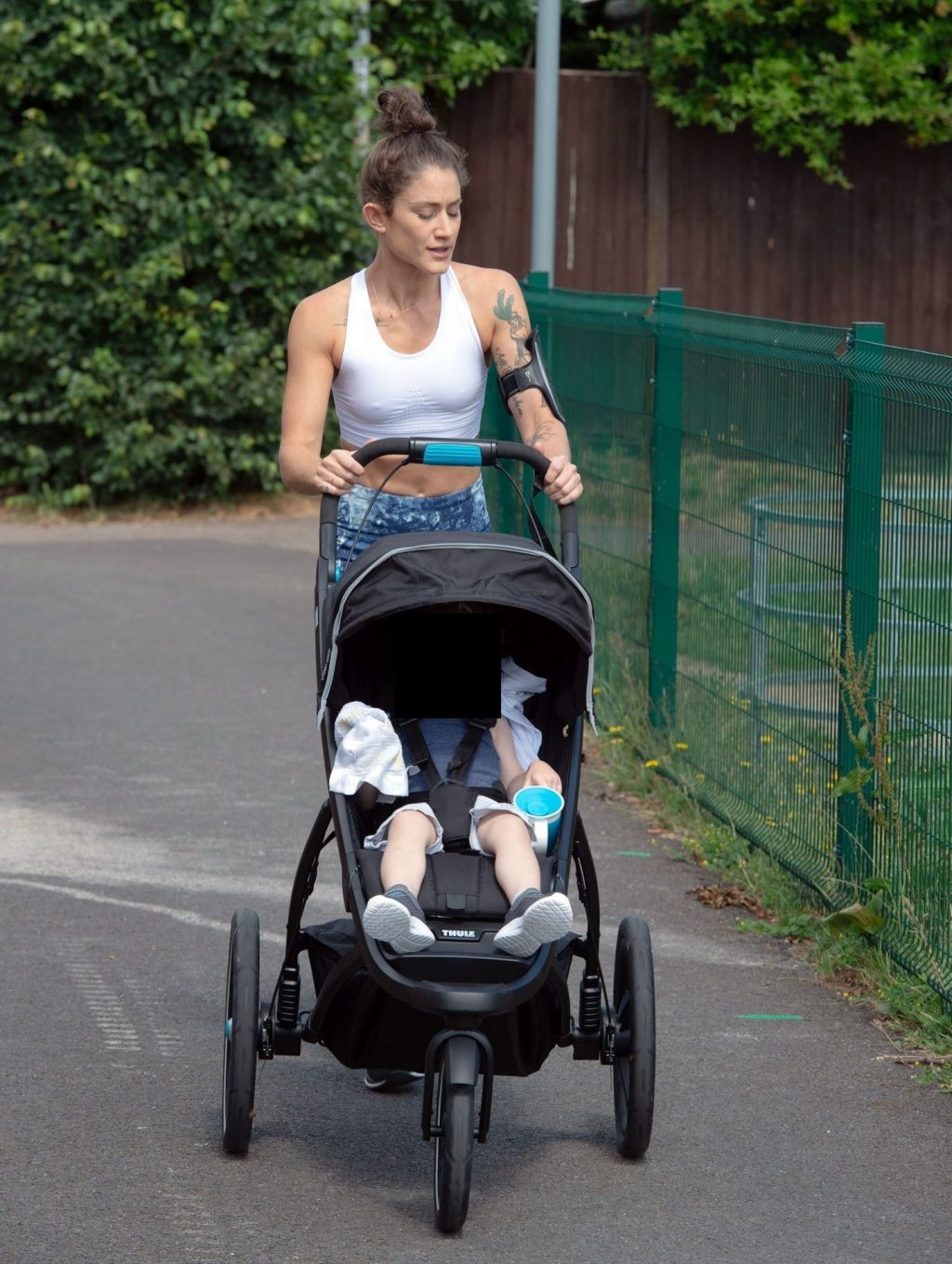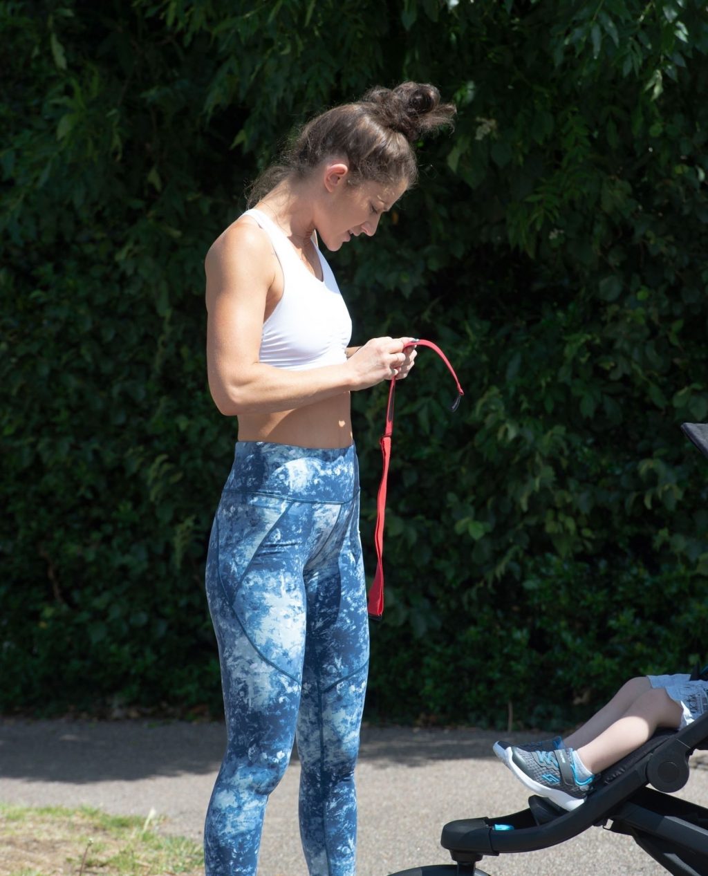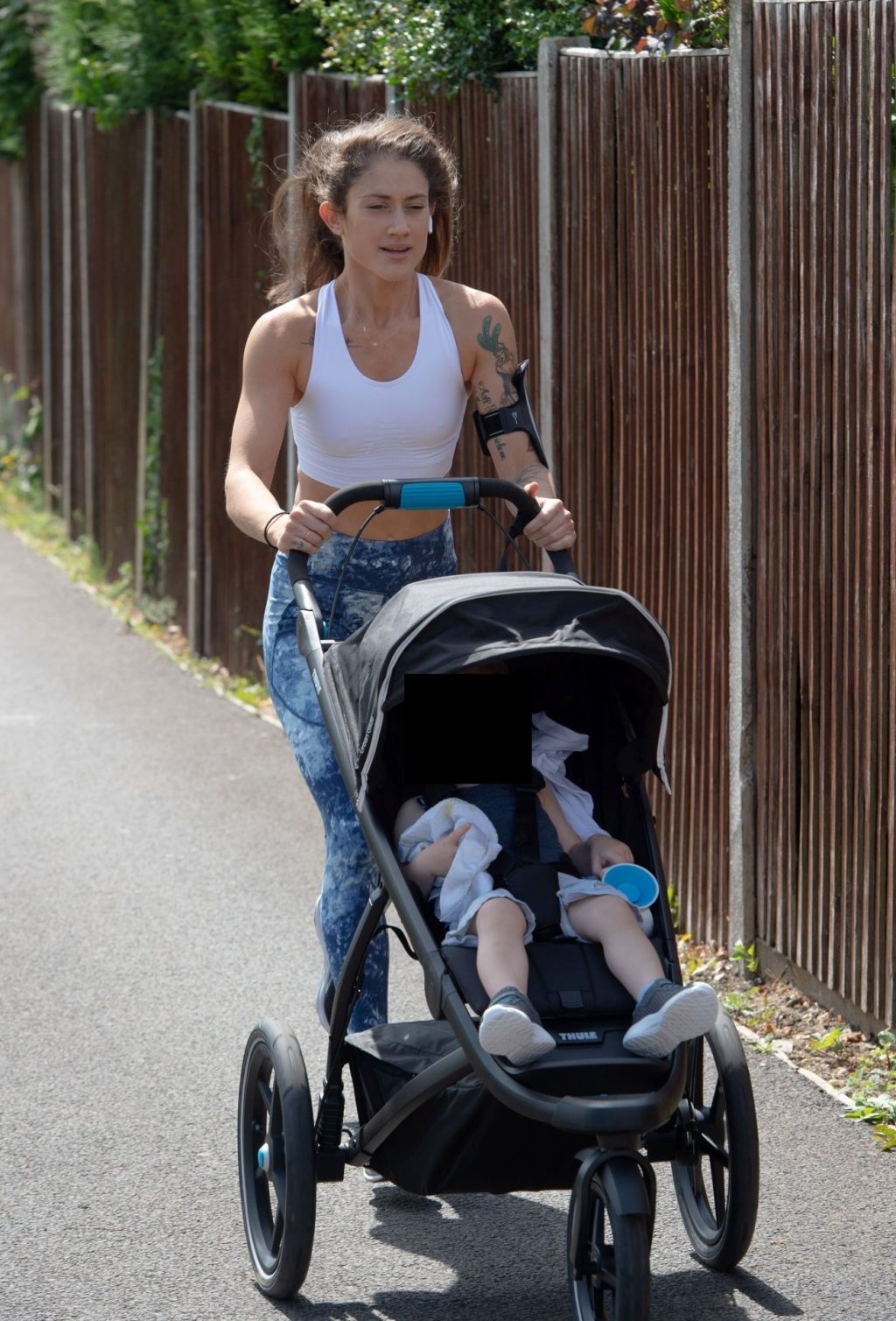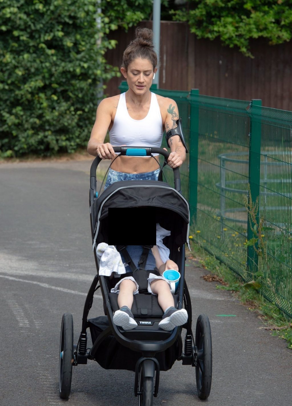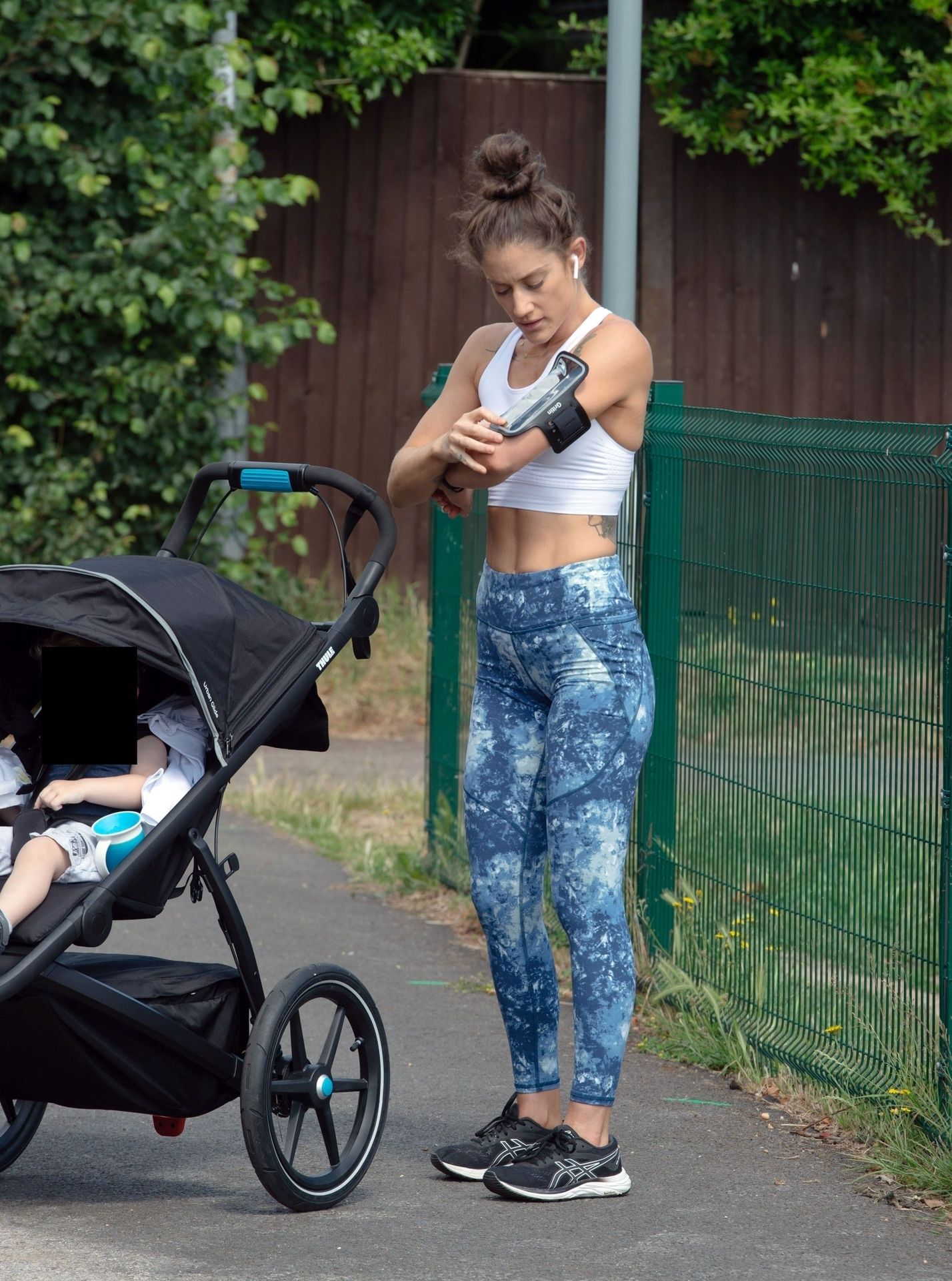“X-Factor” star Katie Waissel mostra il suo fisico muscoloso mentre porta a spasso il figlio Hudson nel Nord di Londra, 16/06/2020. La mamma single mostra i suoi addominali scolpiti con un paio di pantaloni da jogging blu e una maglietta bianca mentre viene vista vicino a casa sua.