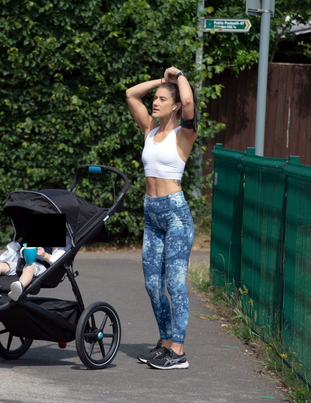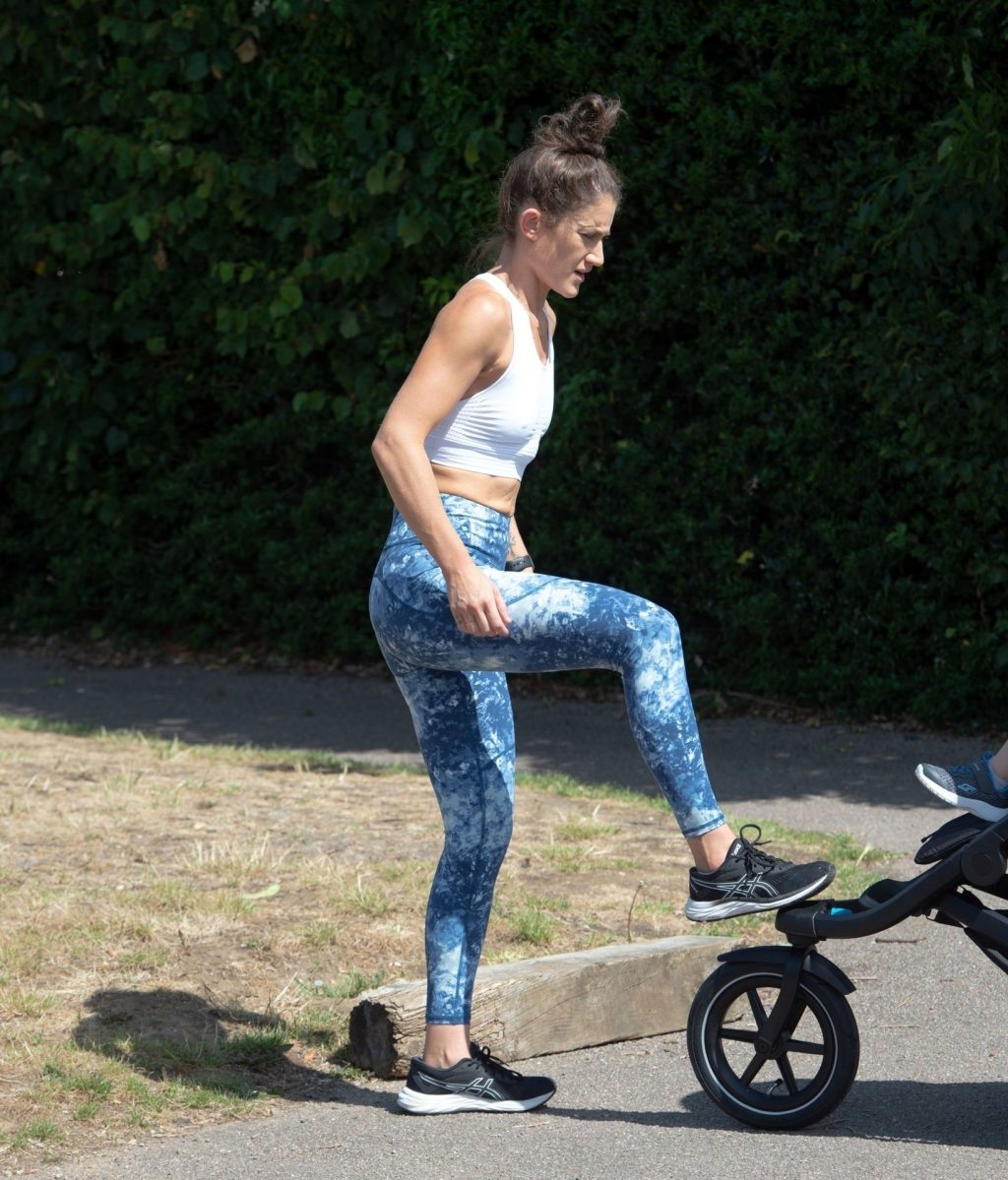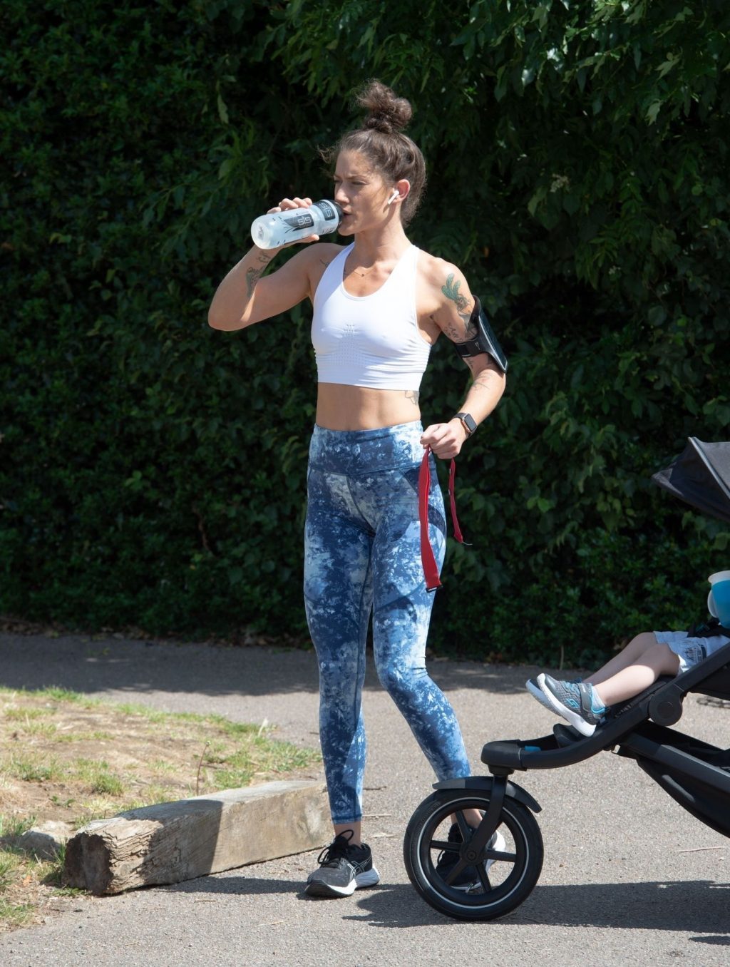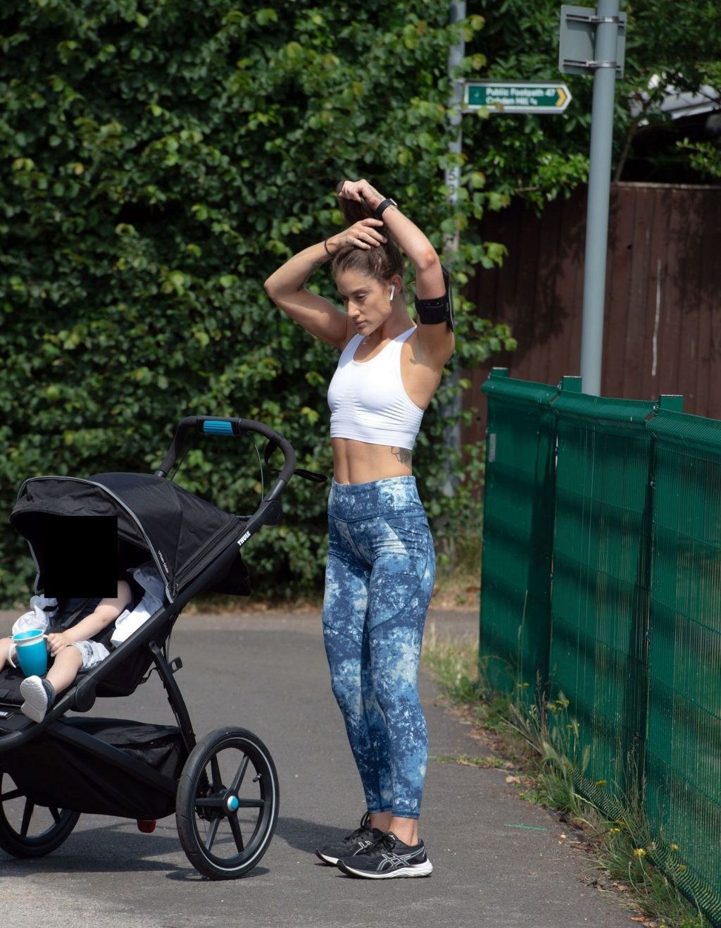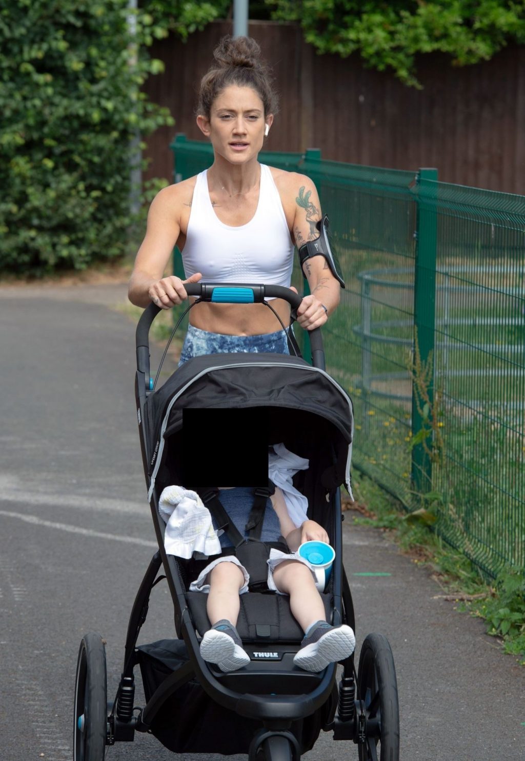“X-Factor” star Katie Waissel mostra il suo fisico muscoloso mentre porta a spasso il figlio Hudson nel Nord di Londra, 16/06/2020. La mamma single mostra i suoi addominali scolpiti con un paio di pantaloni da jogging blu e una maglietta bianca mentre viene vista vicino a casa sua.