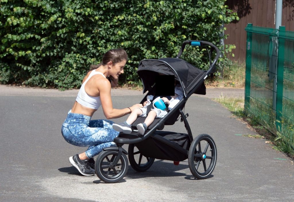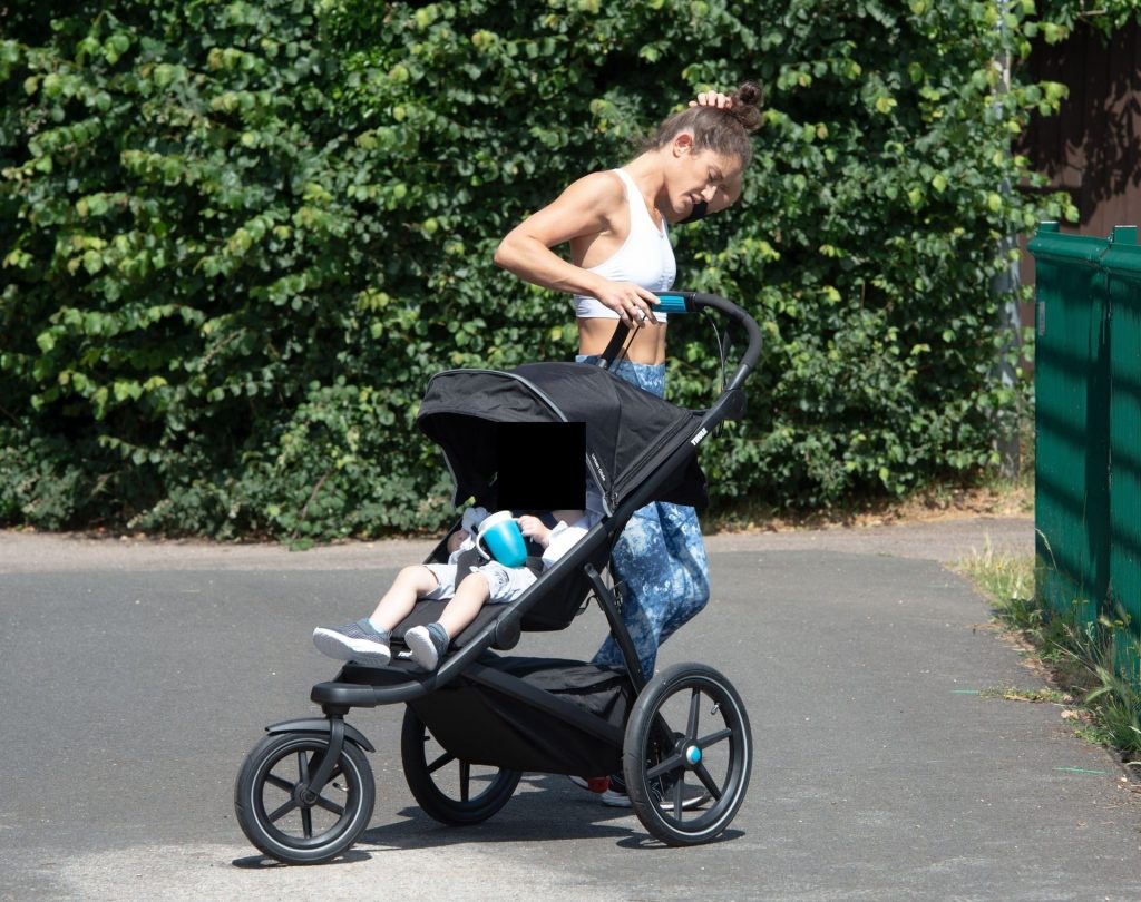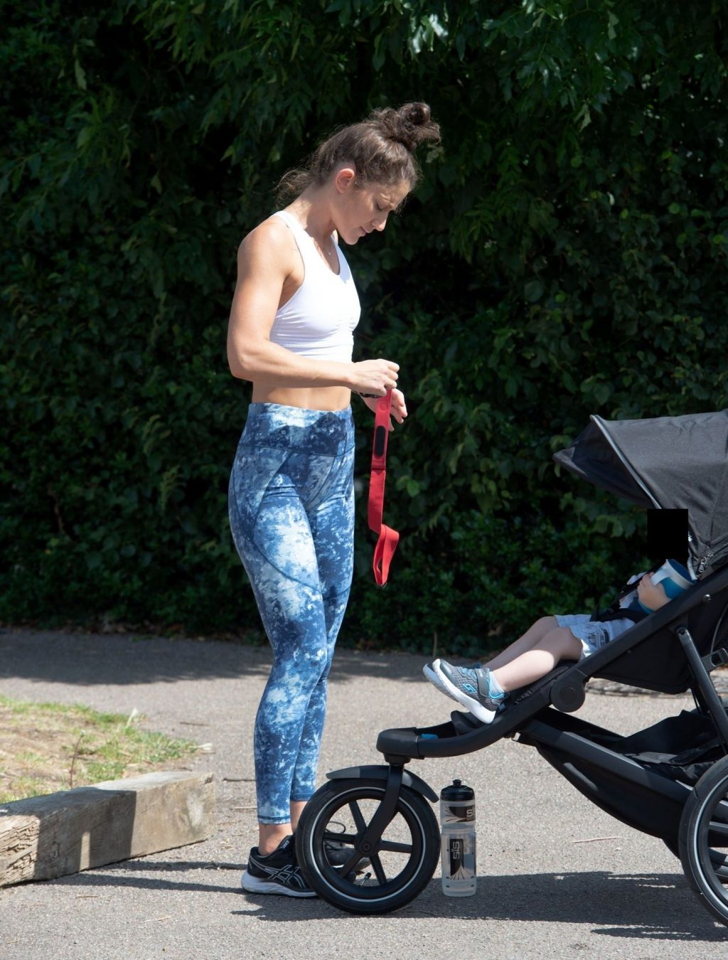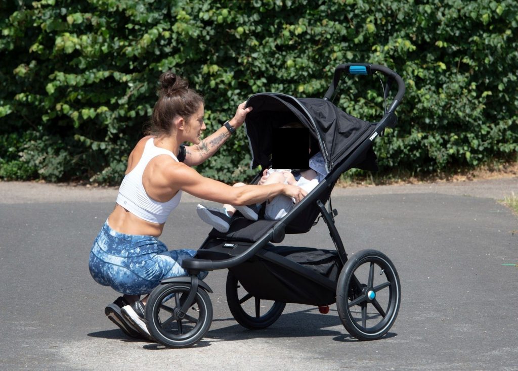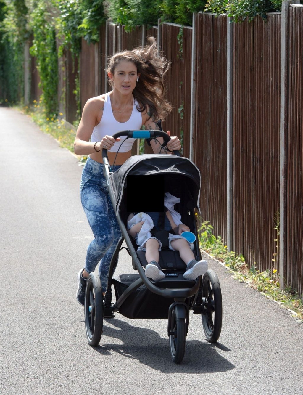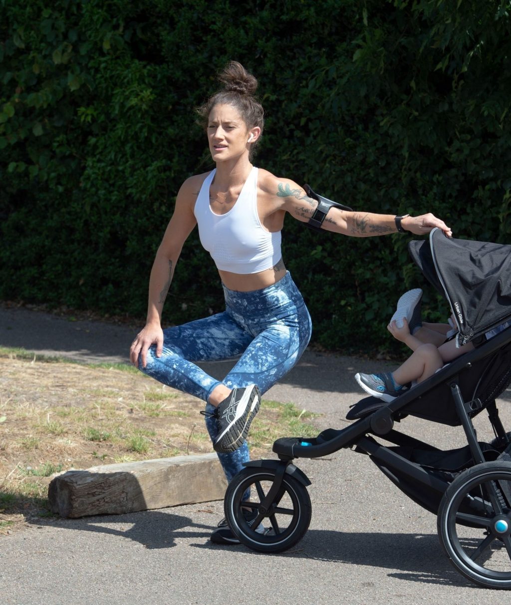 “X-Factor” star Katie Waissel mostra il suo fisico muscoloso mentre porta a spasso il figlio Hudson nel Nord di Londra, 16/06/2020. La mamma single mostra i suoi addominali scolpiti con un paio di pantaloni da jogging blu e una maglietta bianca mentre viene vista vicino a casa sua.