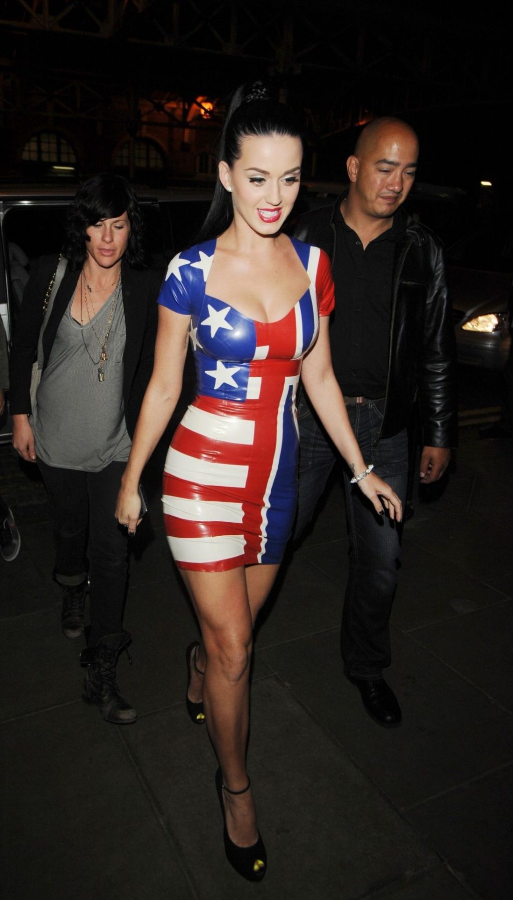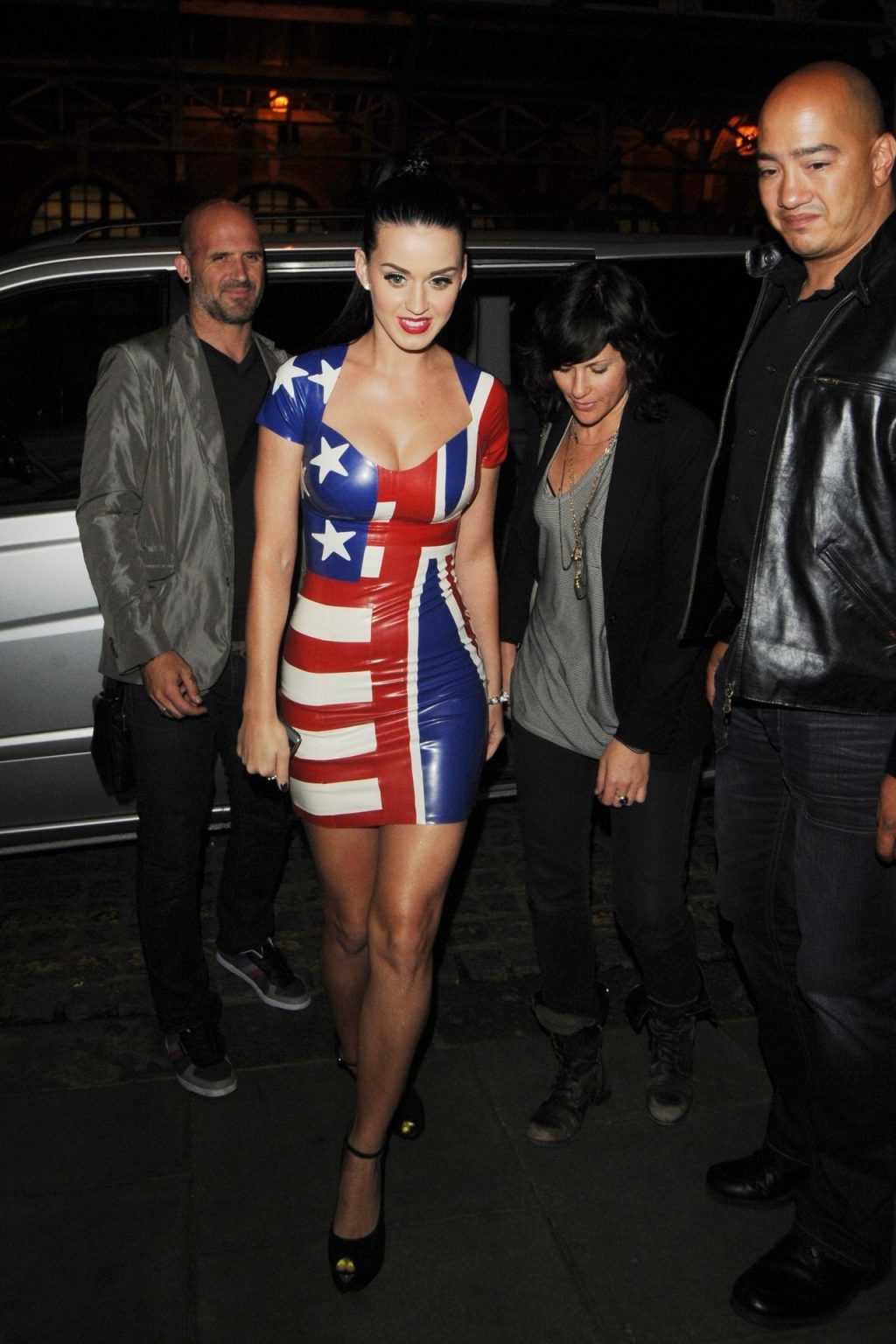 La cantante Katy Perry è stata vista al Nobu Berkley indossare un vestito in PVC che mostra metà bandiera americana e metà Union Jack a Londra, 12/06/2010.