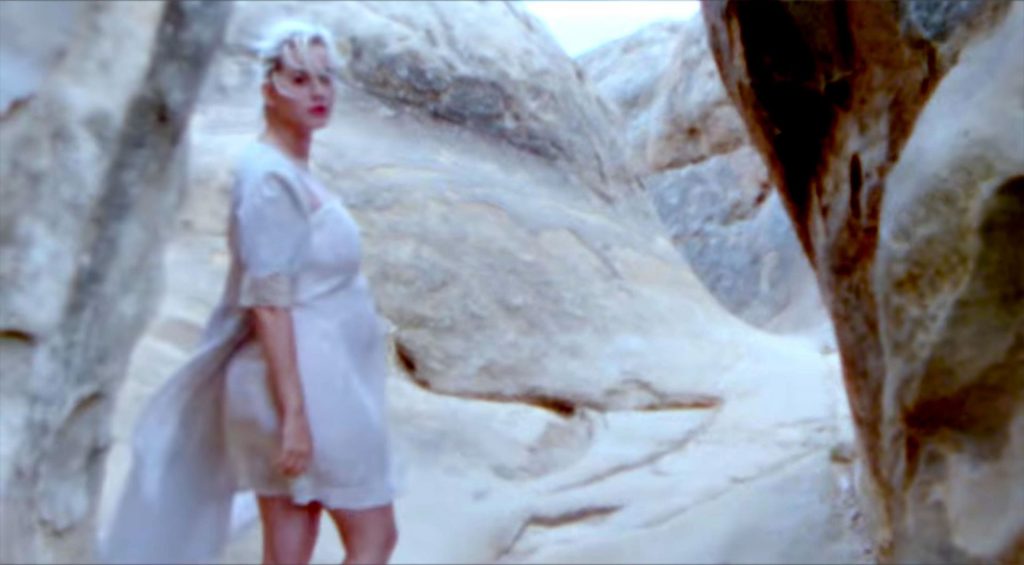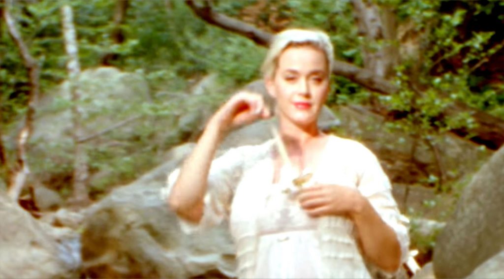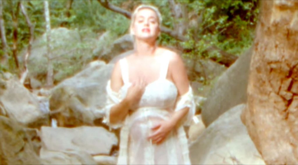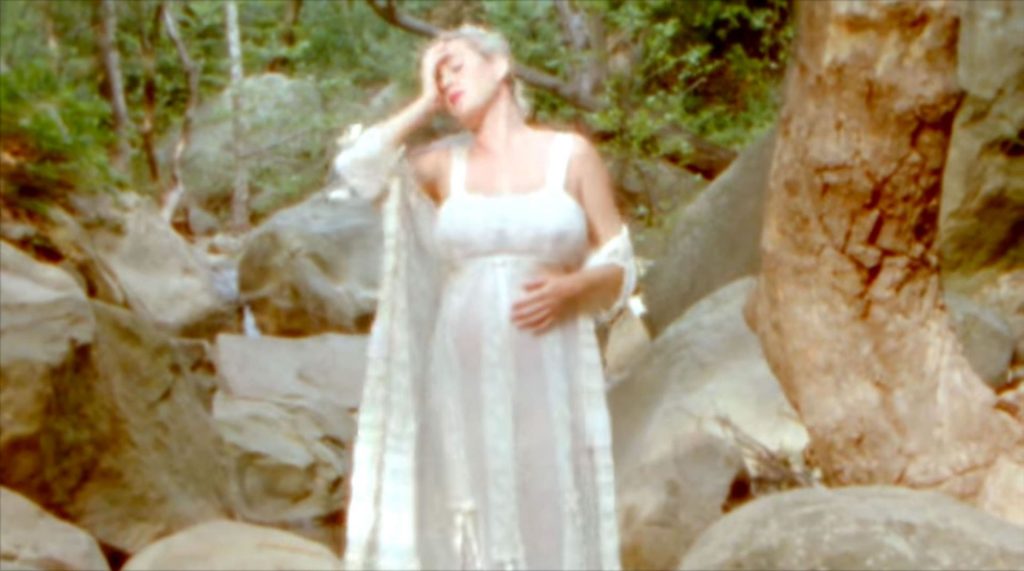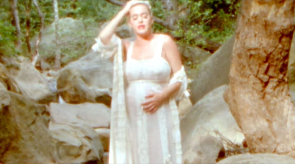Katy inizia il video seduta in mezzo a un pittoresco campo di margherite. Indossando un abito di lino trasparente e un cardigan abbinato che si chiude appena sopra il pancione, Katy viene poi vista in piedi vicino a un ruscello. Immerge un dito del piede nell’acqua prima di entrarci e togliersi l’abito. Copre con gusto il petto con il braccio ma mostra il pancione nudo e il lato posteriore alla telecamera.