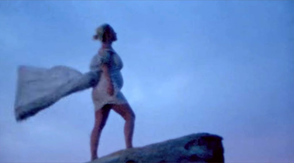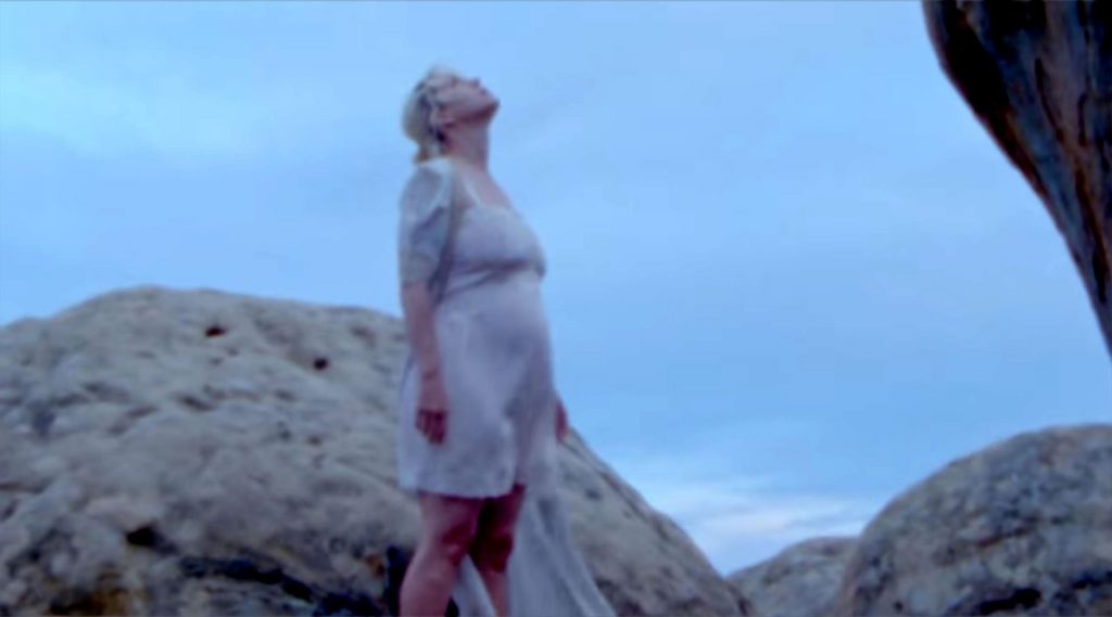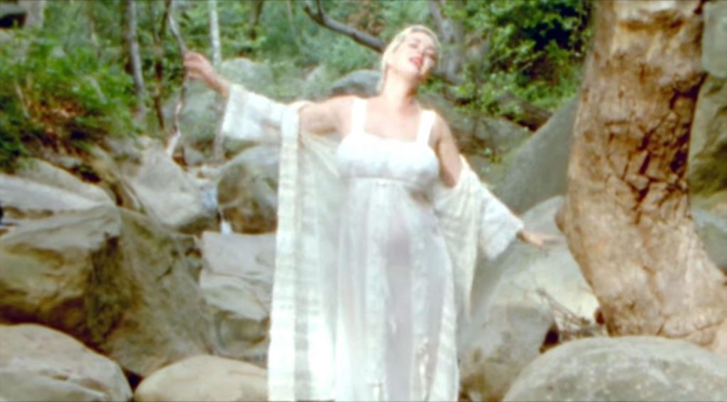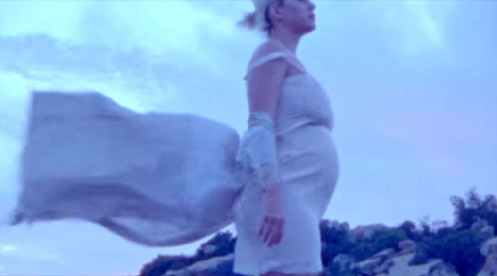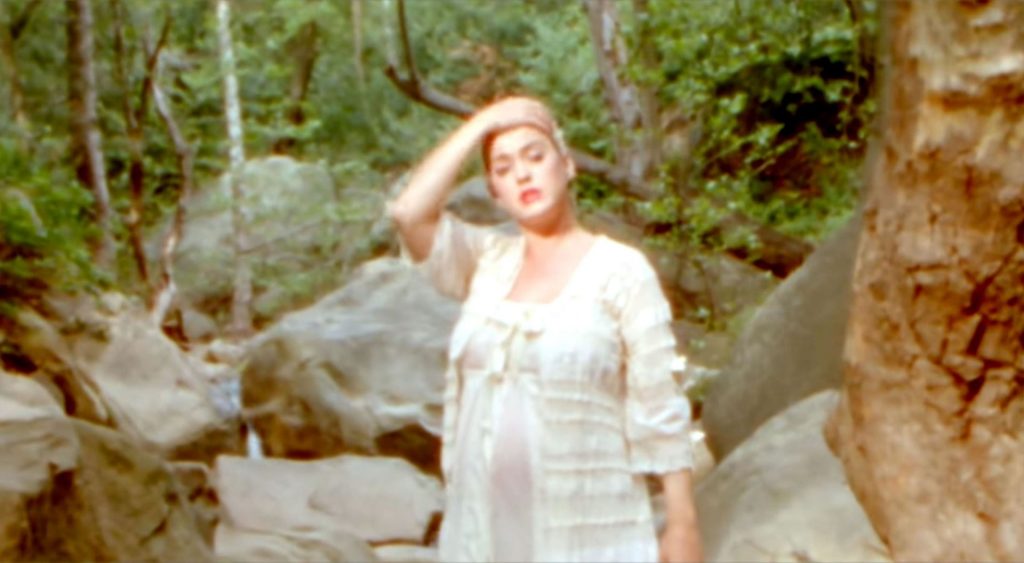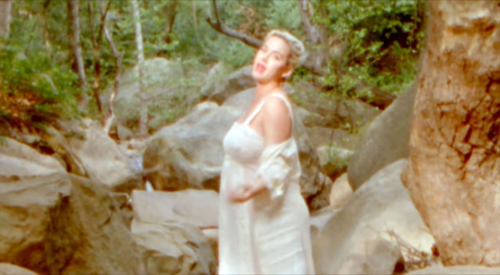 Katy inizia il video seduta in mezzo a un pittoresco campo di margherite. Indossando un abito di lino trasparente e un cardigan abbinato che si chiude appena sopra il pancione, Katy viene poi vista in piedi vicino a un ruscello. Immerge un dito del piede nell’acqua prima di entrarci e togliersi l’abito. Copre con gusto il petto con il braccio ma mostra il pancione nudo e il lato posteriore alla telecamera.