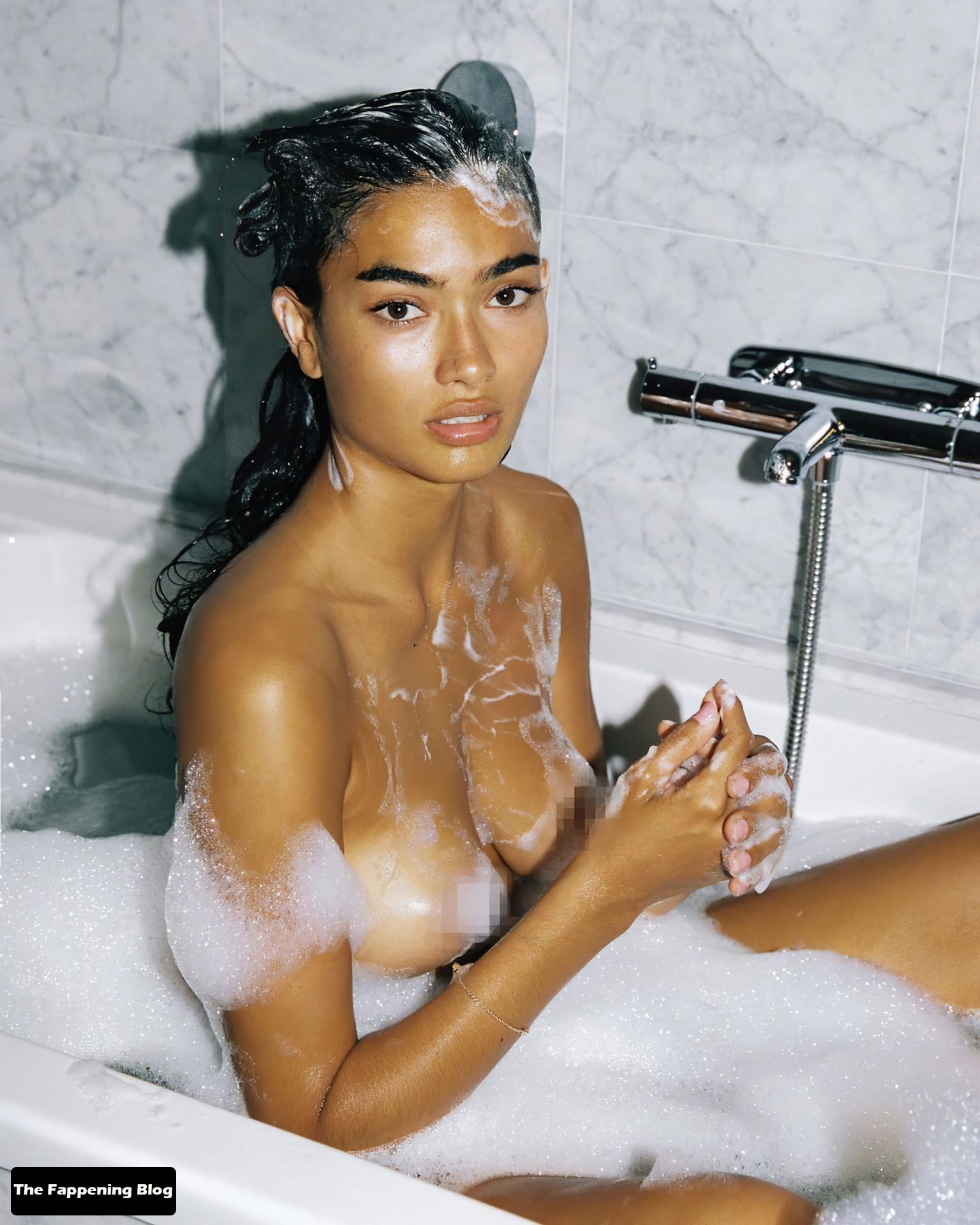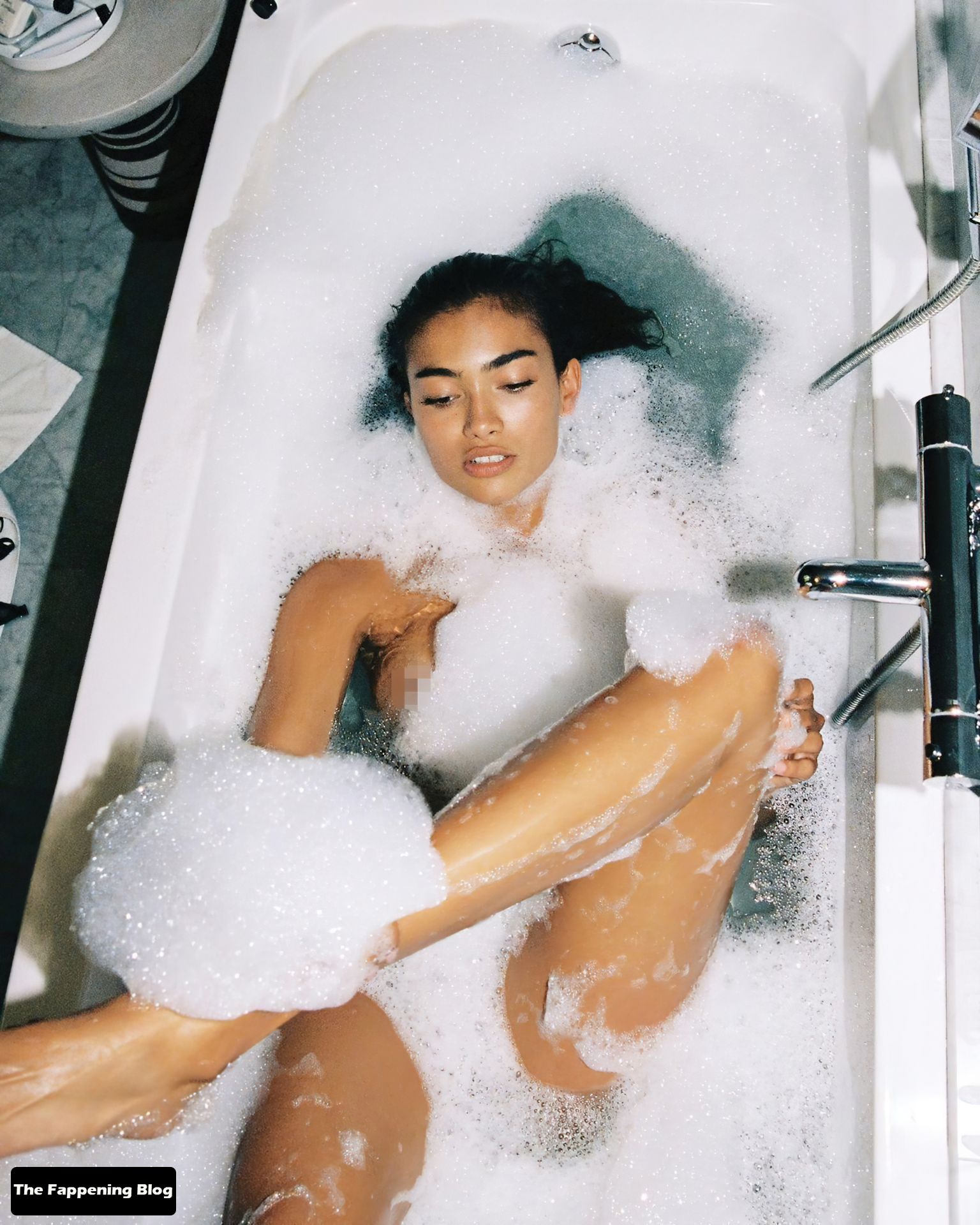 La modella Kelly Gale mostra le sue gambe snelle e il seno (con lieve censura), posando a seno nudo in una vasca da bagno con bolle (2021).