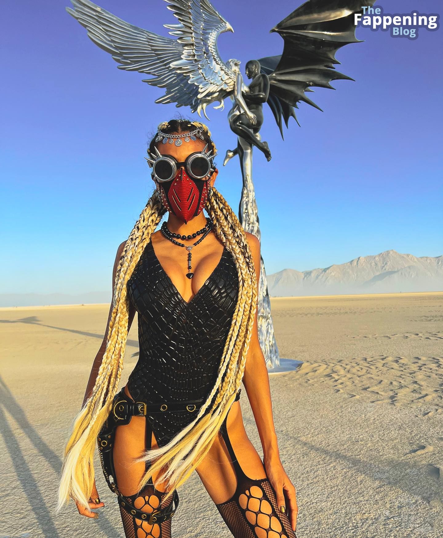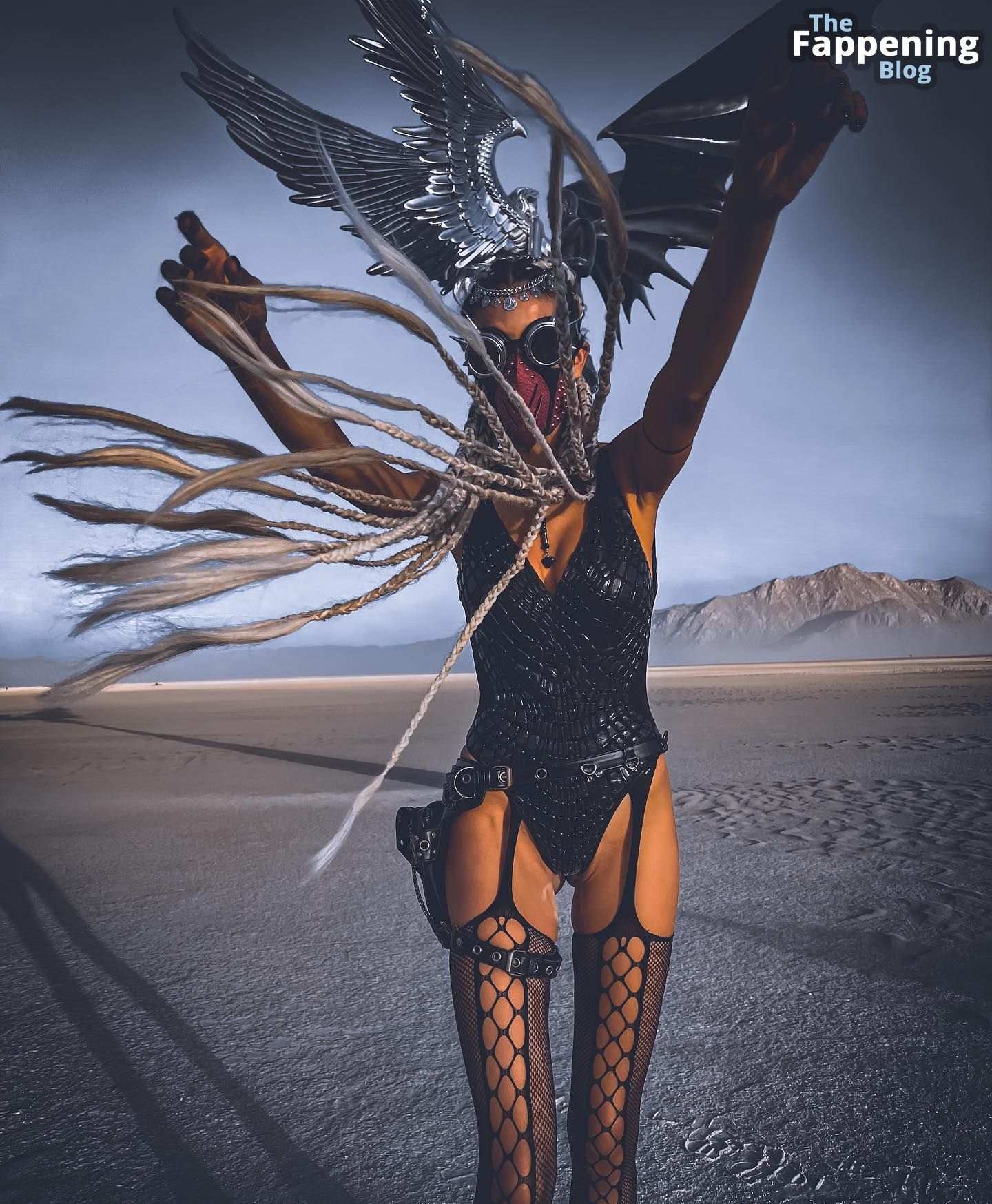 Sei foto sono state scattate sullo sfondo epico delle sculture e installazioni di Burning Man, infondendo loro quella speciale energia e vibrazione di libertà. Il volto e il corpo di Kelly sono bagnati dai raggi dorati del tramonto, amplificando la sua bellezza naturale e il suo splendore. Gli adesivi a forma di stella sul suo petto riflettono la luce, creando un effetto visivo ipnotico. E sullo sfondo, si possono intravedere intricati pezzi d’arte e le sagome di altri partecipanti al festival, aggiungendo quella vitalità e dinamismo extra a queste immagini affascinanti.