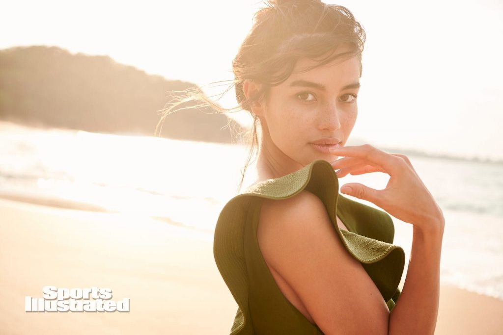 La modella filippino-americana Kelsey Merritt mostra un po’ di sotto-seno, scollatura e il suo corpo snello in bikini sulla spiaggia in un nuovo servizio fotografico per Sports Illustrated Swimsuit 2020.
