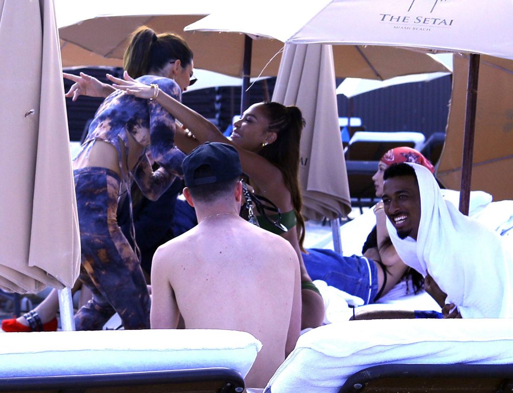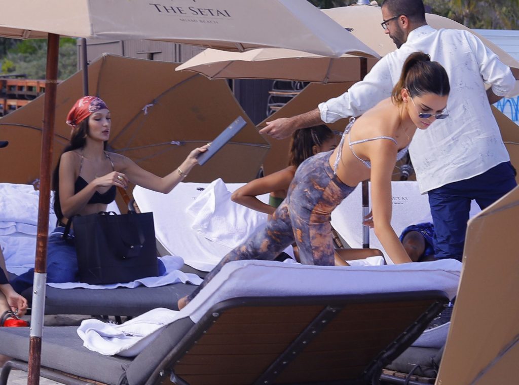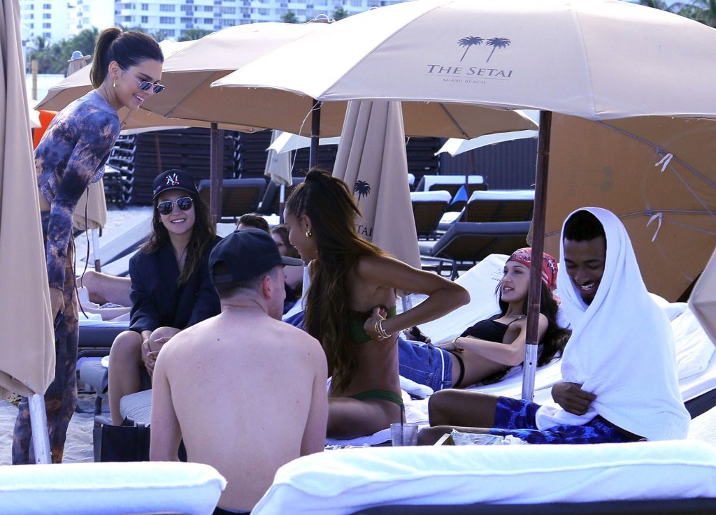 Kendall Jenner si siede sopra Bella Hadid mentre trascorrono insieme una giornata in spiaggia durante Art Basel a Miami, mostrando i loro corpi tonici in bikini, 12/04/2019.