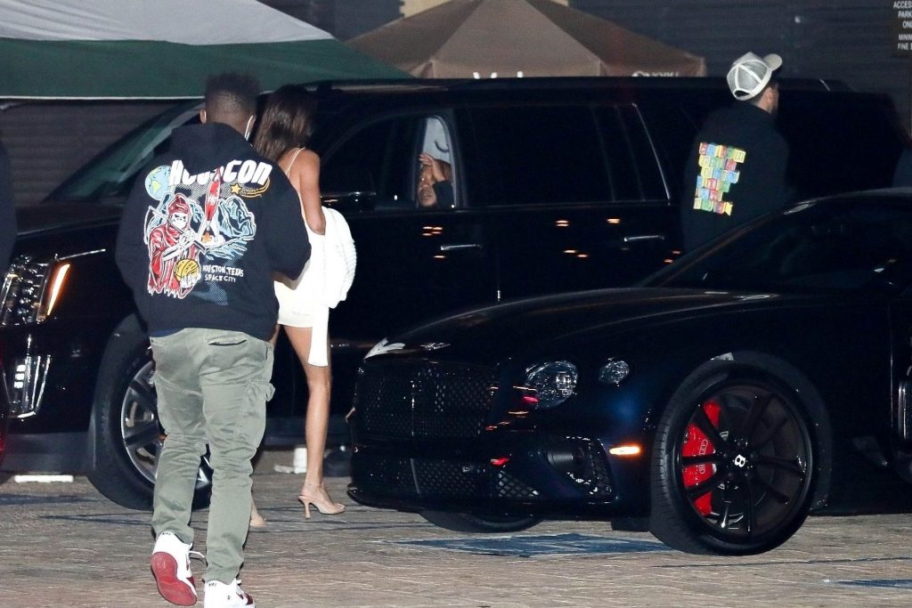Model Kendall Jenner mostra gambe lunghe con un semplice mini abito bianco sporco e décolleté mentre arriva al Nobu con il “flirt” Devin Booker a Malibu, 15/08/2020.