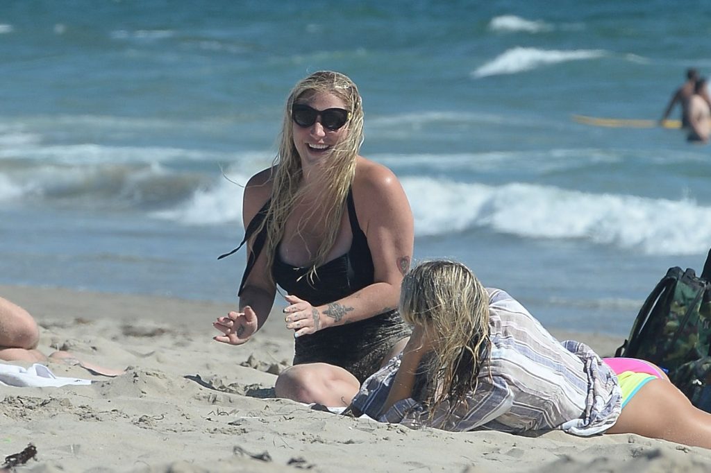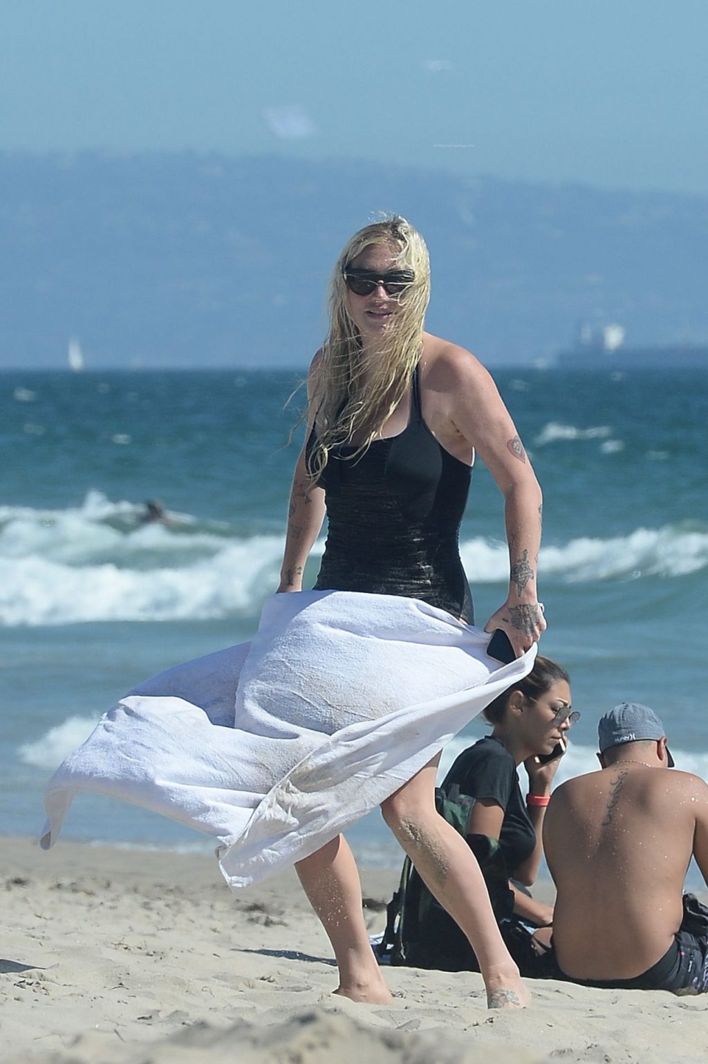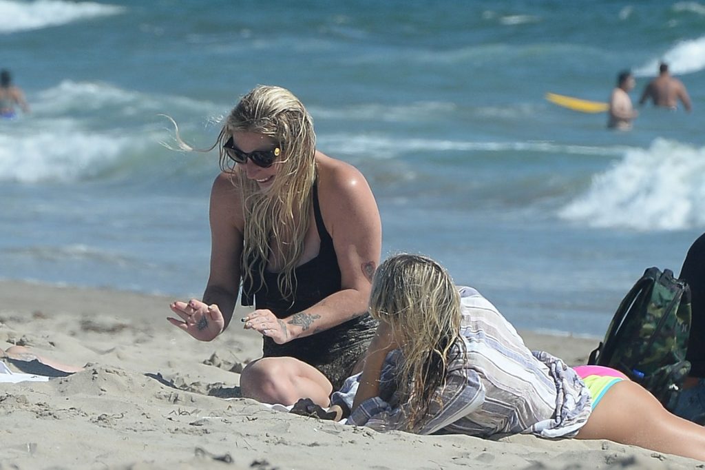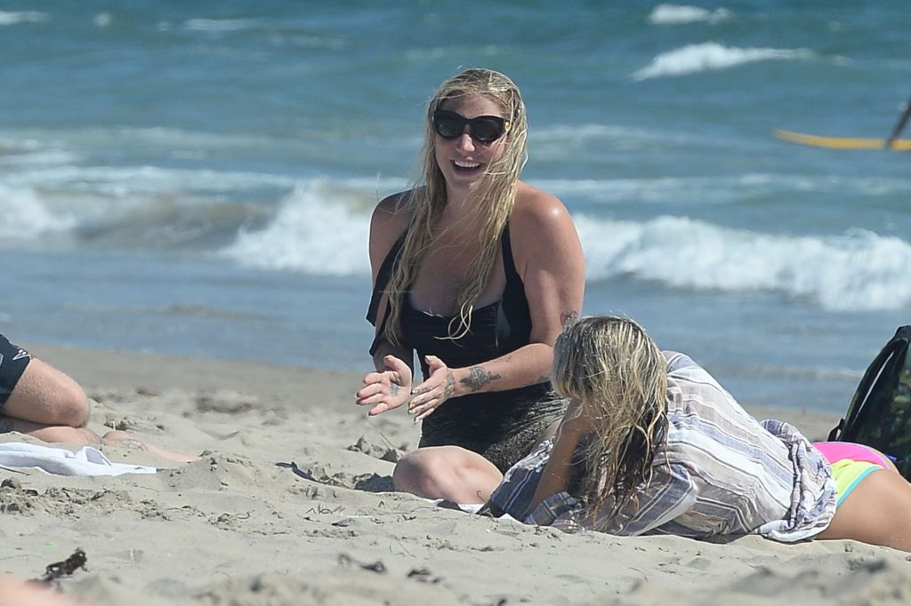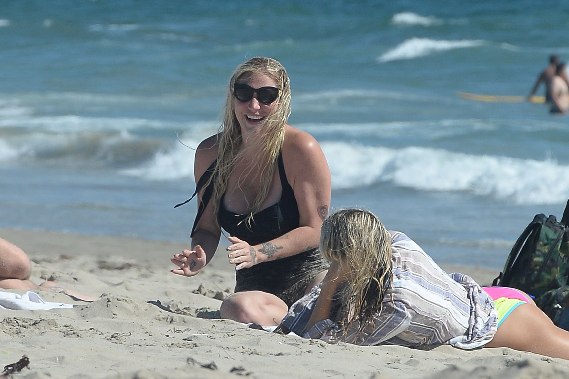 Kesha si gode la spiaggia con amici a Los Angeles, 08/02/2021. La cantante procace di 34 anni si è rinfrescata con un tuffo nell’oceano indossando un costume intero nero.