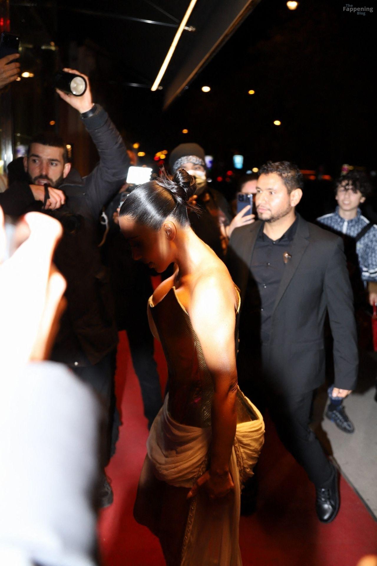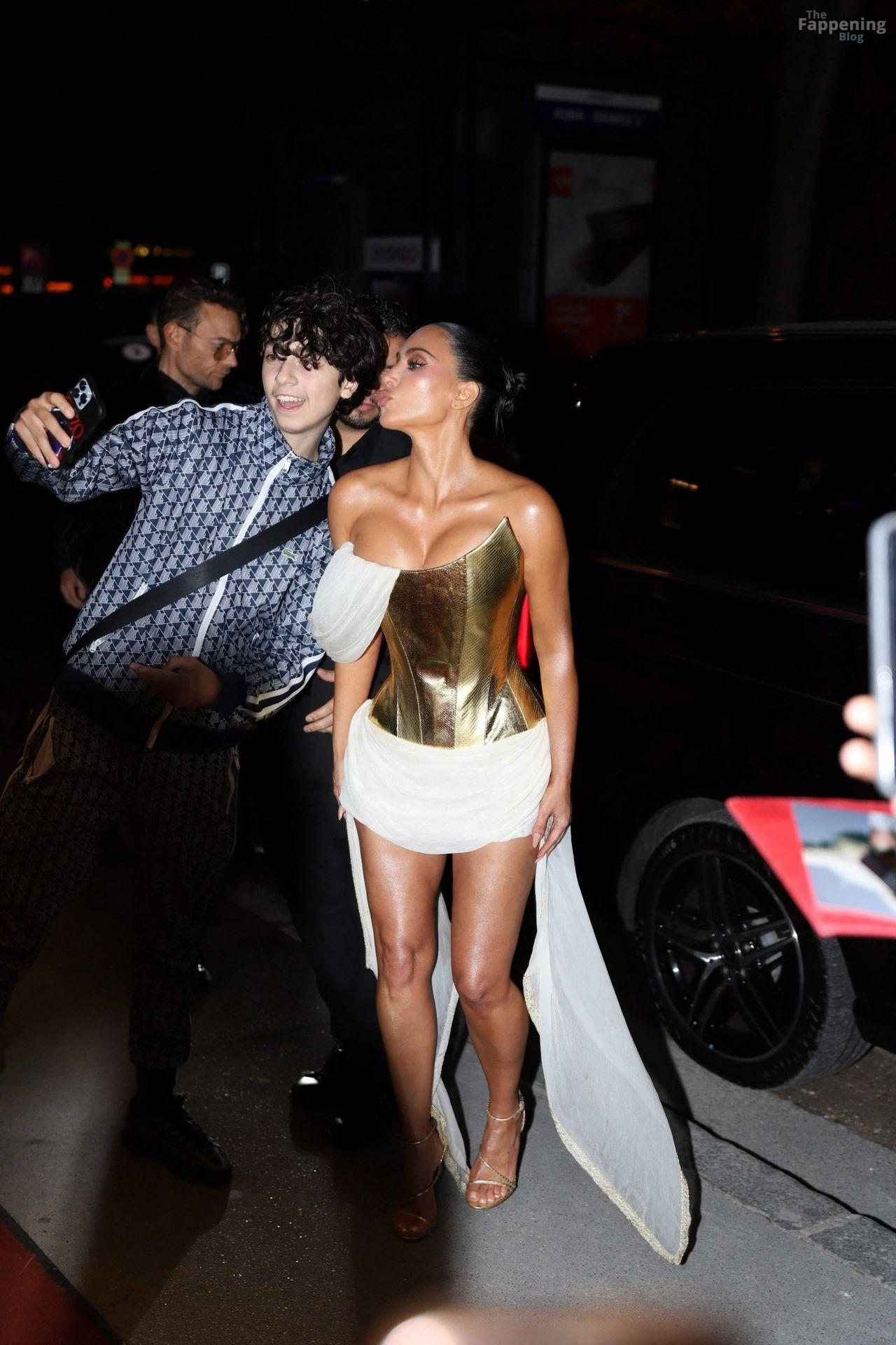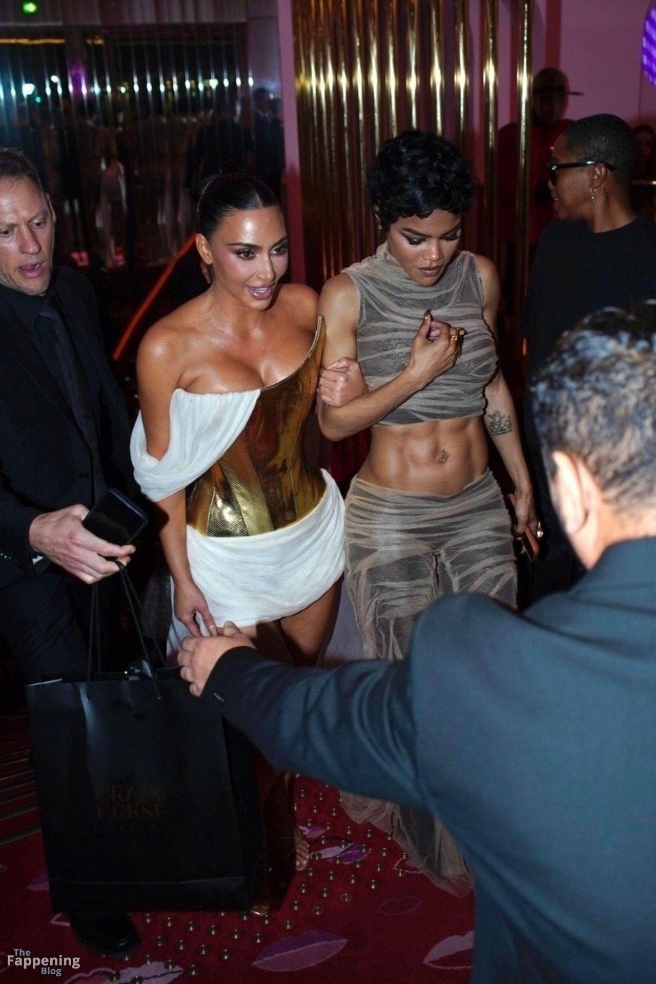 Kim Kardashian si è presentata al Crazy Horse di Parigi per la sua festa di compleanno numero 45 dopo la prima della sua serie Disney+ All’s Fair. Indossava un abito corsetto dorato che faceva uscire i suoi enormi seni con uno scollo pazzesco, abbinato a una gonna con spacco alto che mostrava il suo corpo e le gambe.