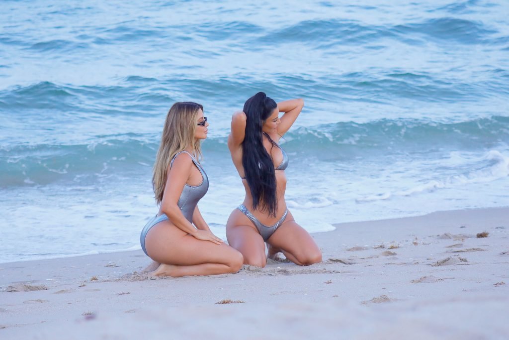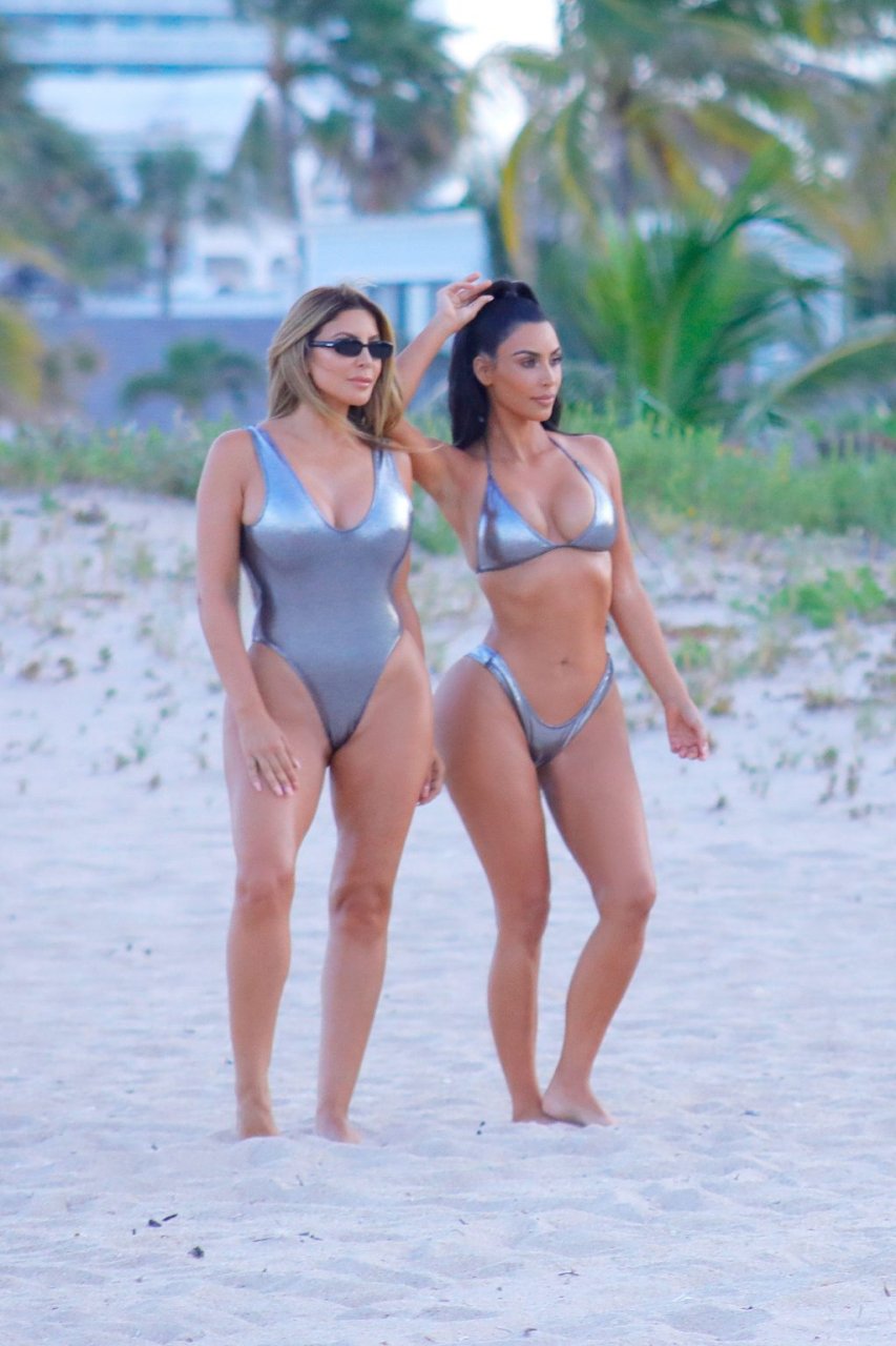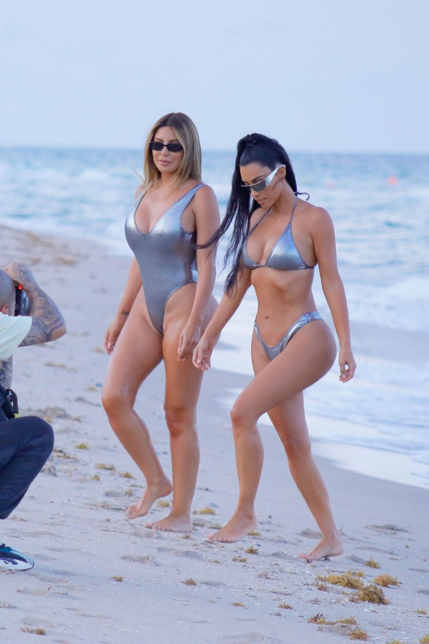 Amiche formose Kim Kardashian & Larsa Pippen si godono una giornata indossando bikini/costumi da bagno argentati abbinati durante un servizio fotografico a Miami, 18/08/2018.