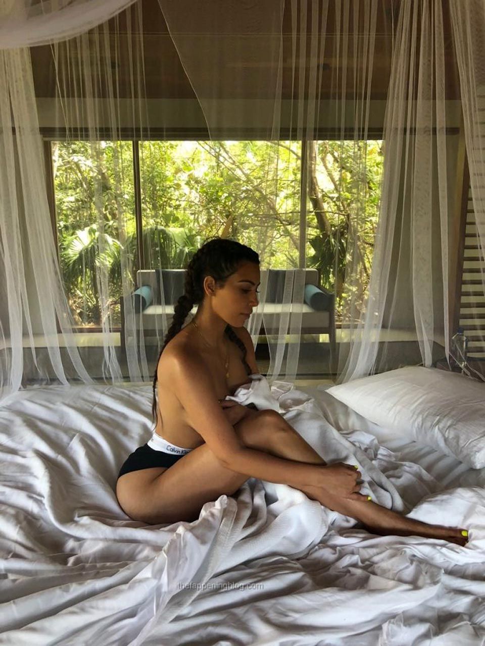 Kim Kardashian, the reality star and starlet, is looking good! She is showing us her body completely nude! We can see her ass and tits clearly, but her pussy, well, we have to sharpen our eyes to see under those transparent panties. Other than that, she is stunning!