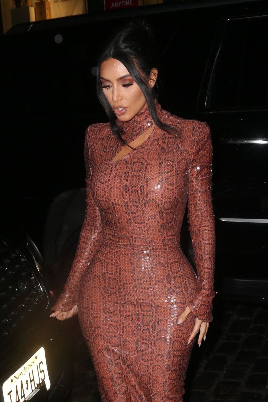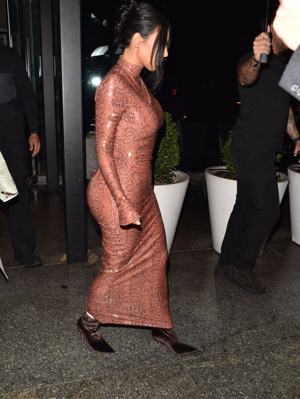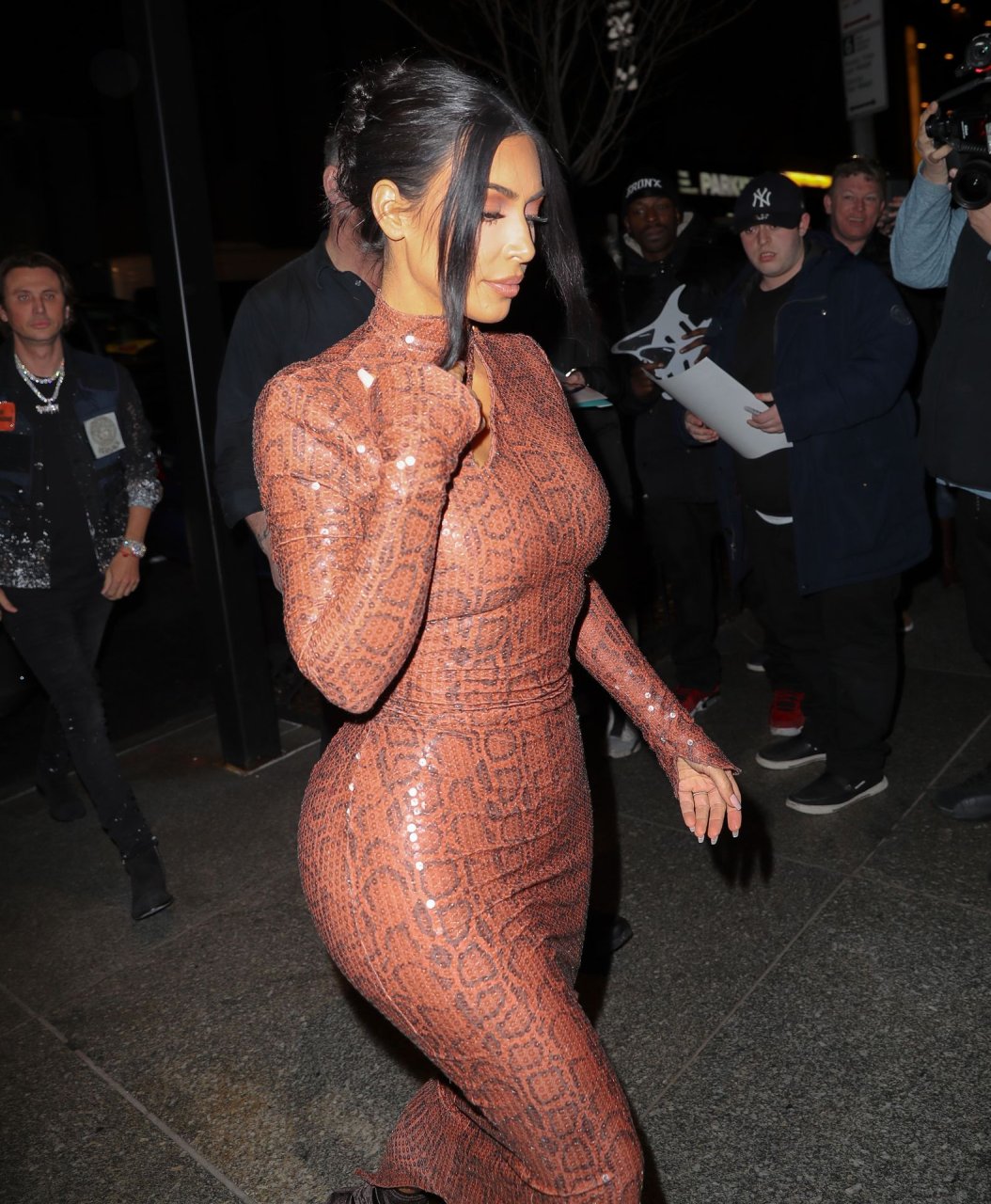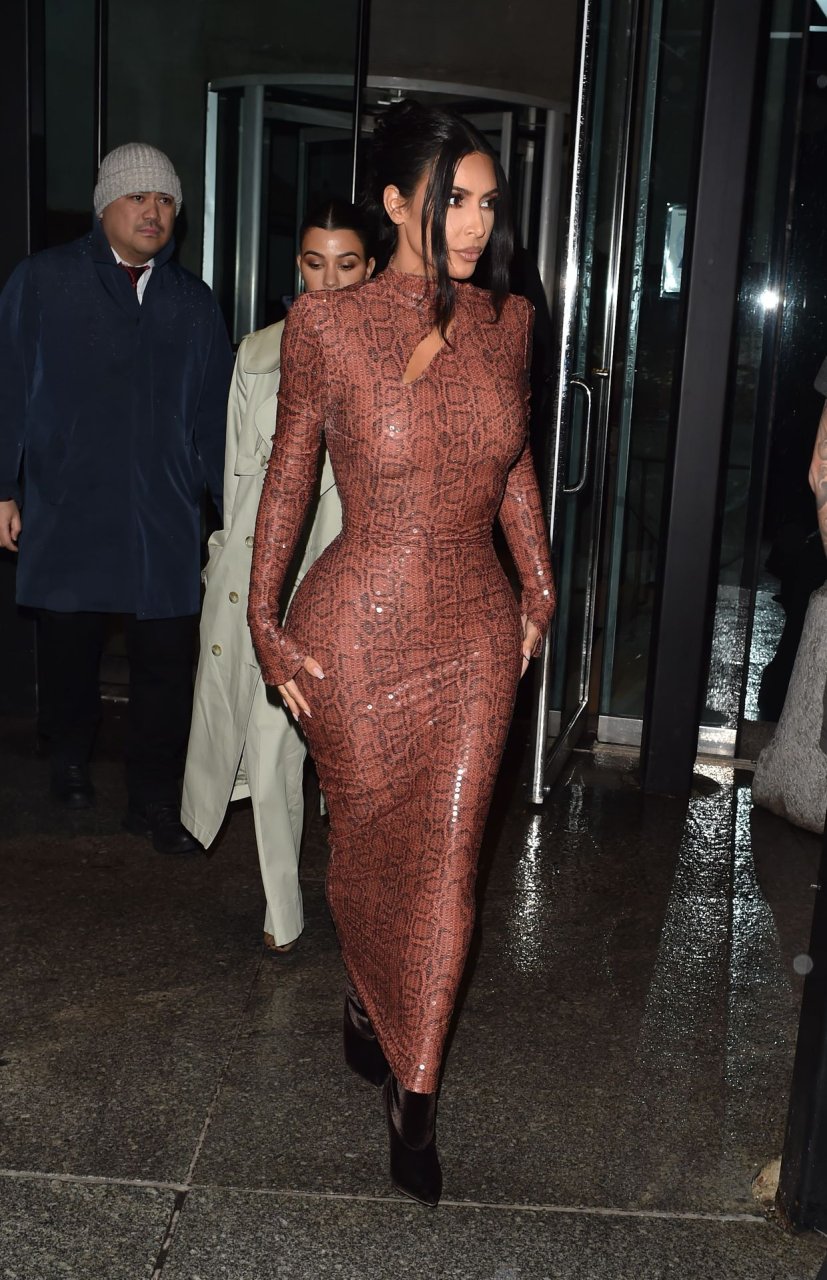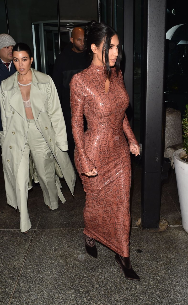 La star della TV reality Kim Kardashian arriva a cena con un aderente abito a “serpente” insieme a sua sorella al Milos di New York, 02/07/2019.