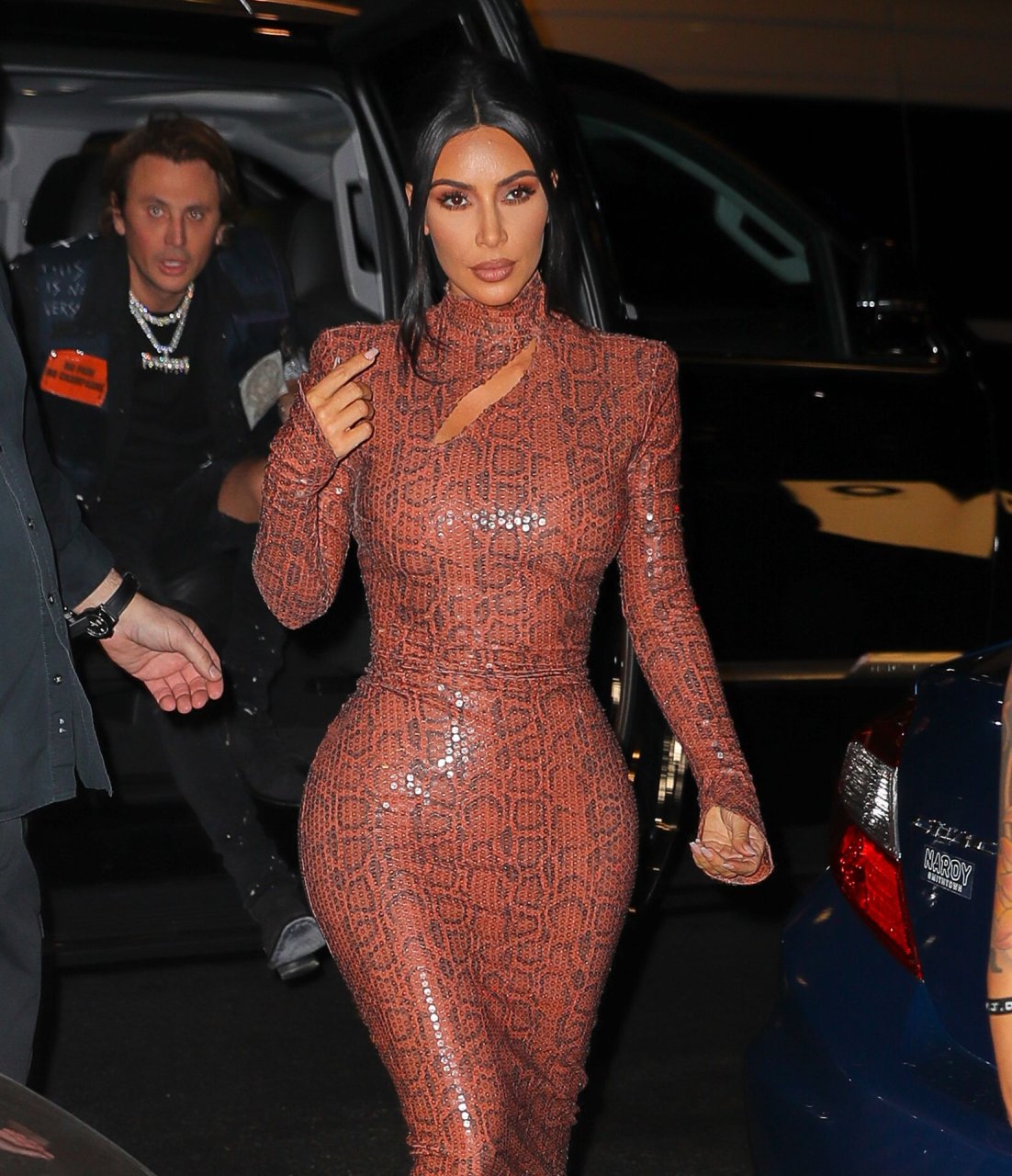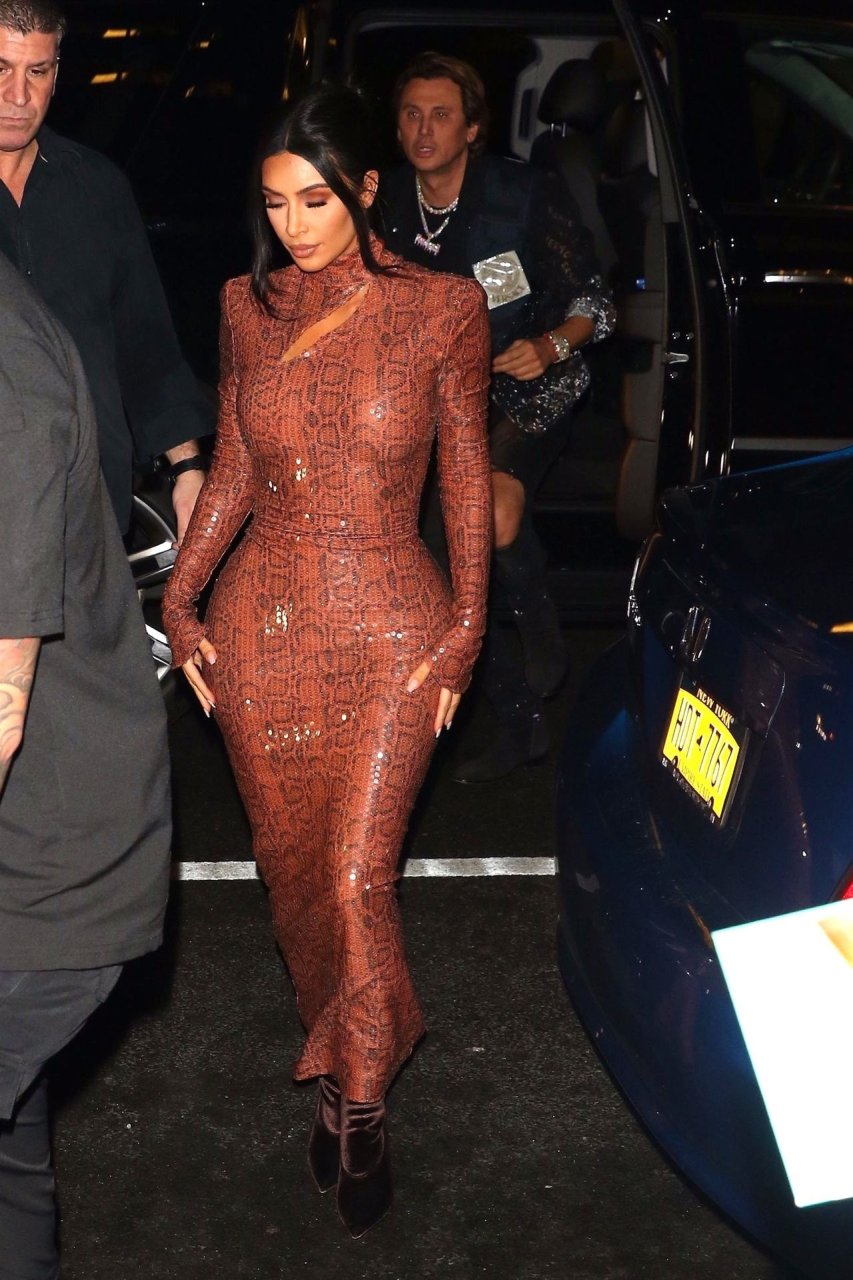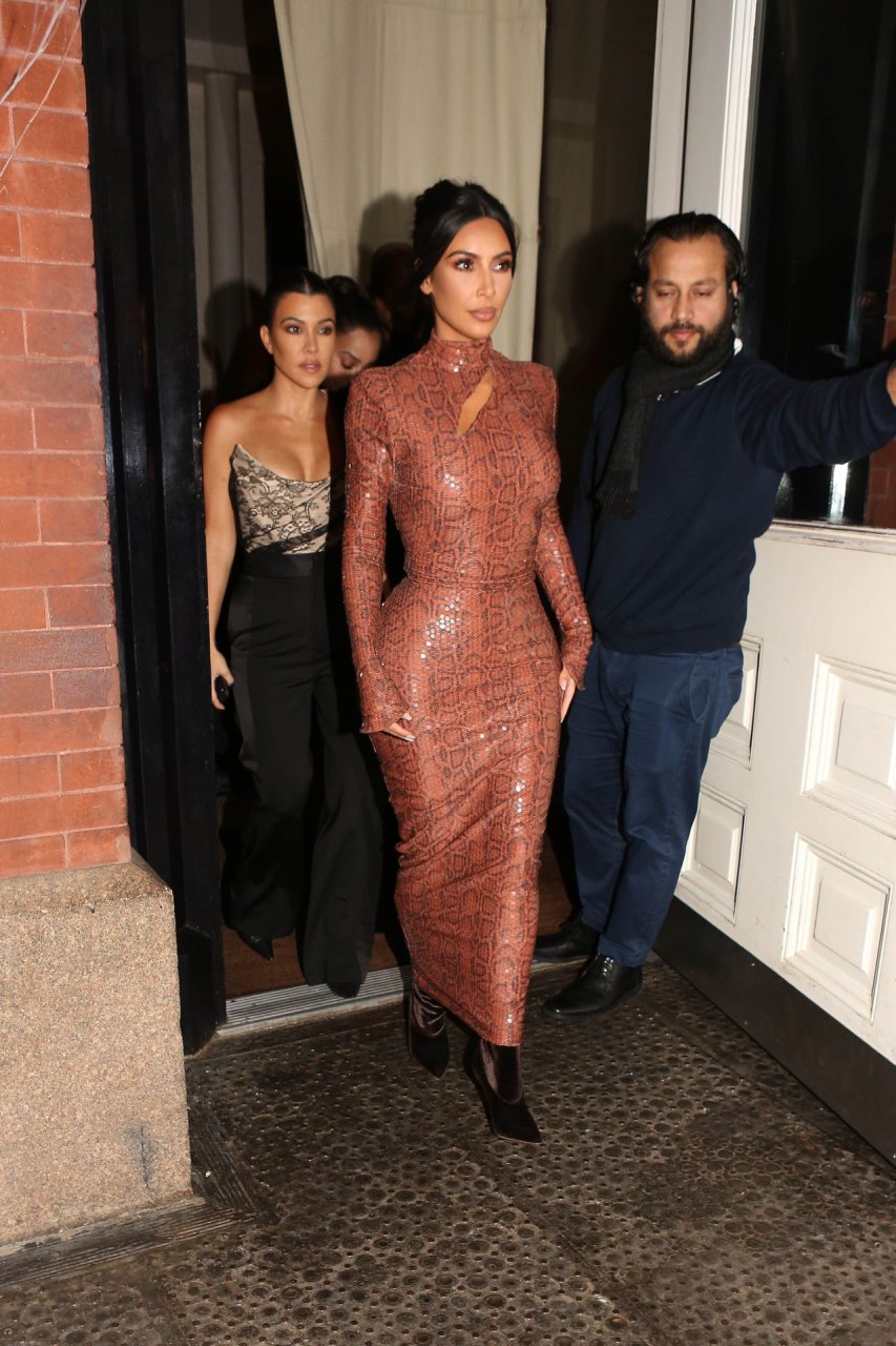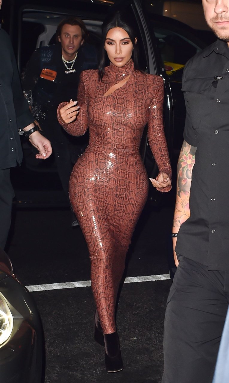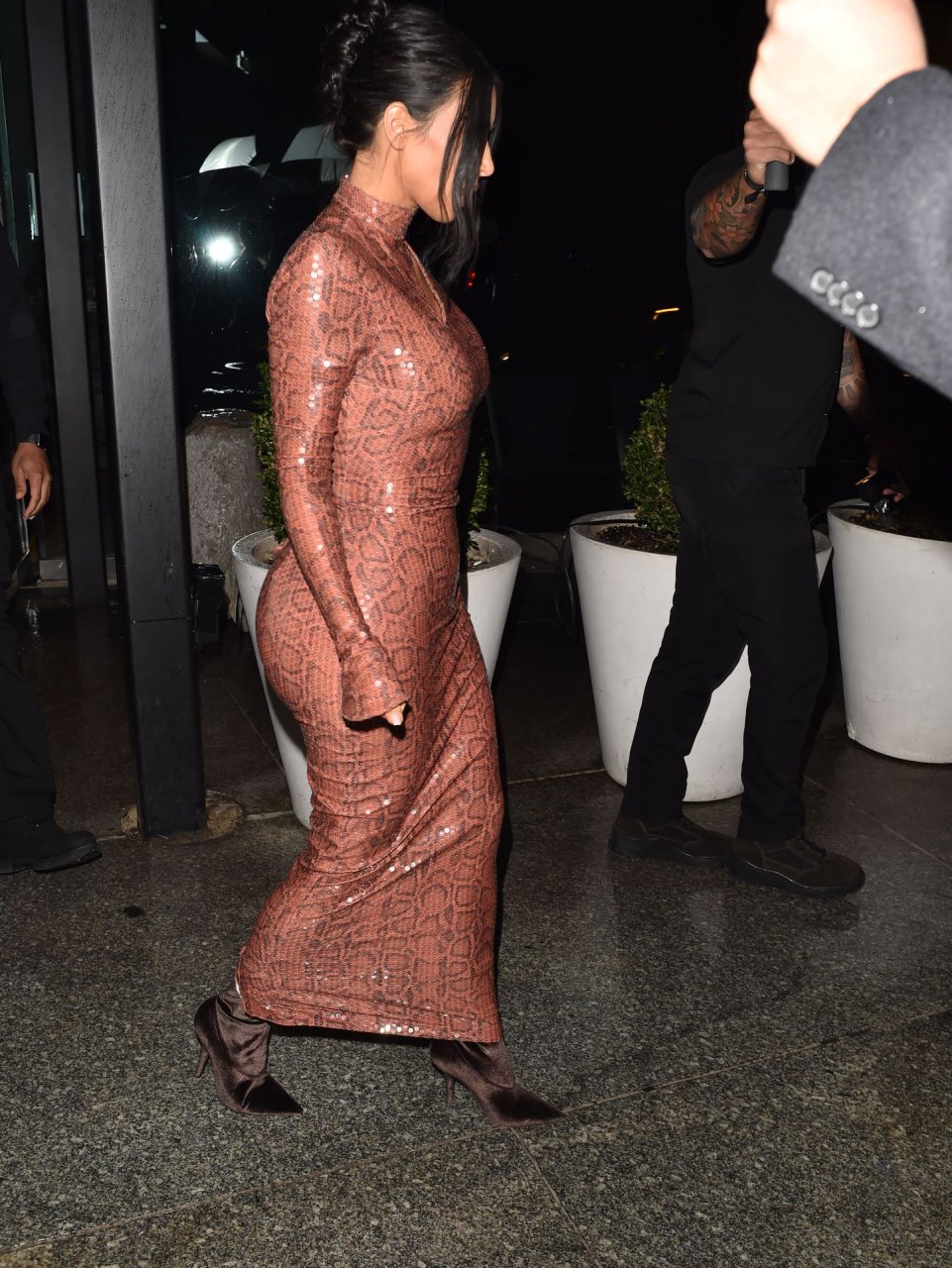 La star della TV reality Kim Kardashian arriva a cena con un aderente abito a “serpente” insieme a sua sorella al Milos di New York, 02/07/2019.