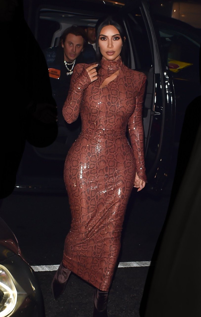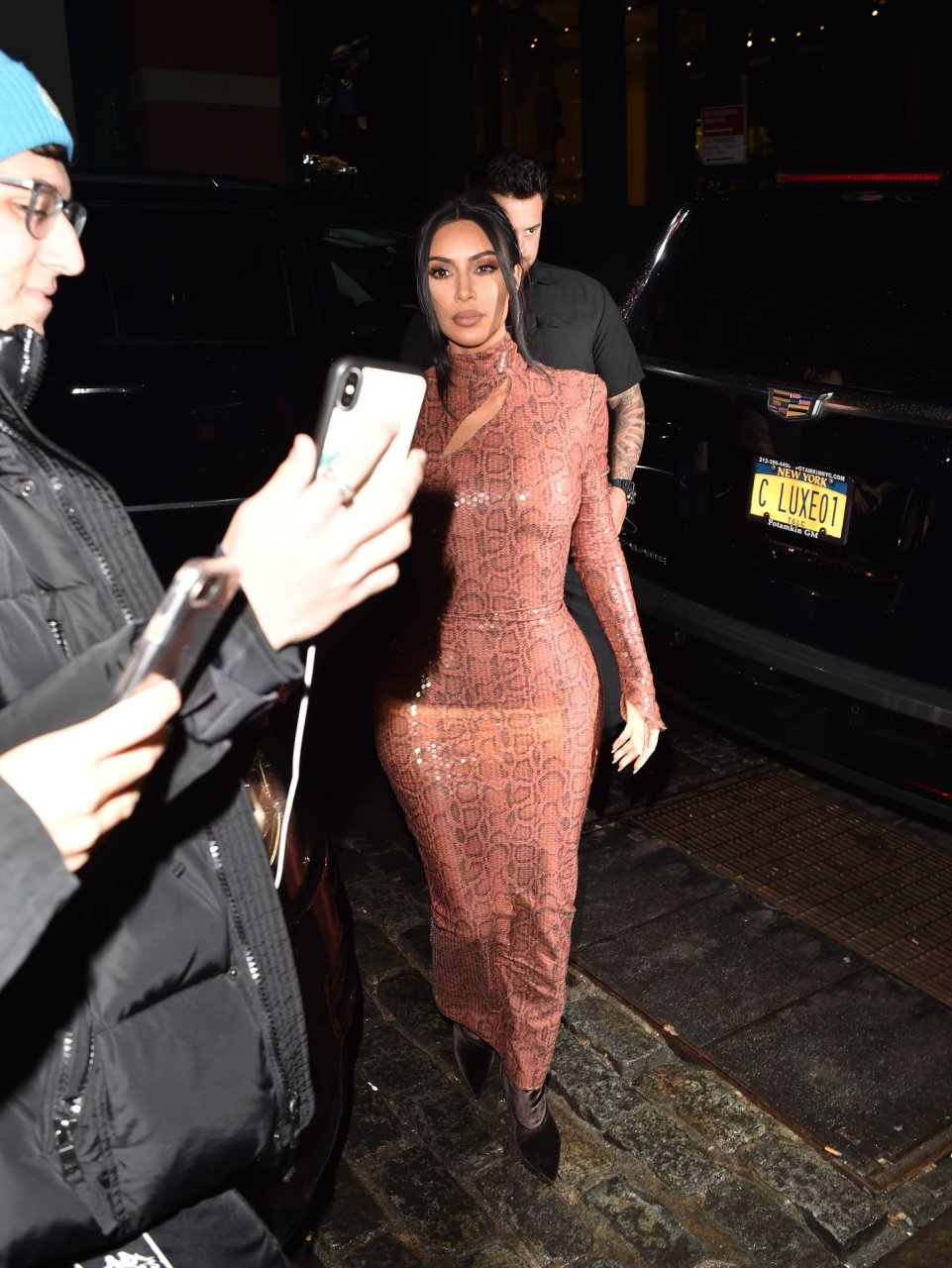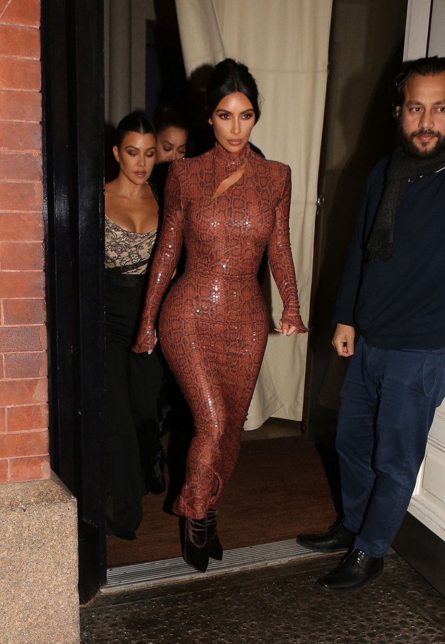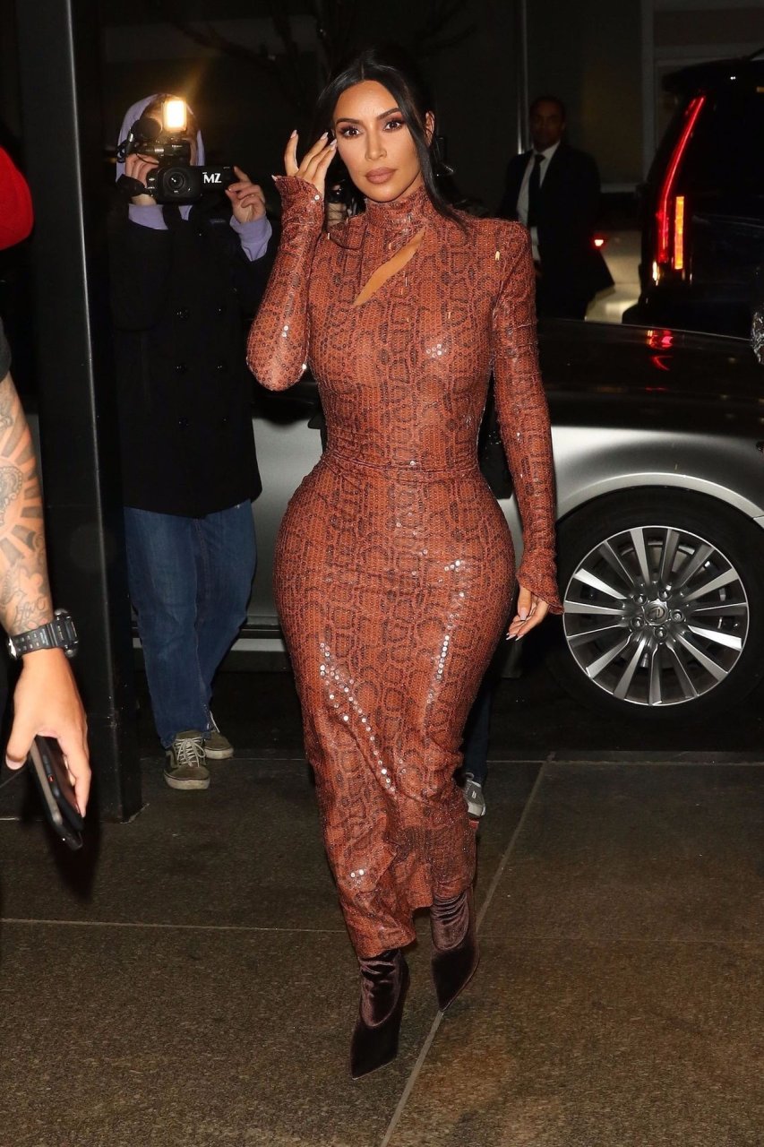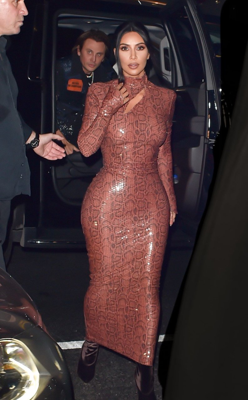 La star della TV reality Kim Kardashian arriva a cena con un aderente abito a “serpente” insieme a sua sorella al Milos di New York, 02/07/2019.