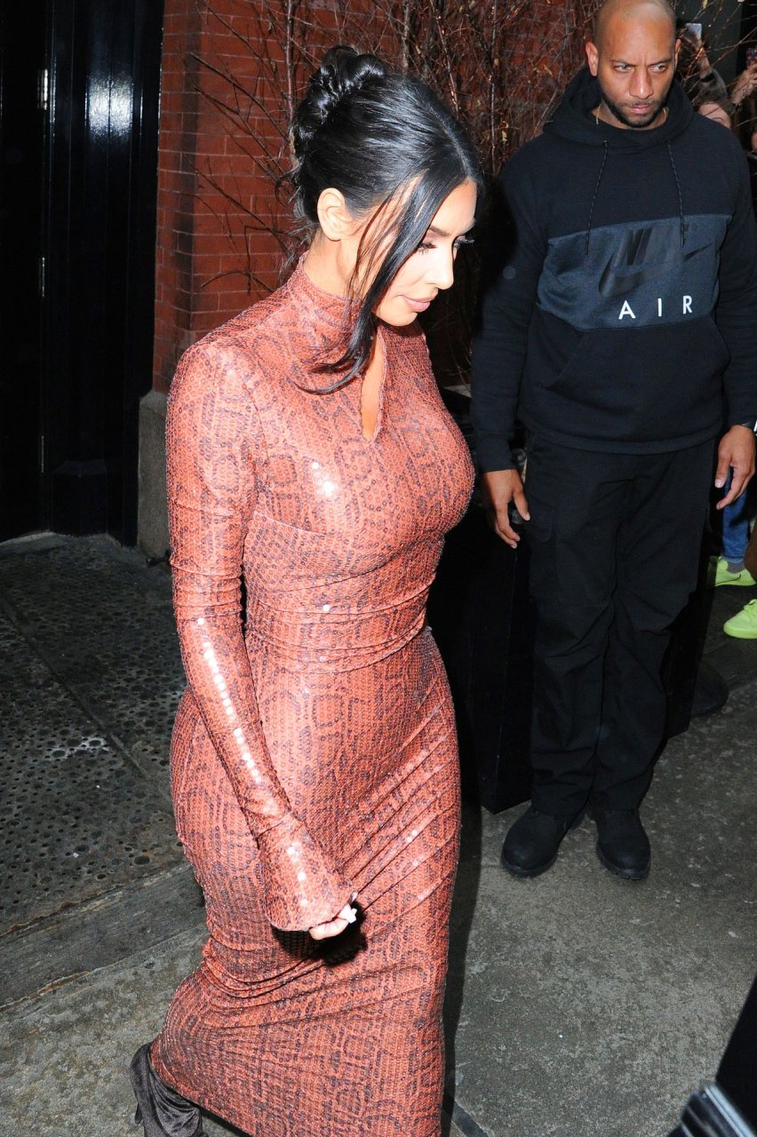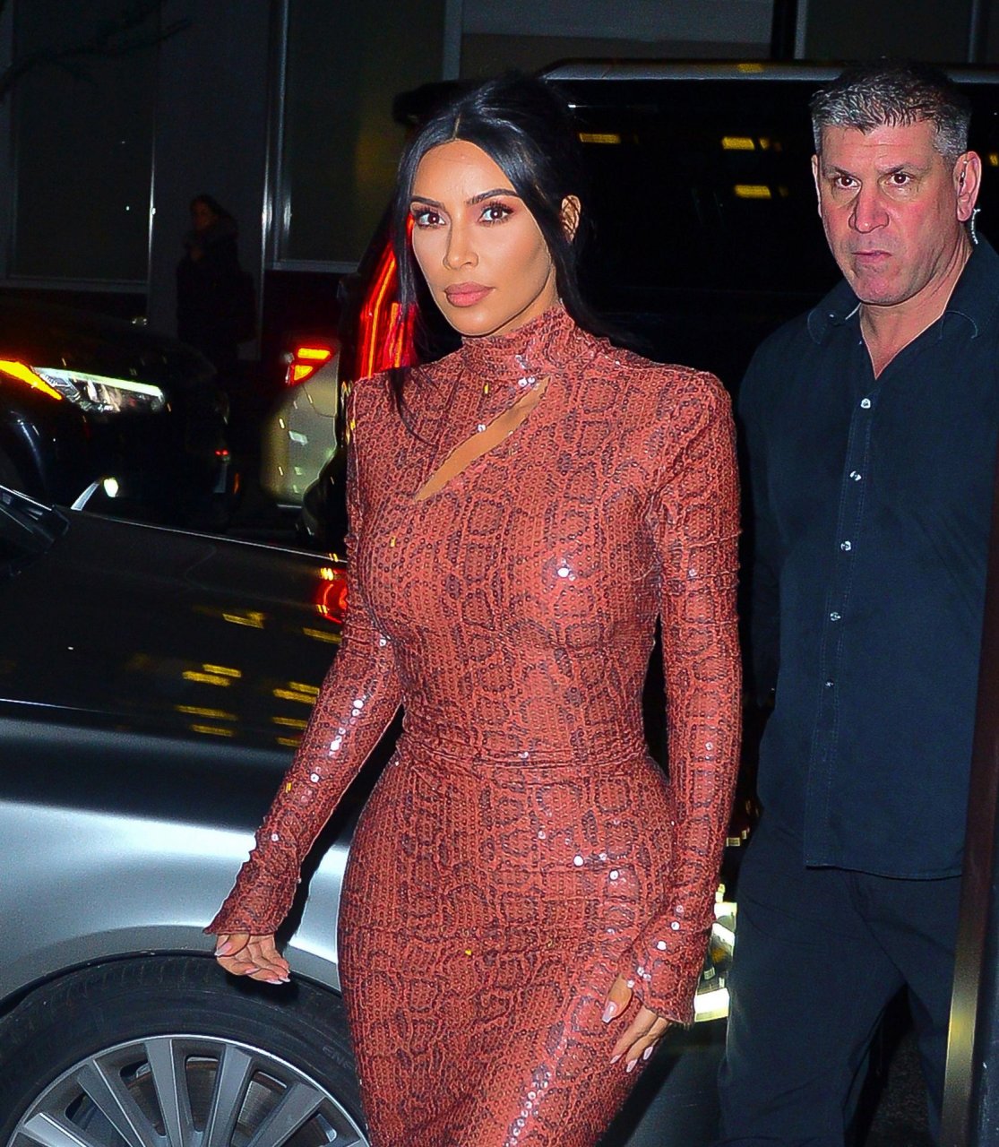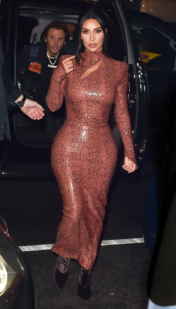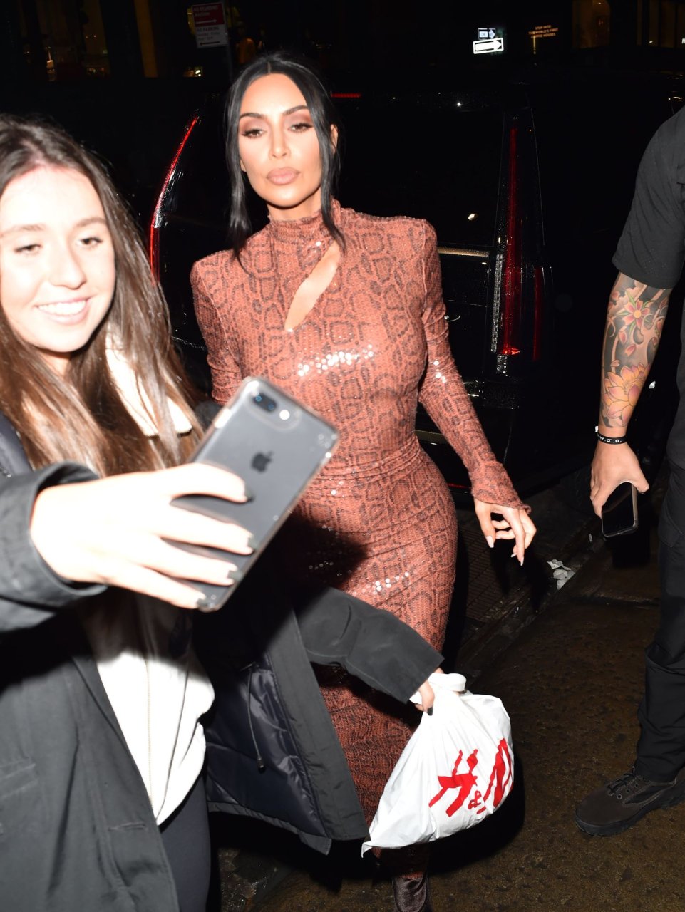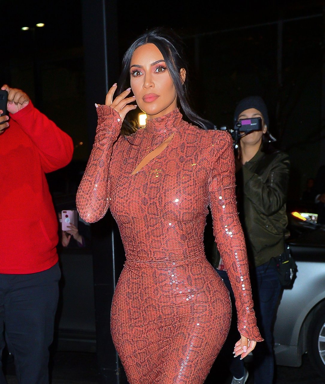 La star della TV reality Kim Kardashian arriva a cena con un aderente abito a “serpente” insieme a sua sorella al Milos di New York, 02/07/2019.