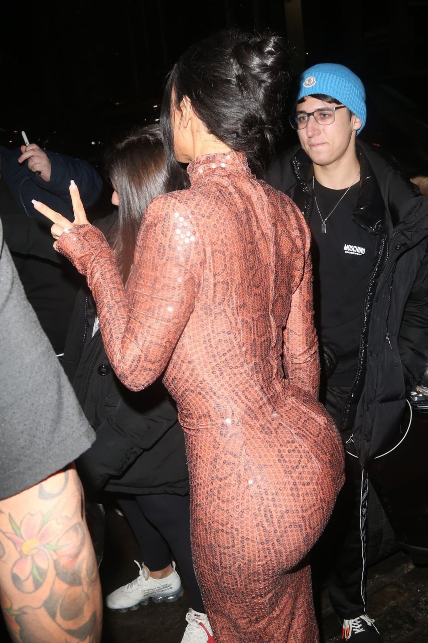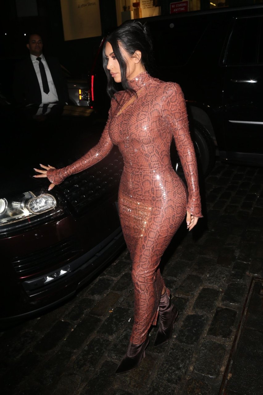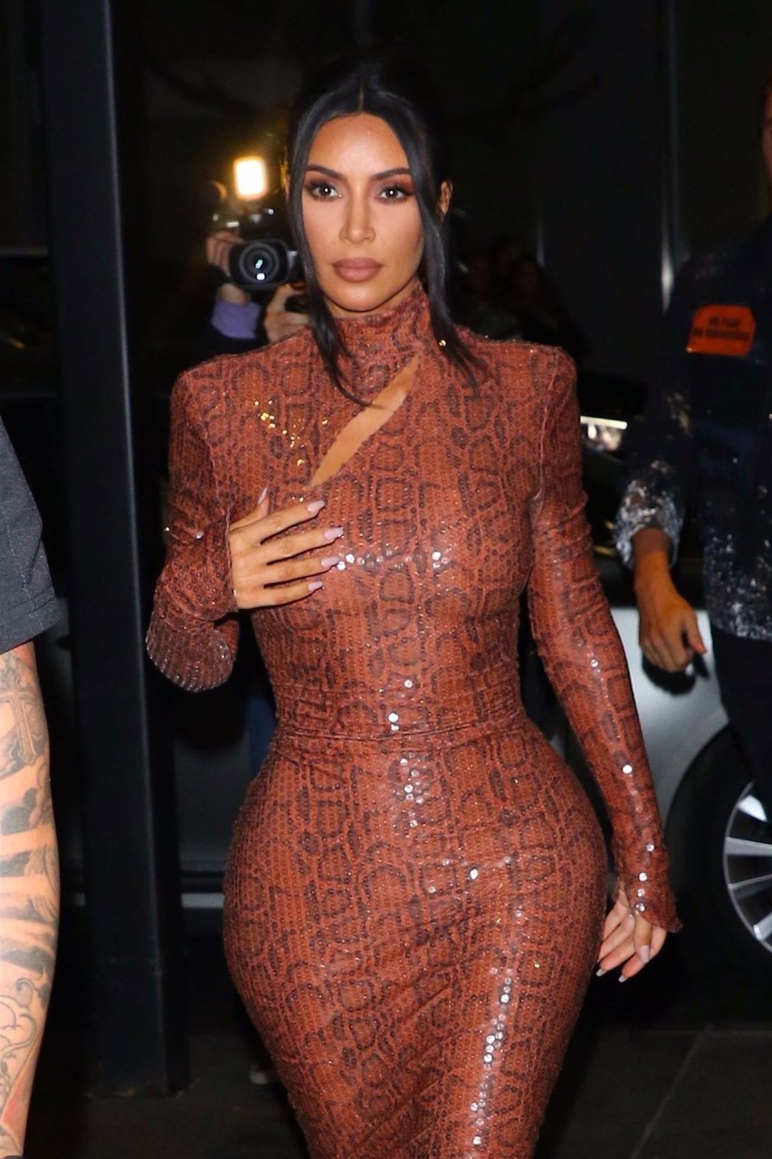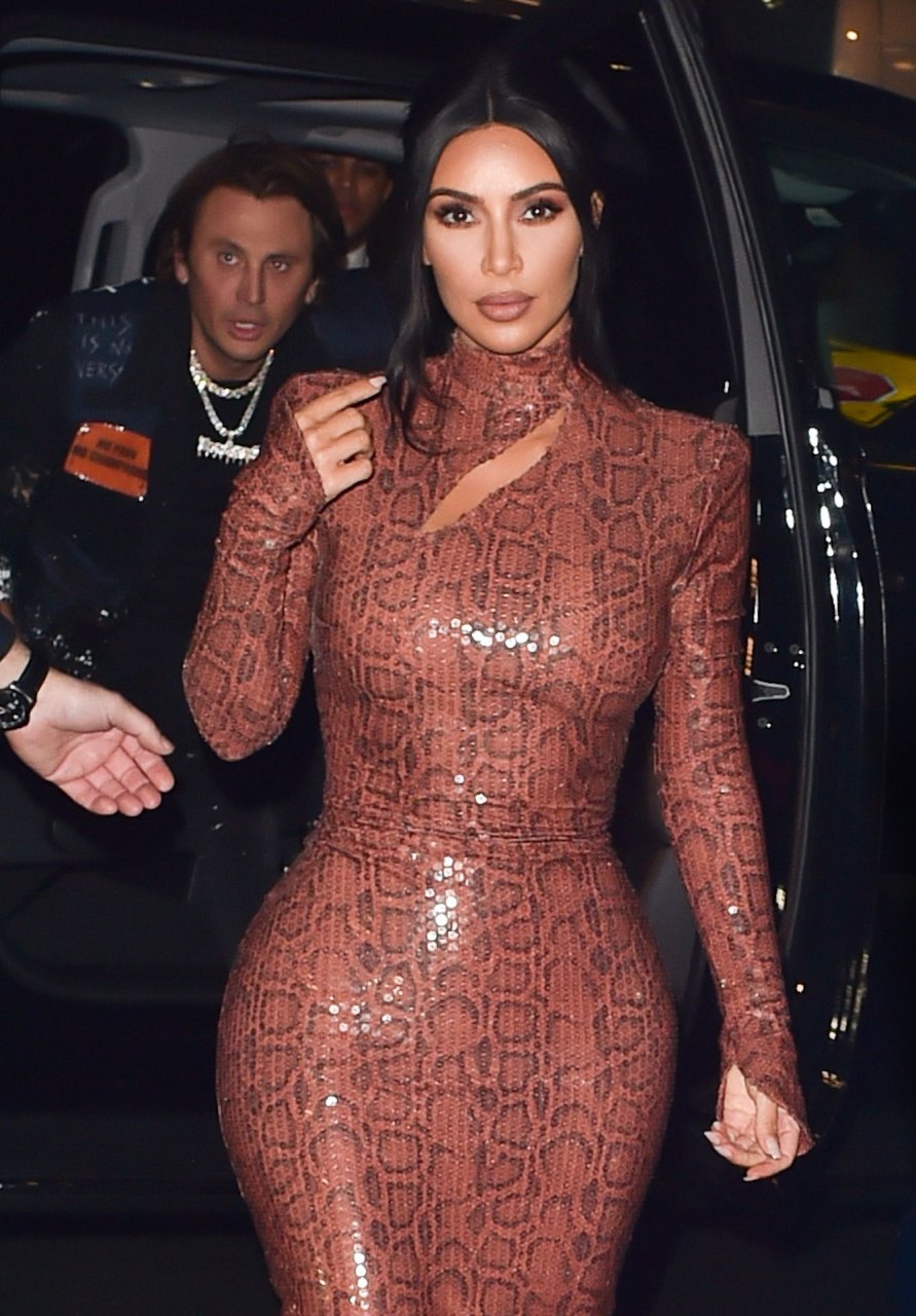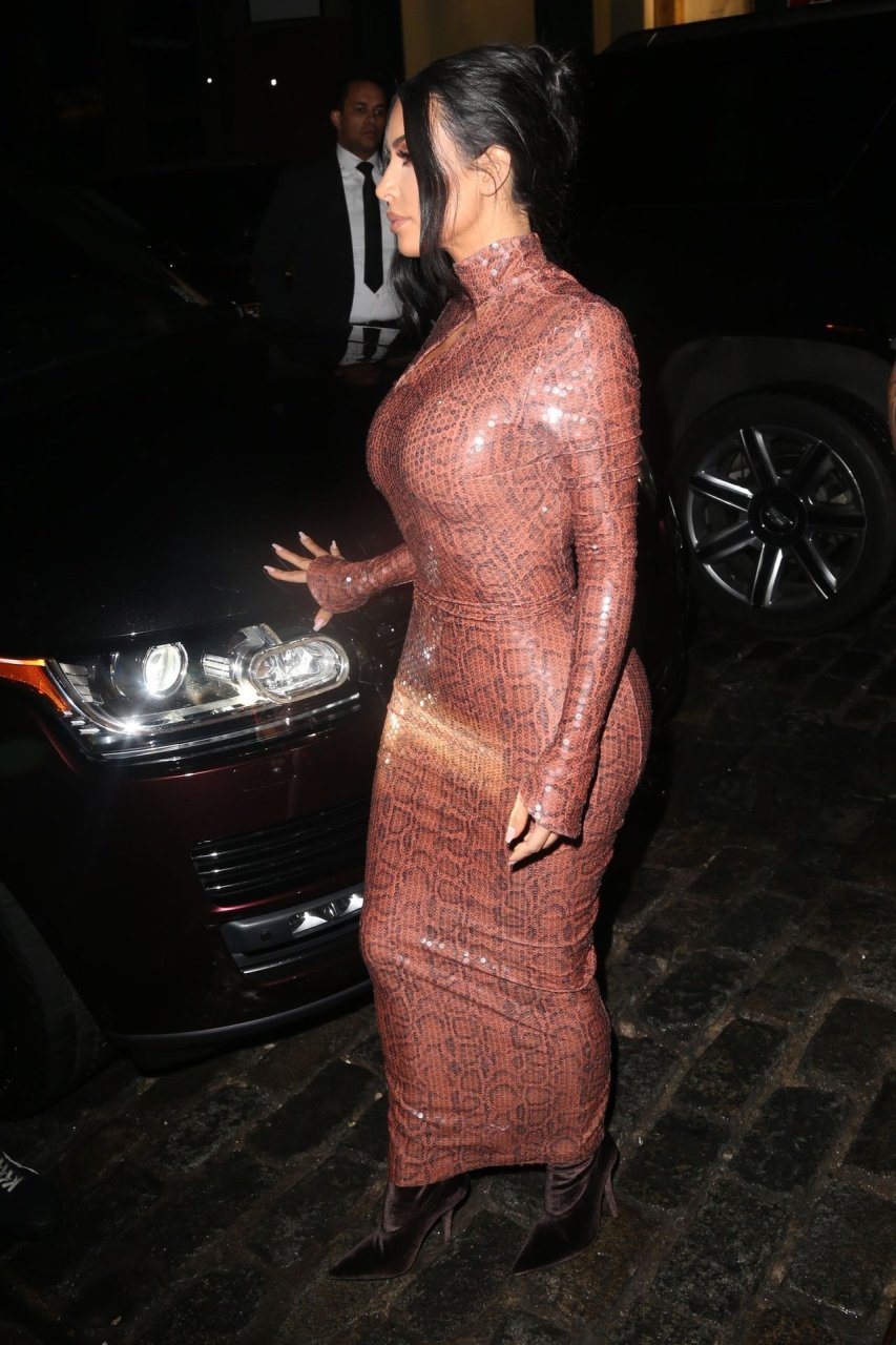 La star della TV reality Kim Kardashian arriva a cena con un aderente abito a “serpente” insieme a sua sorella al Milos di New York, 02/07/2019.