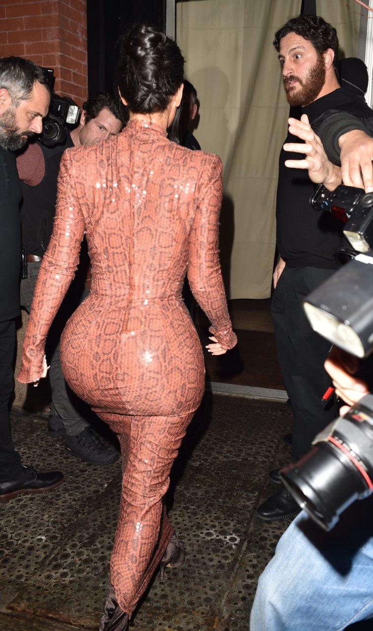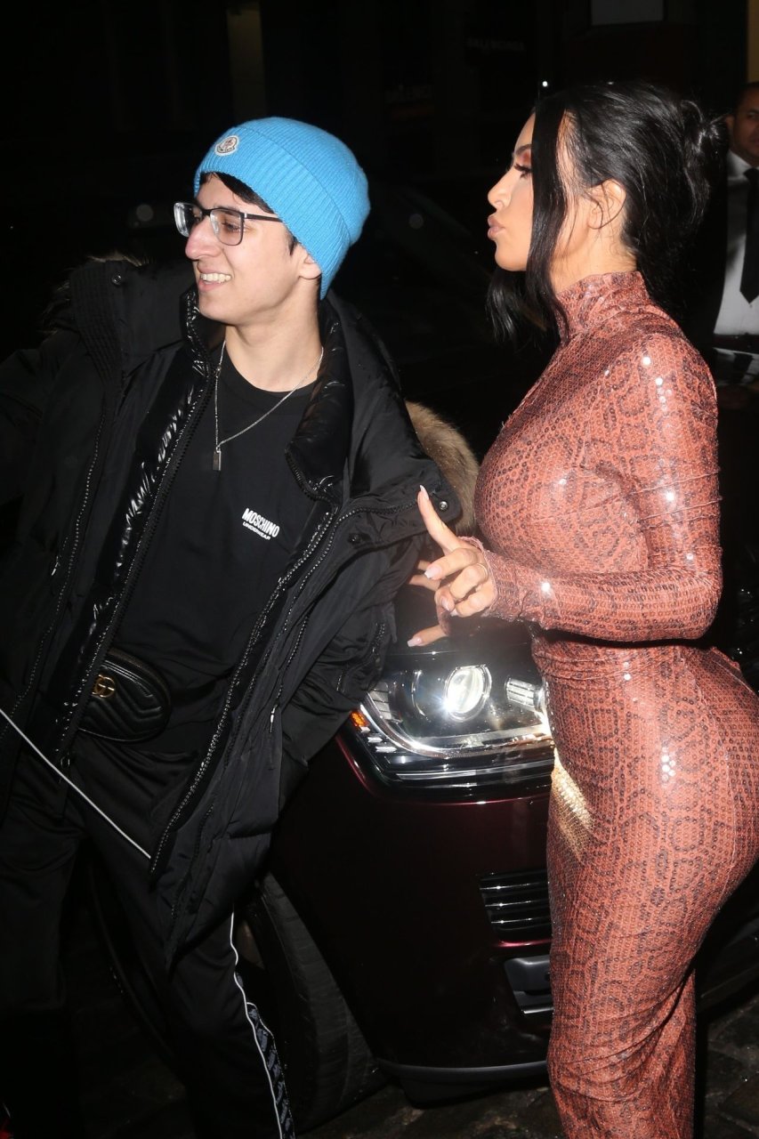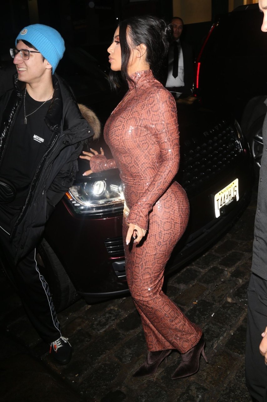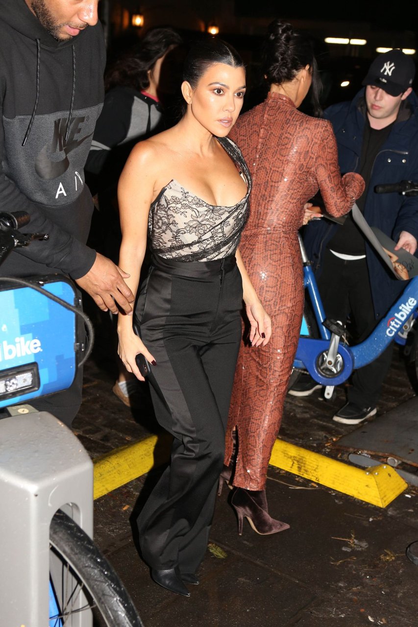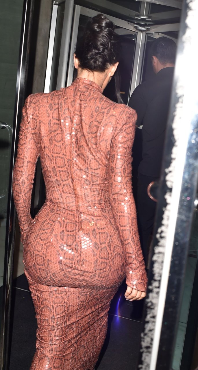 La star della TV reality Kim Kardashian arriva a cena con un aderente abito a “serpente” insieme a sua sorella al Milos di New York, 02/07/2019.