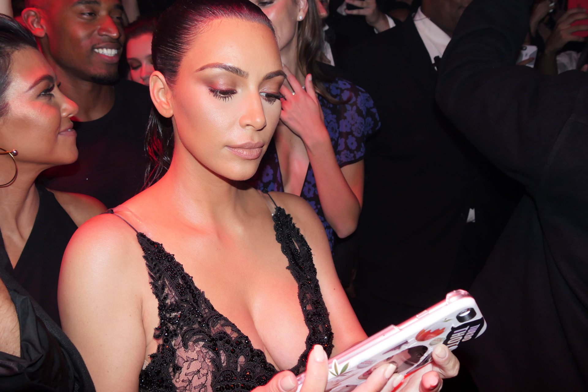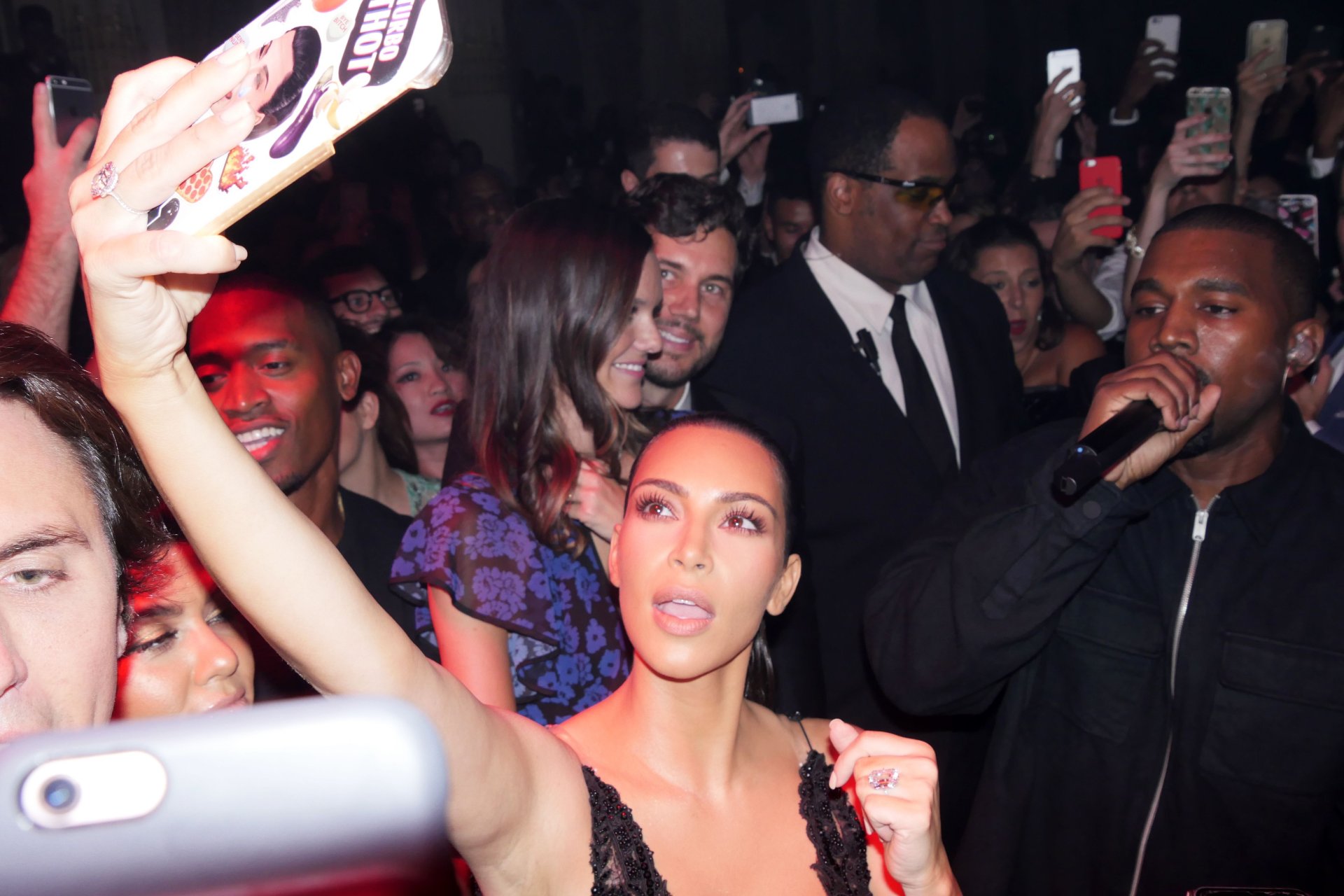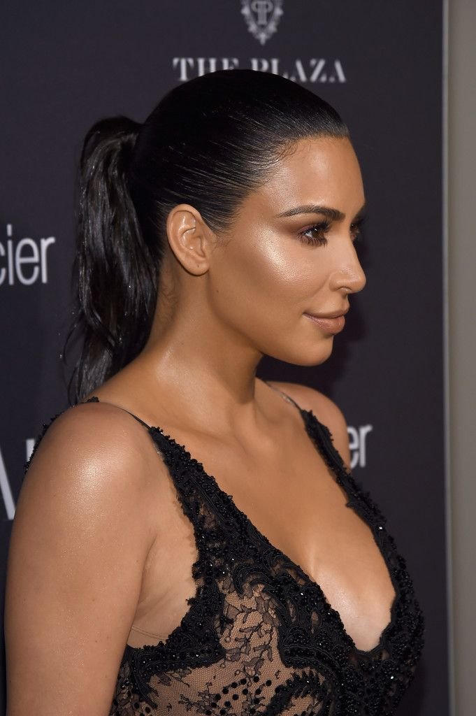 Kim Kardashian indossa un vestito nero in pizzo trasparente alla festa di Harper’s Bazar a New York, 09/09/2016. Kim Kardashian è una personalità televisiva e dei social media americana, socialite e modella. Età: 35 (21 ottobre 1980).