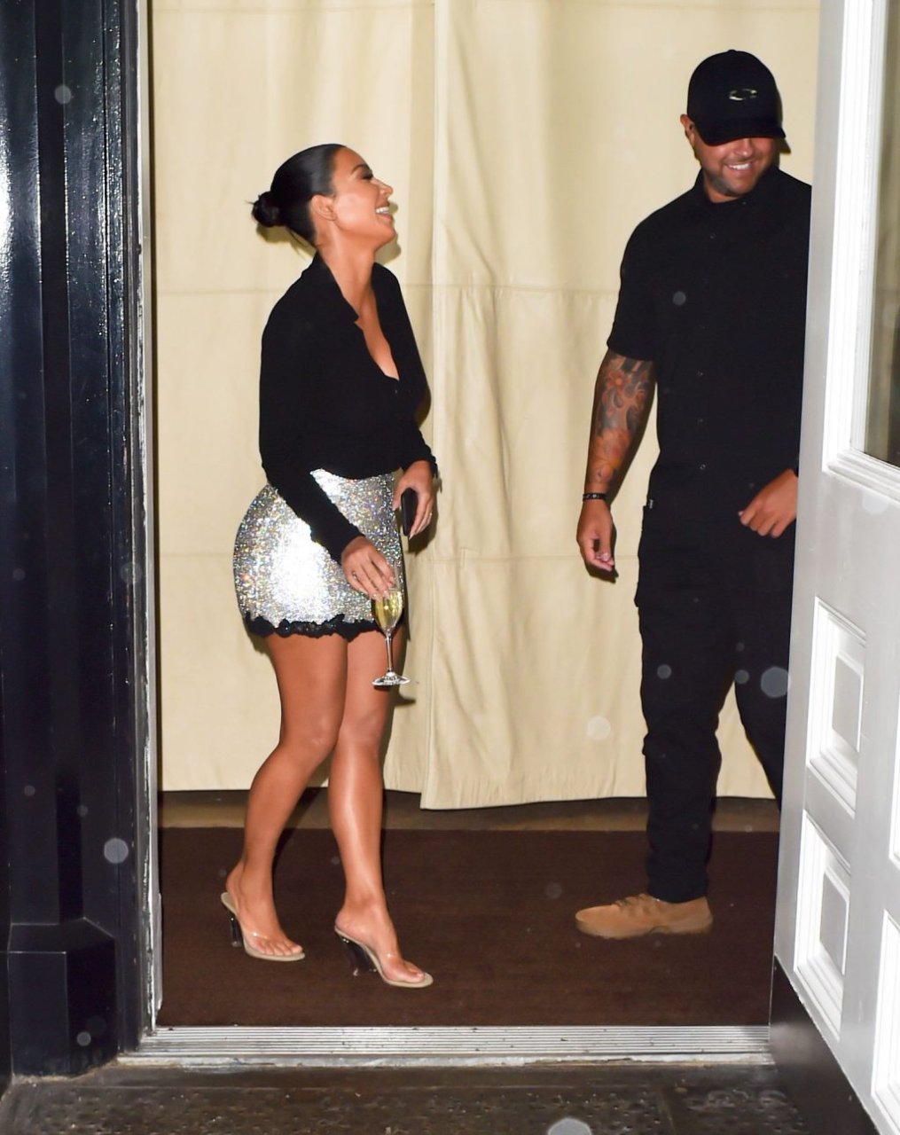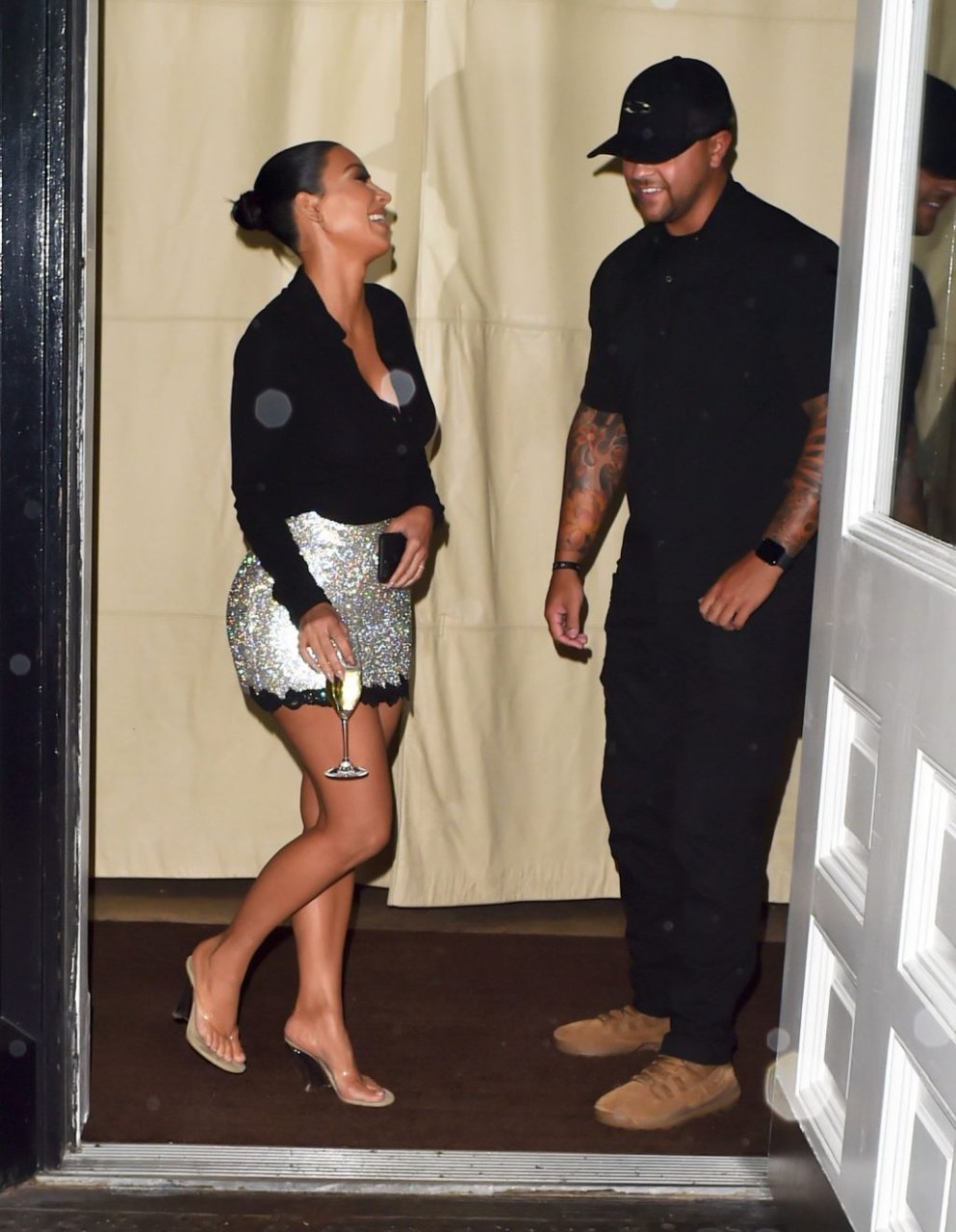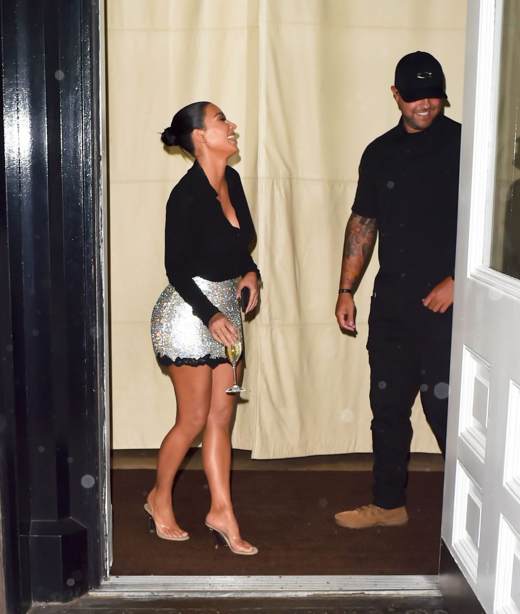 Kim Kardashian ride mentre tiene un bicchiere di Champagne all’hotel Mercer a New York, 12/09/2019.