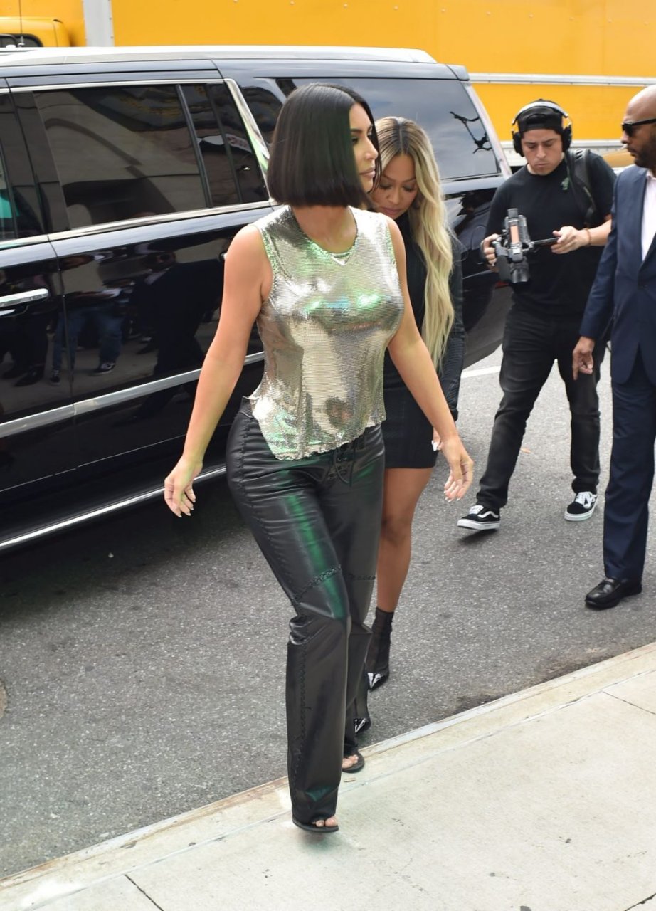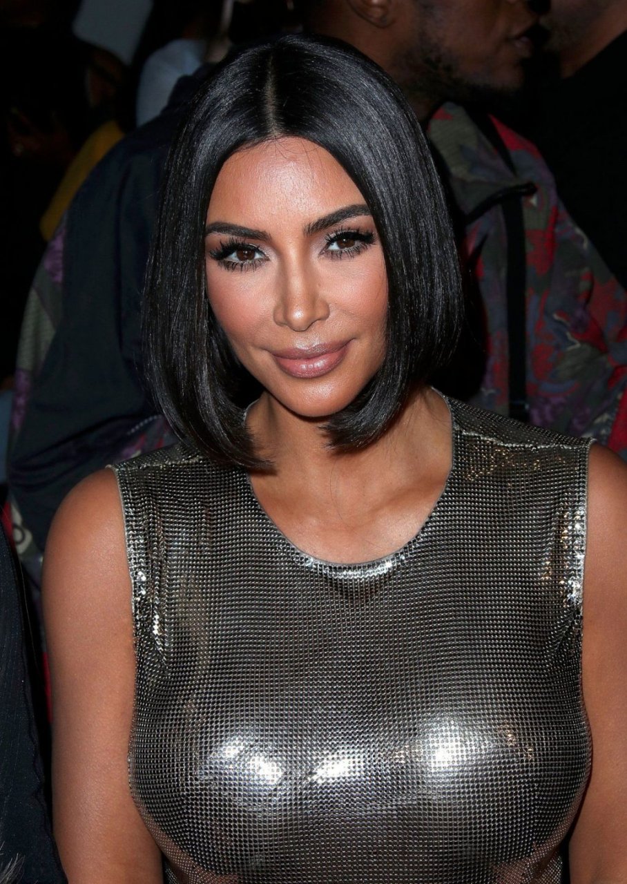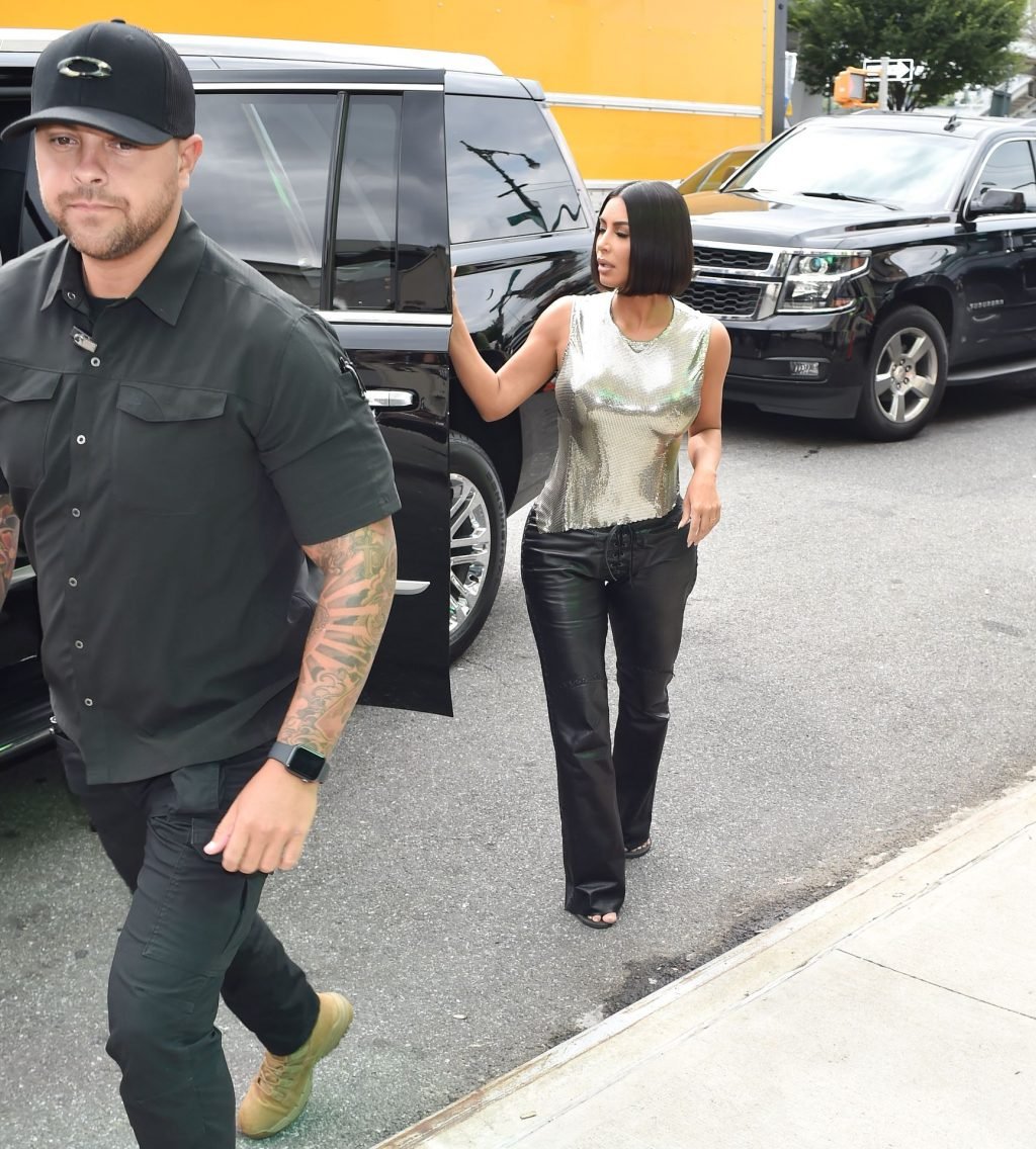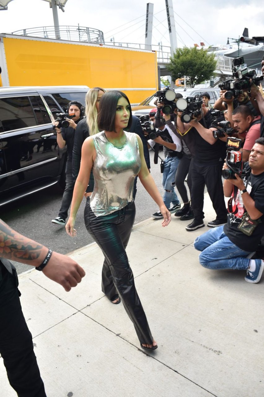 Curvy bruna Kim Kardashian arriva a una sfilata di moda a New York durante la New York Fashion Week, 10/09/2019. La star della realtà TV di 38 anni con un seno prosperoso ha scelto per l’evento una camicetta metallica trasparente.