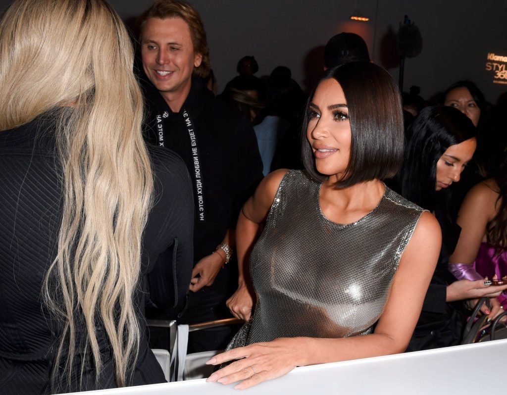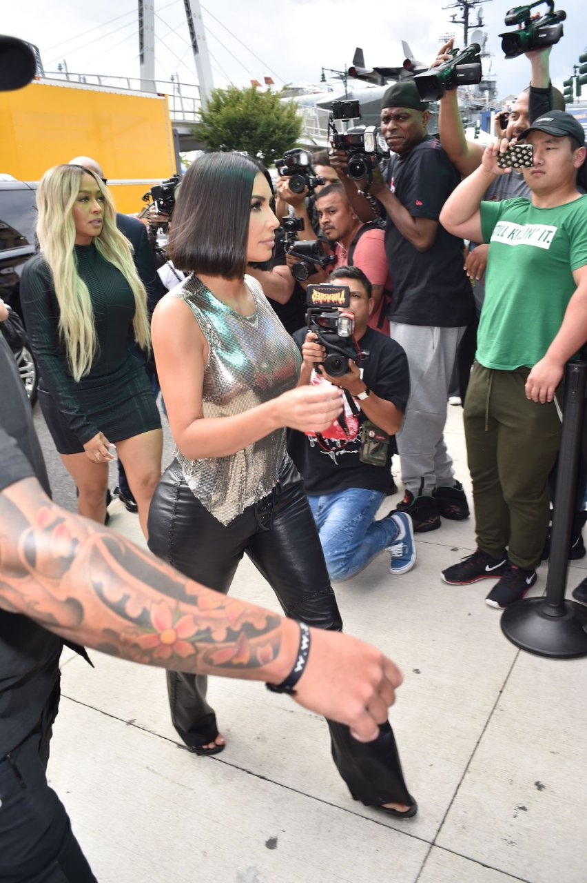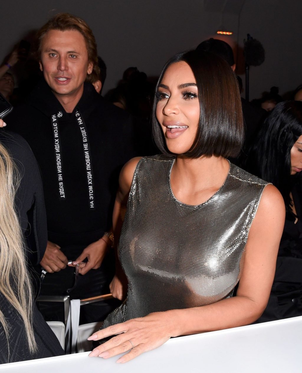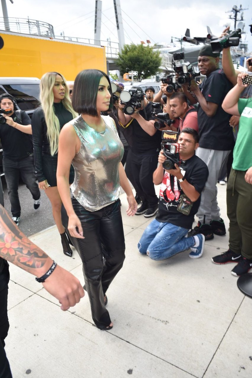 Curvy bruna Kim Kardashian arriva a una sfilata di moda a New York durante la New York Fashion Week, 10/09/2019. La star della realtà TV di 38 anni con un seno prosperoso ha scelto per l’evento una camicetta metallica trasparente.