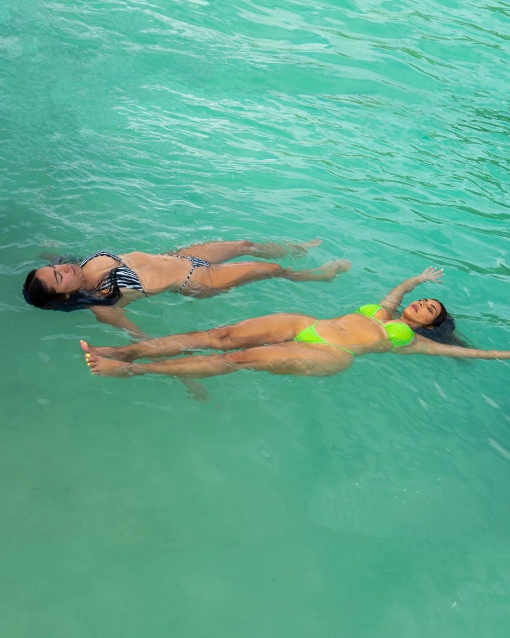 La star della TV reality Kim Kardashian sfoggia il suo corpo sexy mentre posa bagnata in un bikini verde per i suoi follower durante una vacanza con la sua famiglia – Instagram, 30/10/2020.