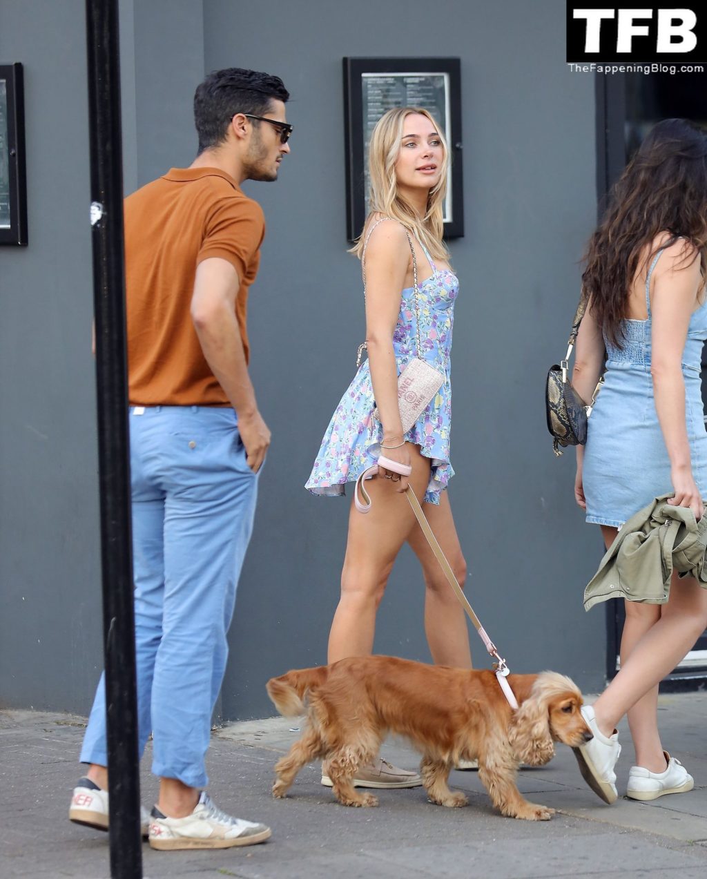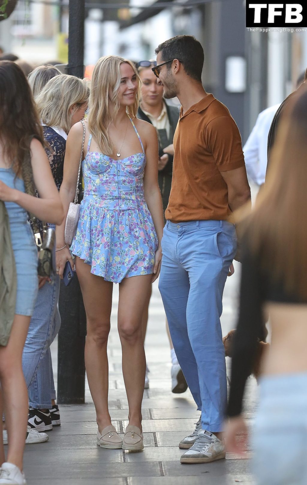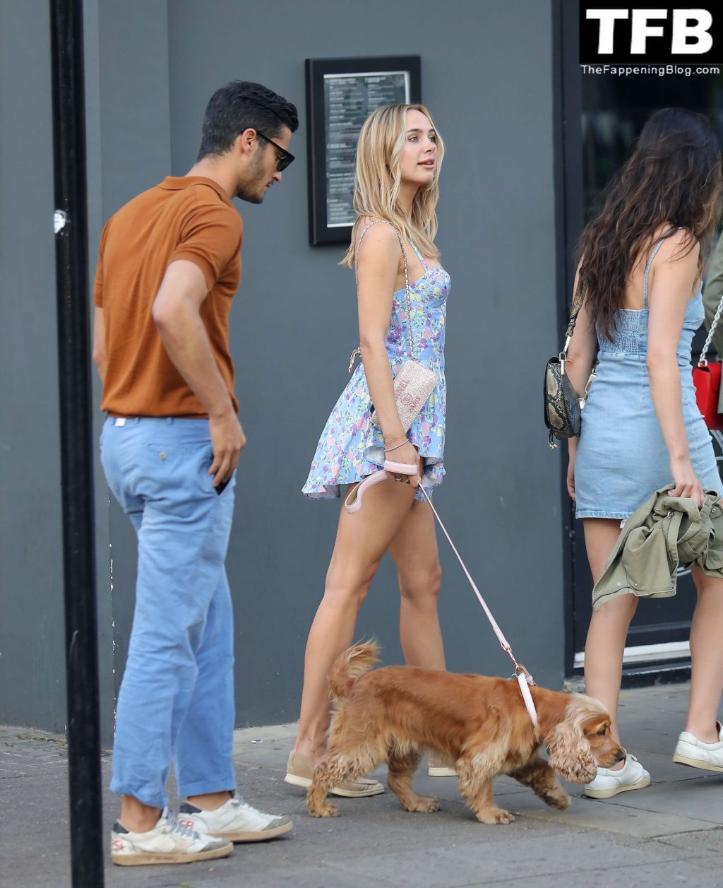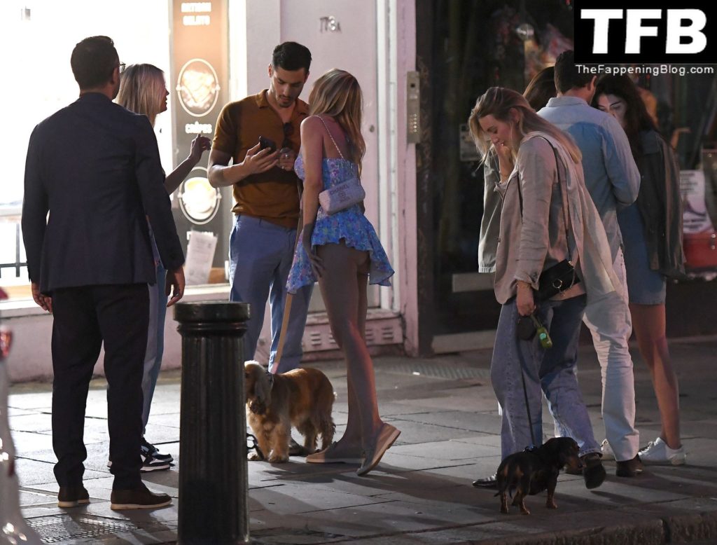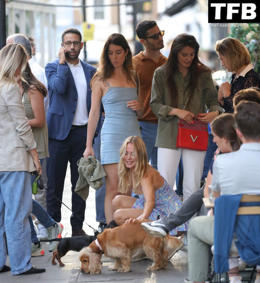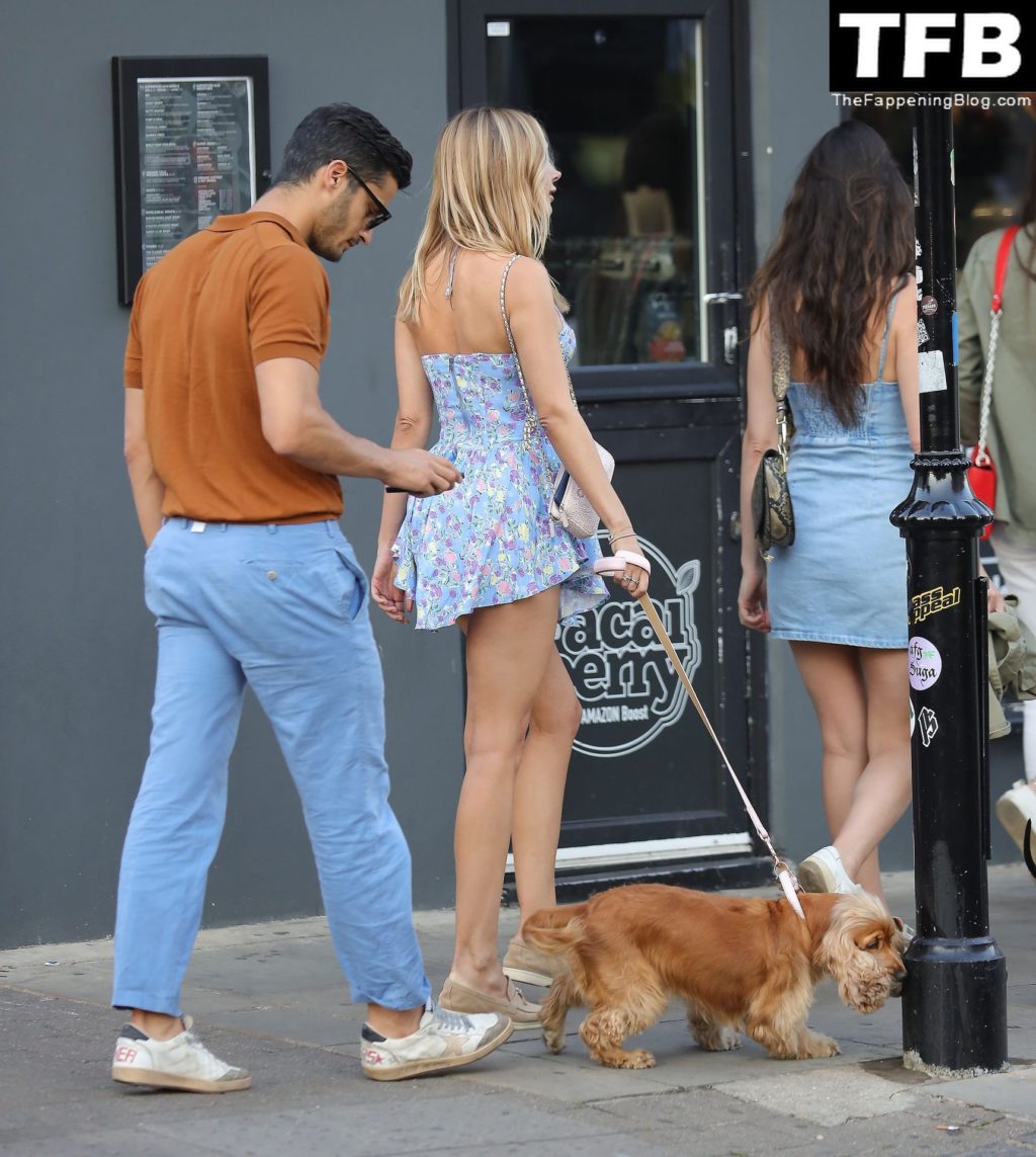 L’ex star di “Made In Chelsea” indossava un vestito estivo blu, piuttosto corto, che le ha fatto mostrare il fondoschiena.