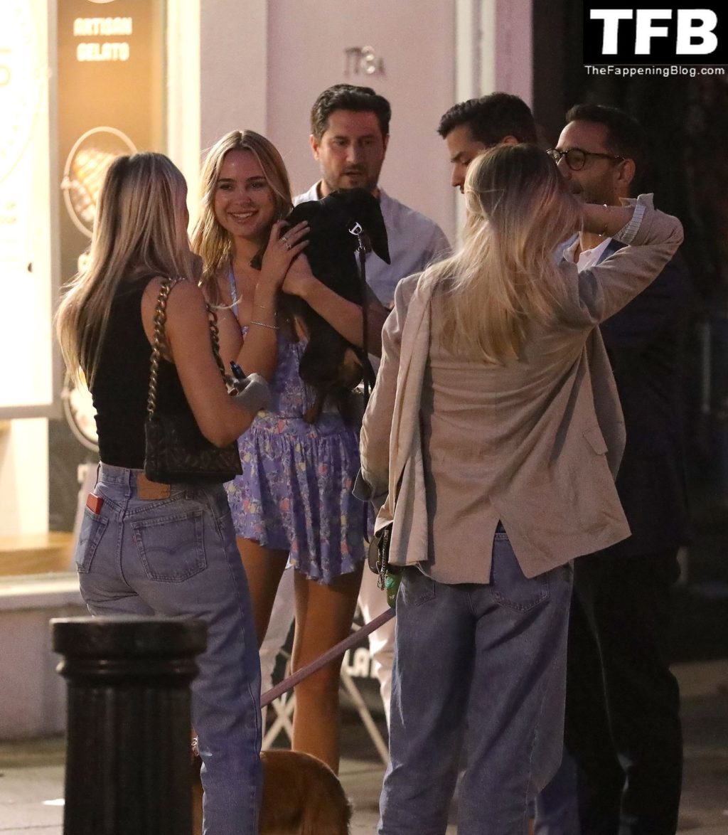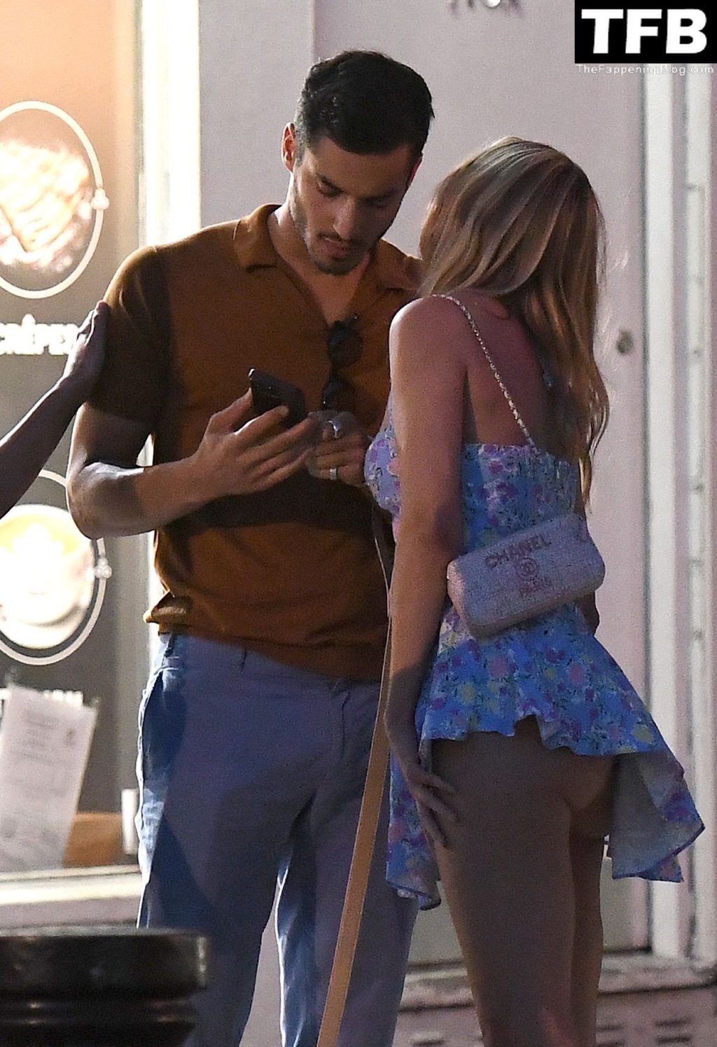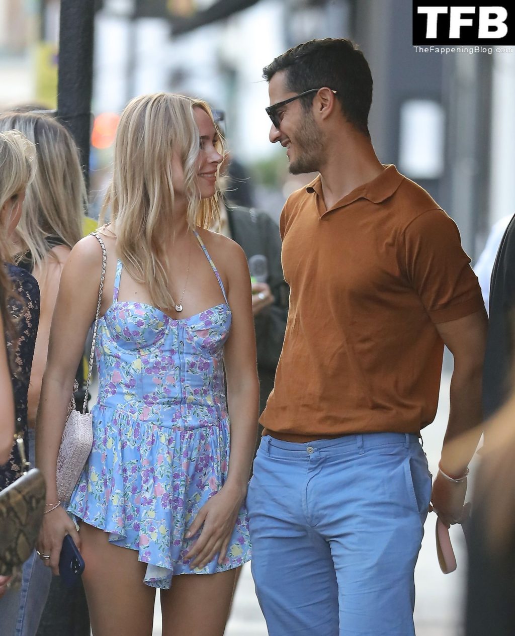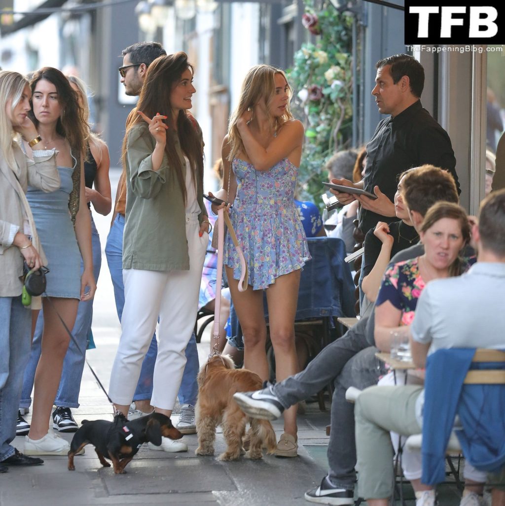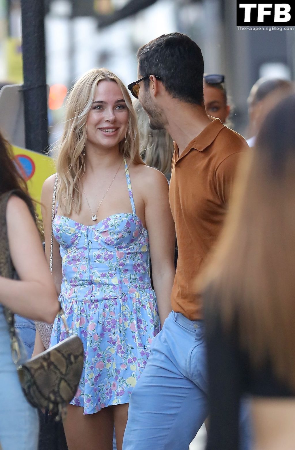 L’ex star di “Made In Chelsea” indossava un vestito estivo blu, piuttosto corto, che le ha fatto mostrare il fondoschiena.