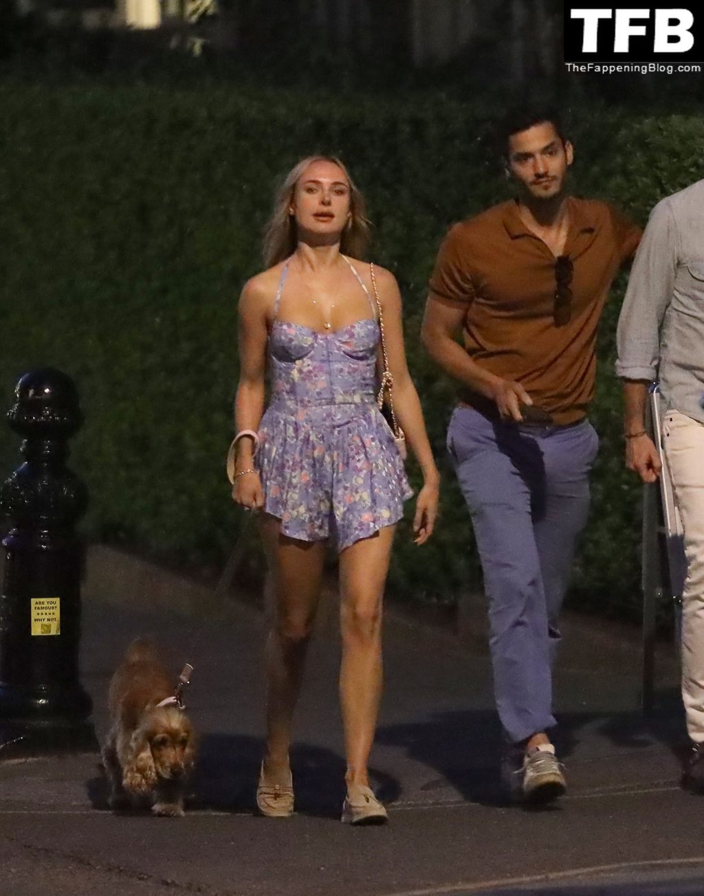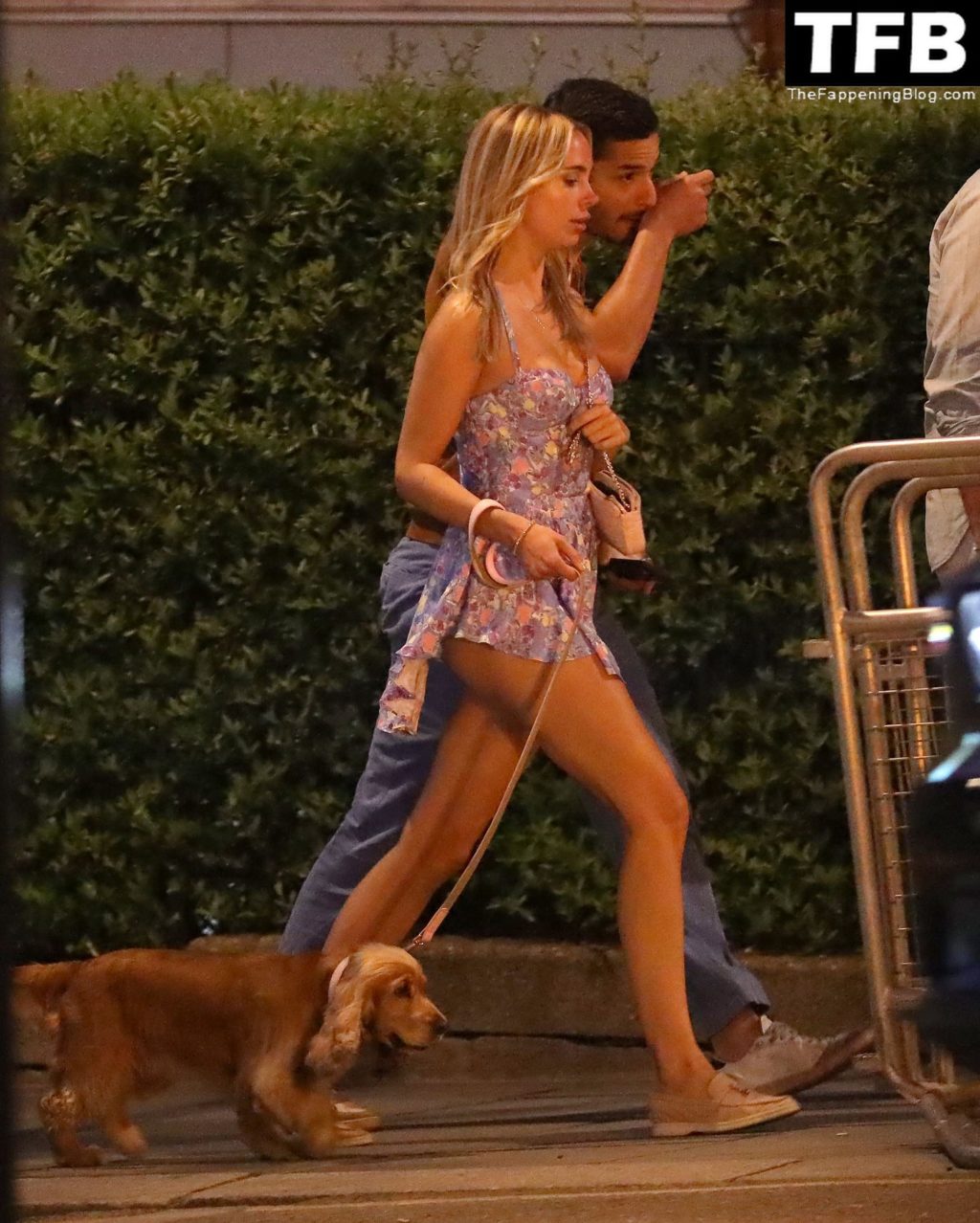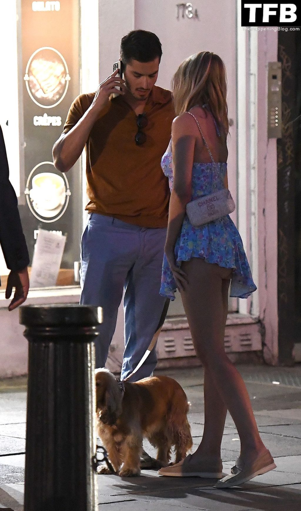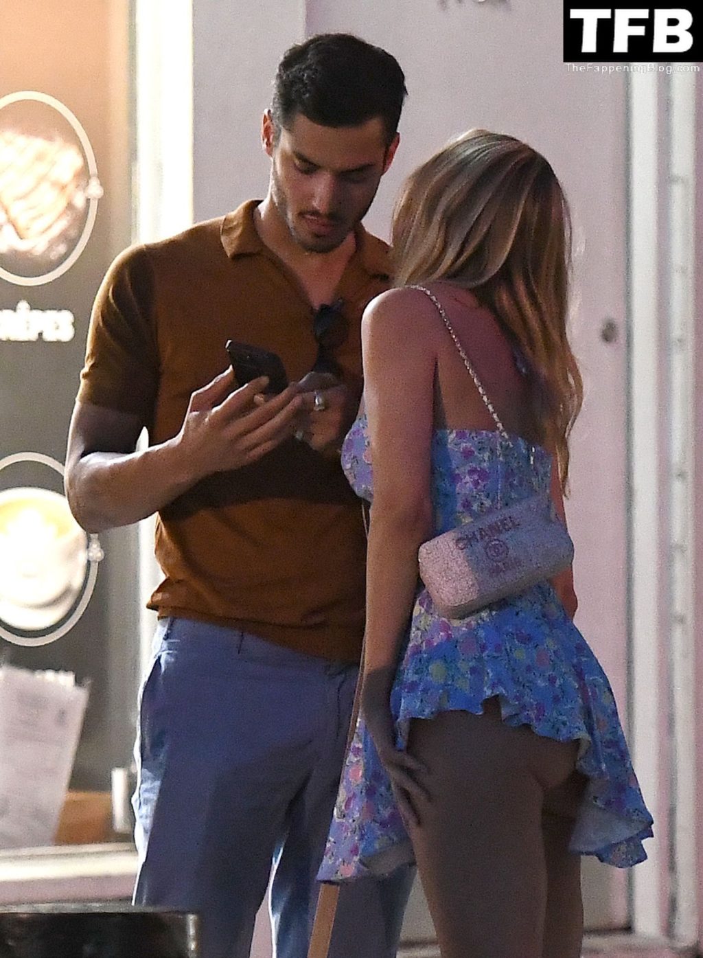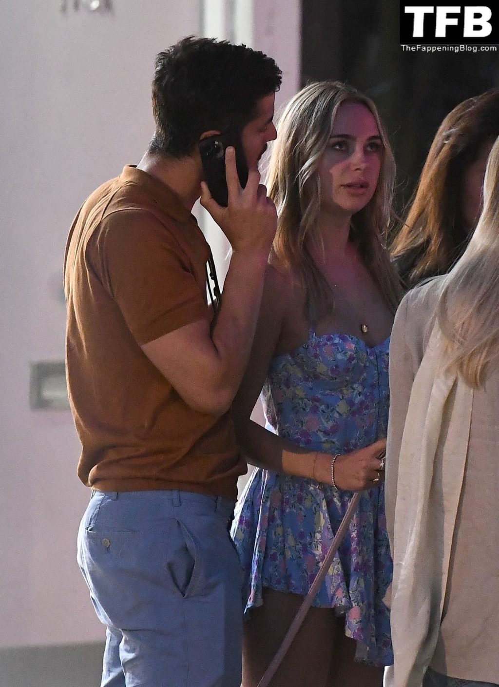 L’ex star di “Made In Chelsea” indossava un vestito estivo blu, piuttosto corto, che le ha fatto mostrare il fondoschiena.