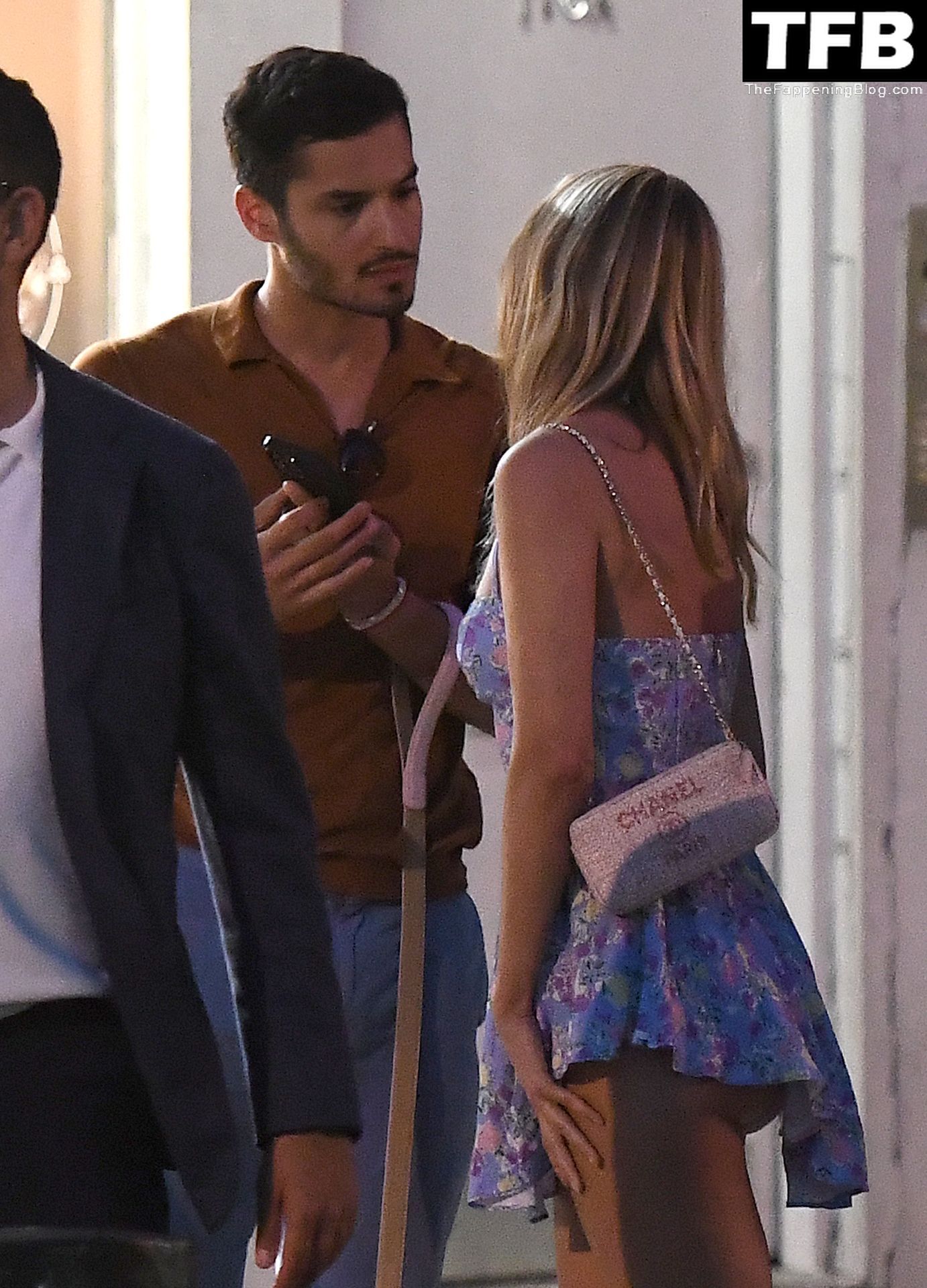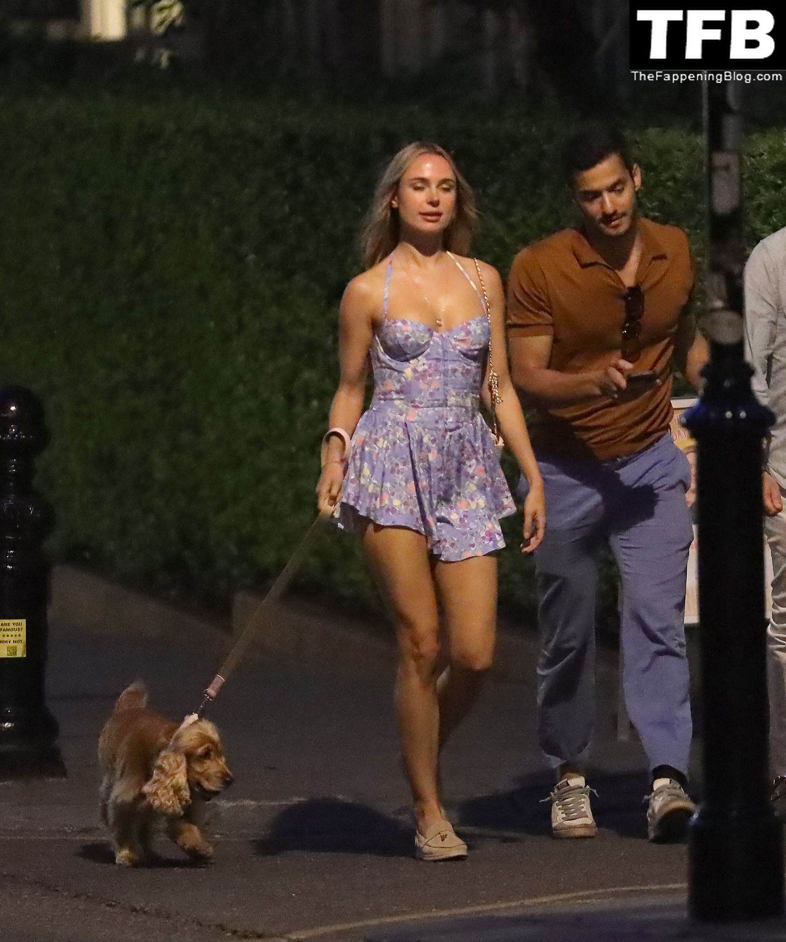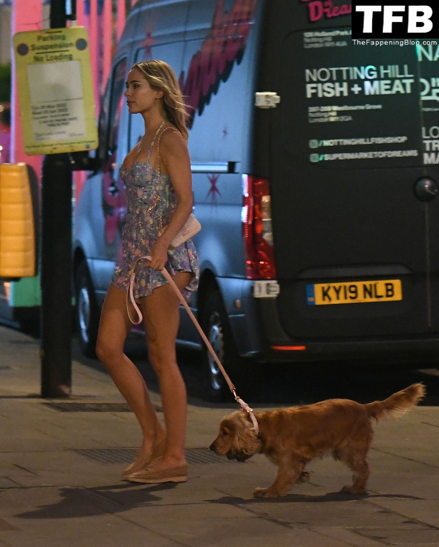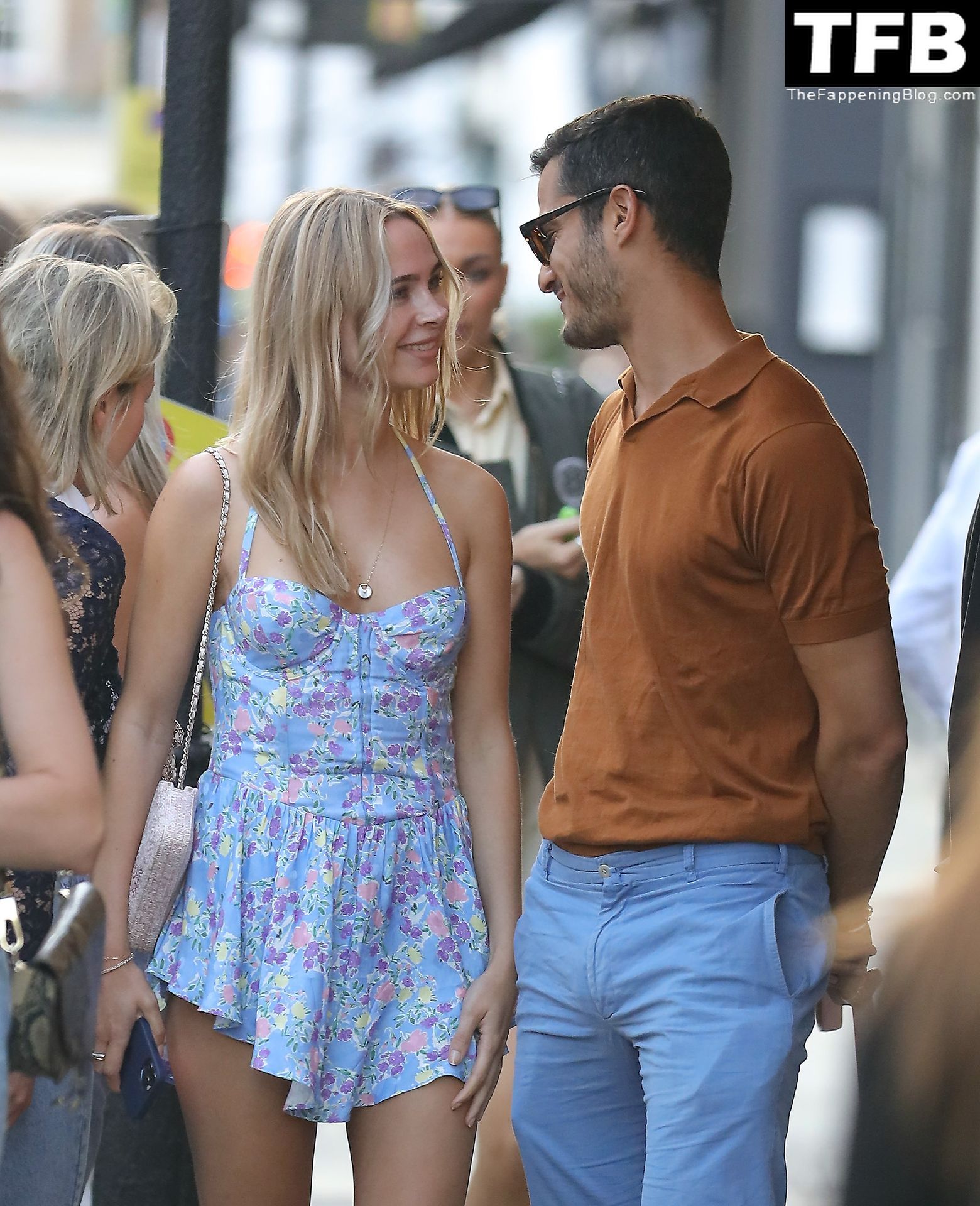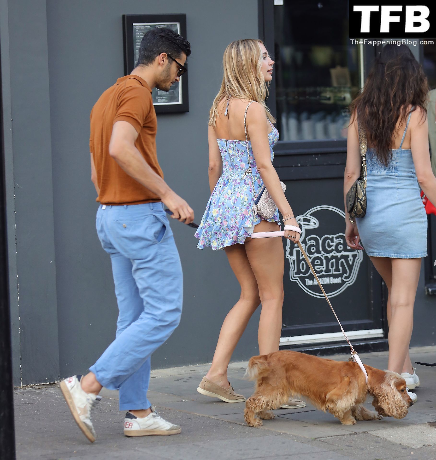 L’ex star di “Made In Chelsea” indossava un vestito estivo blu, piuttosto corto, che le ha fatto mostrare il fondoschiena.