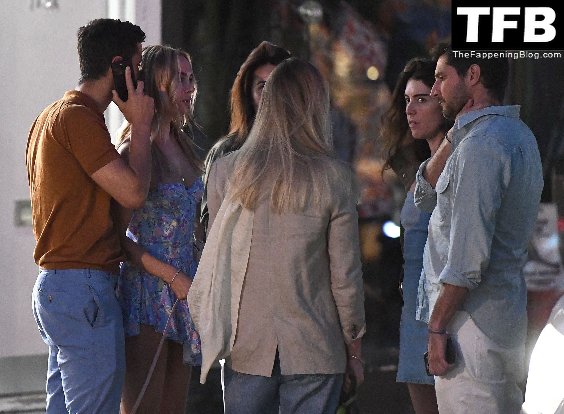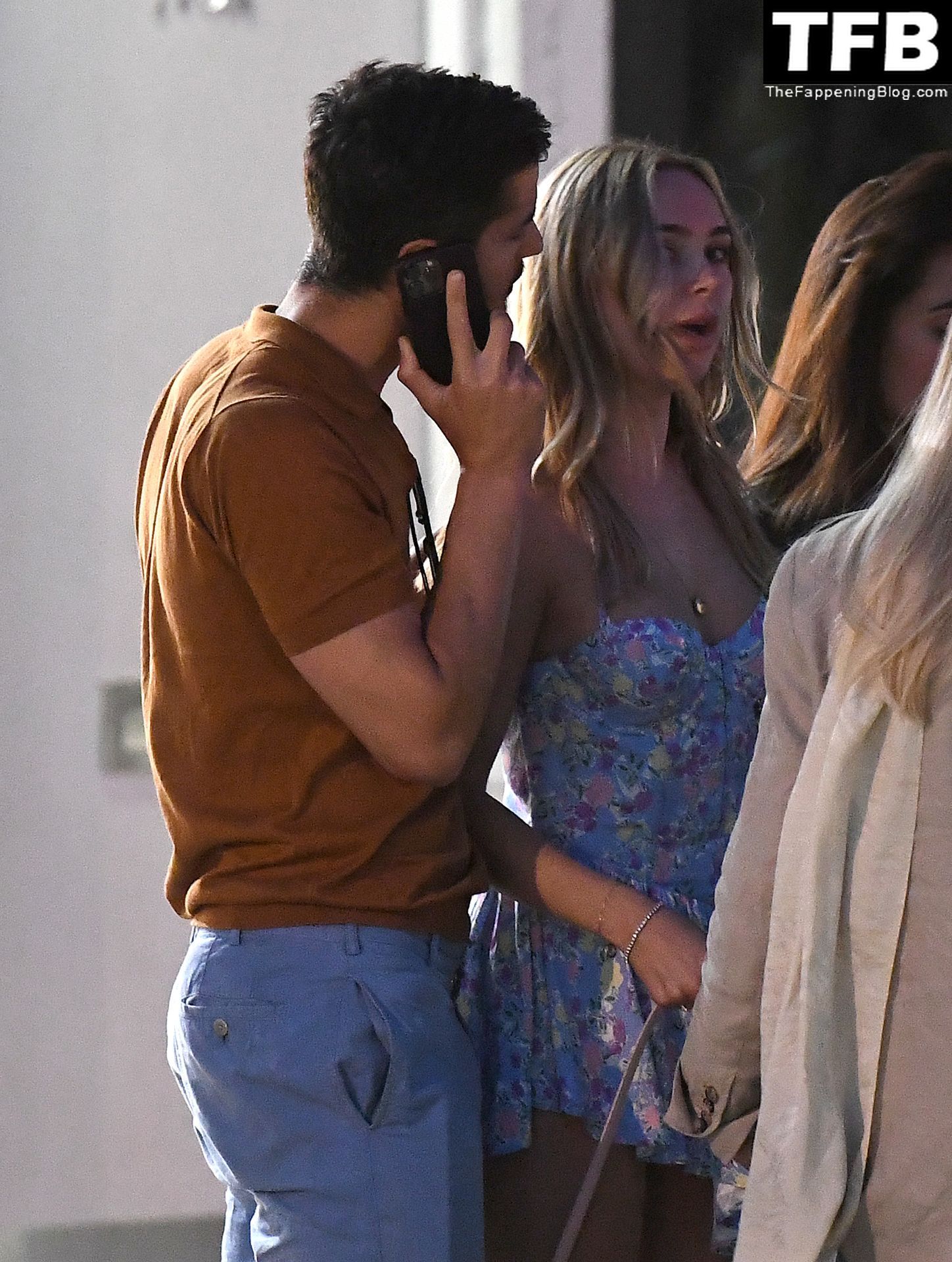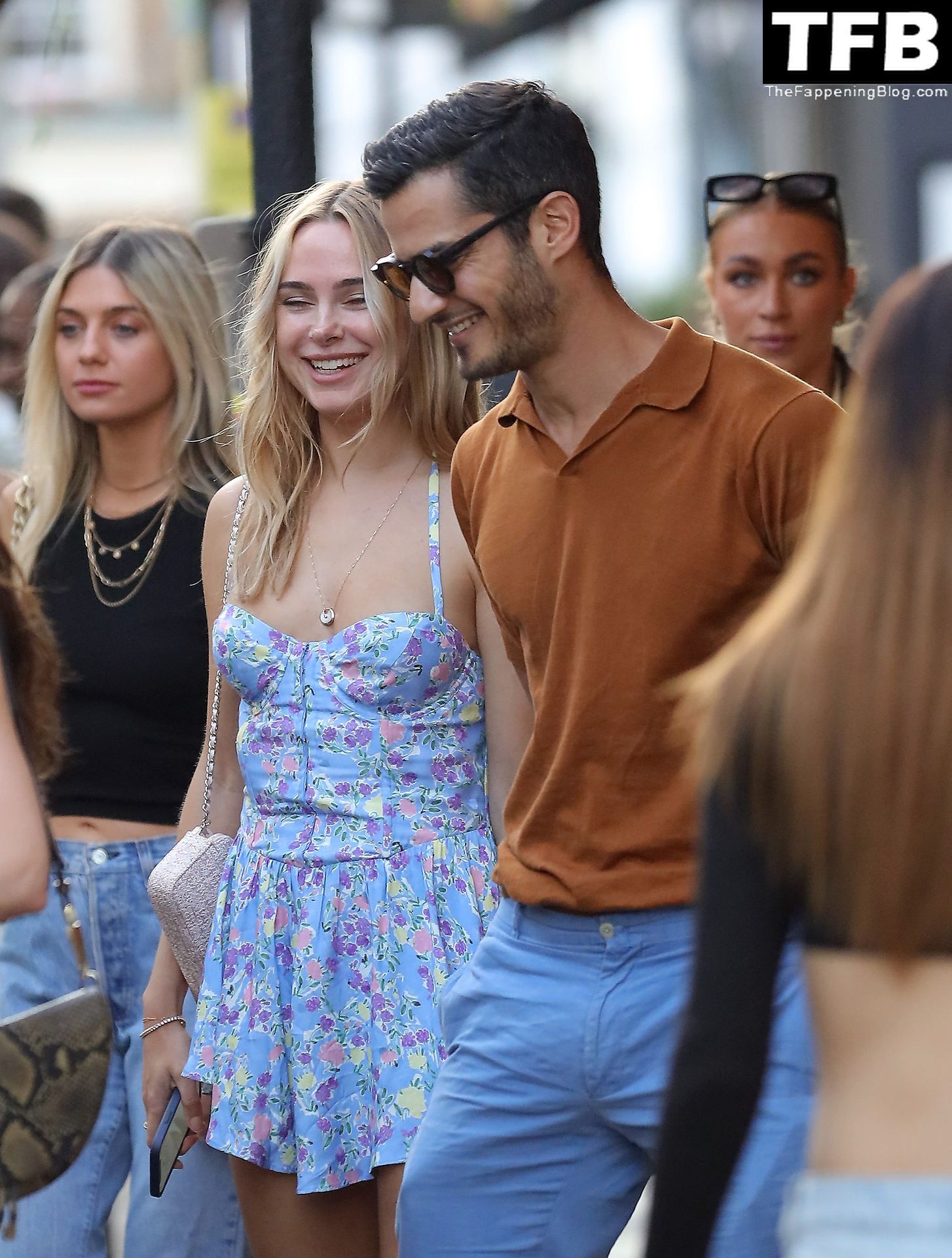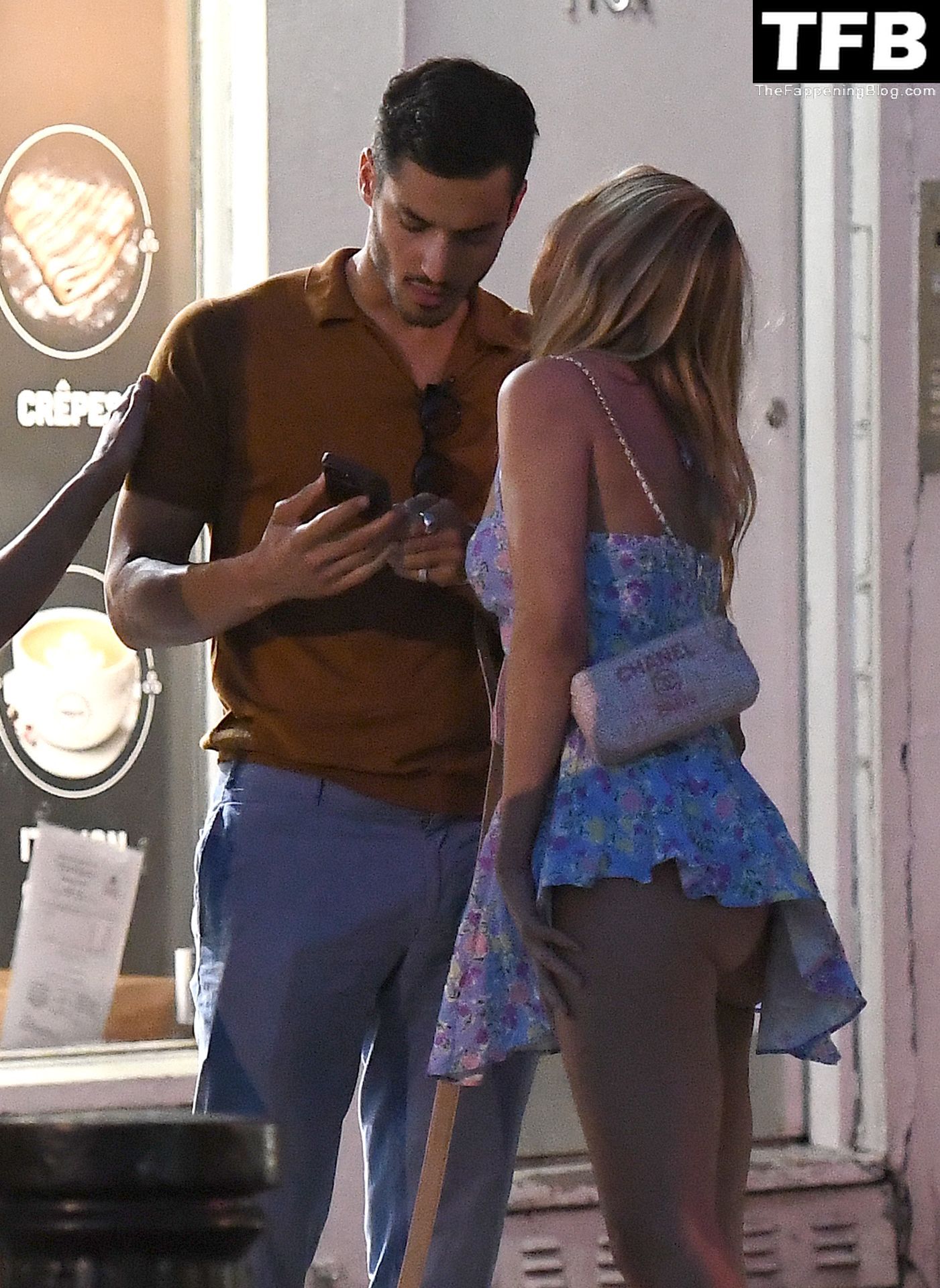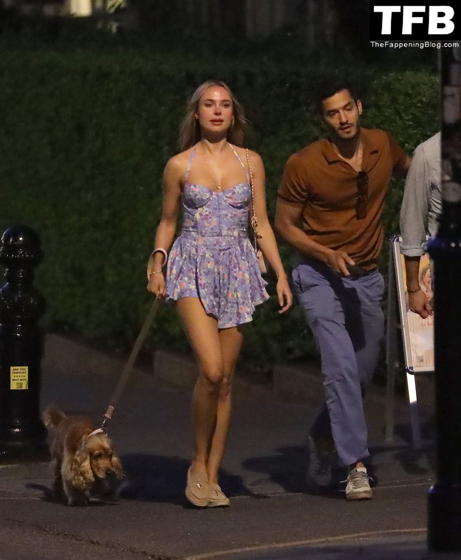 L’ex star di “Made In Chelsea” indossava un vestito estivo blu, piuttosto corto, che le ha fatto mostrare il fondoschiena.