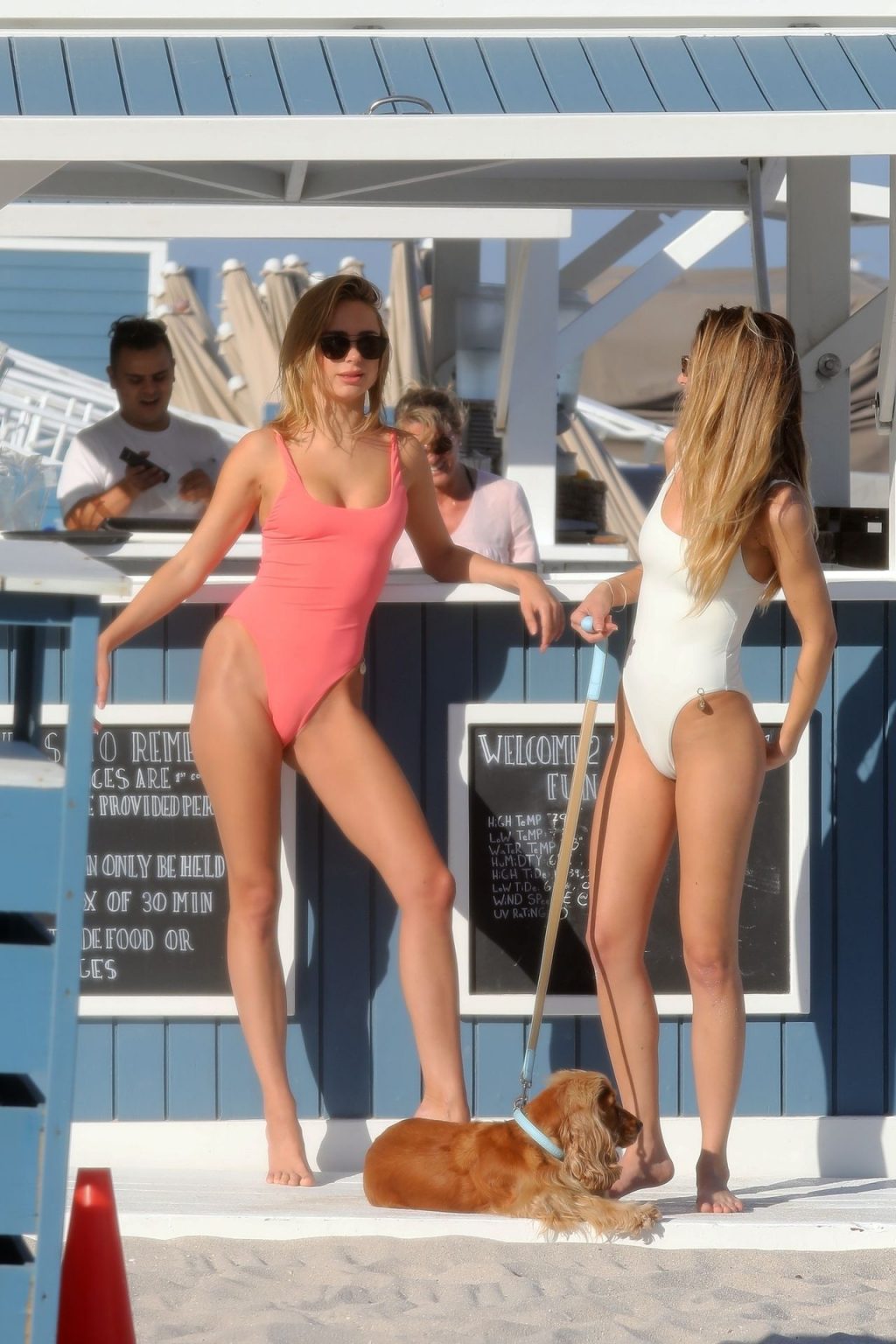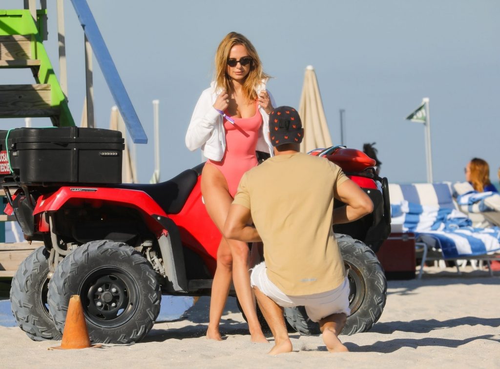 La stilista britannica di costumi da bagno Kimberley Garner posa con un costume intero rosa a Miami Beach, 21/01/2020. La stilista/modella mostra la sua figura straordinaria mentre un fotografo cattura la sua immagine davanti a un ATV sulla spiaggia.