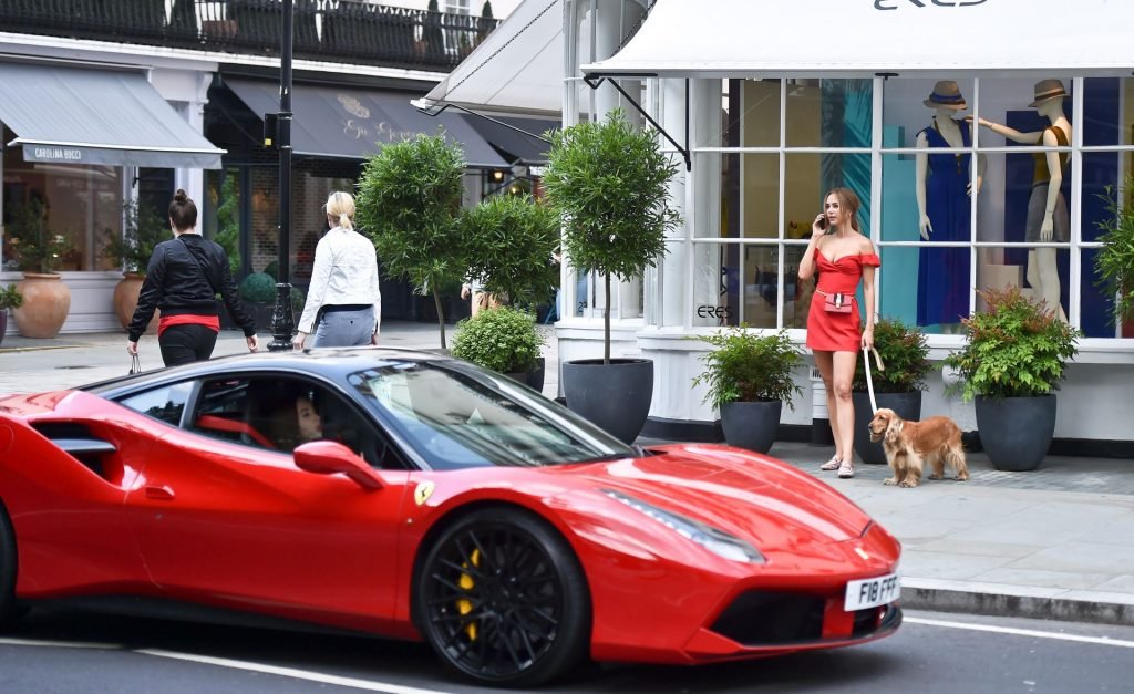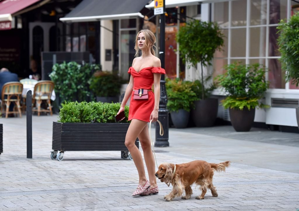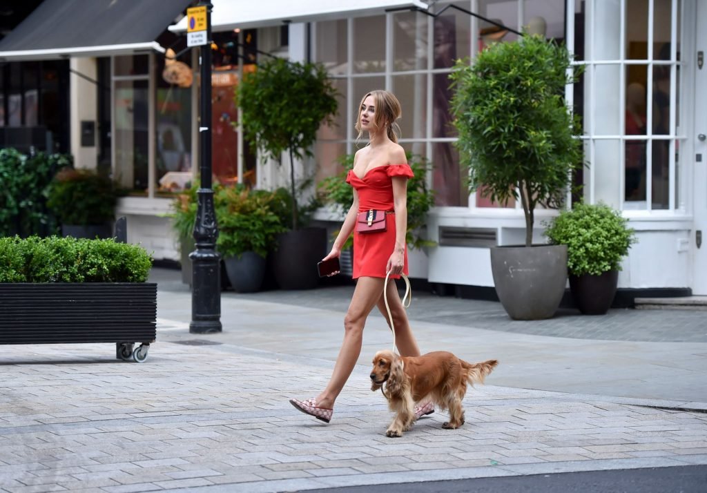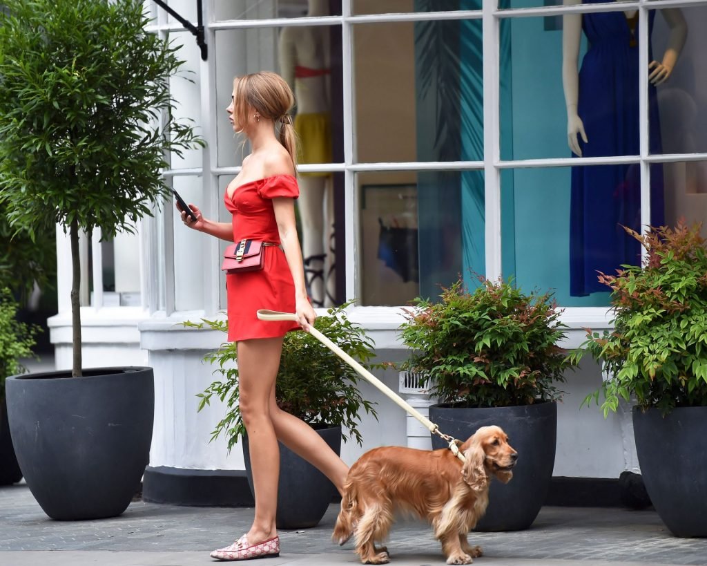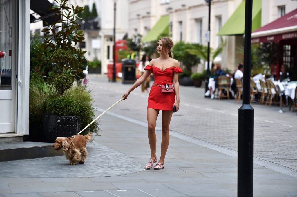 Leggy Kimberley Garner è stata vista con un vestito rosso mentre passeggiava con il suo cane tra i negozi di lusso a Belgravia, Londra, 17/07/2019.