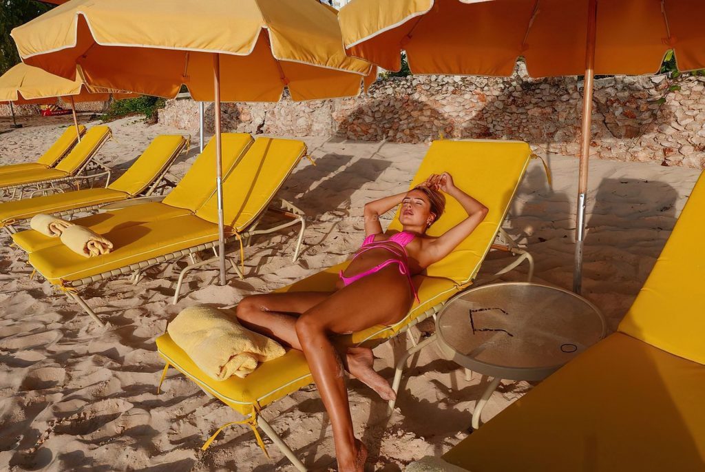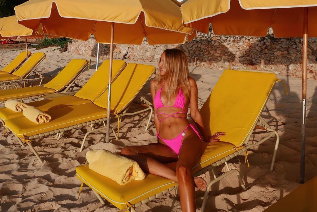 Modella bionda Kimberley Garner promuove il suo costume da bagno, mostrando il suo corpo perfettamente in forma durante una vacanza – Instagram (2021).