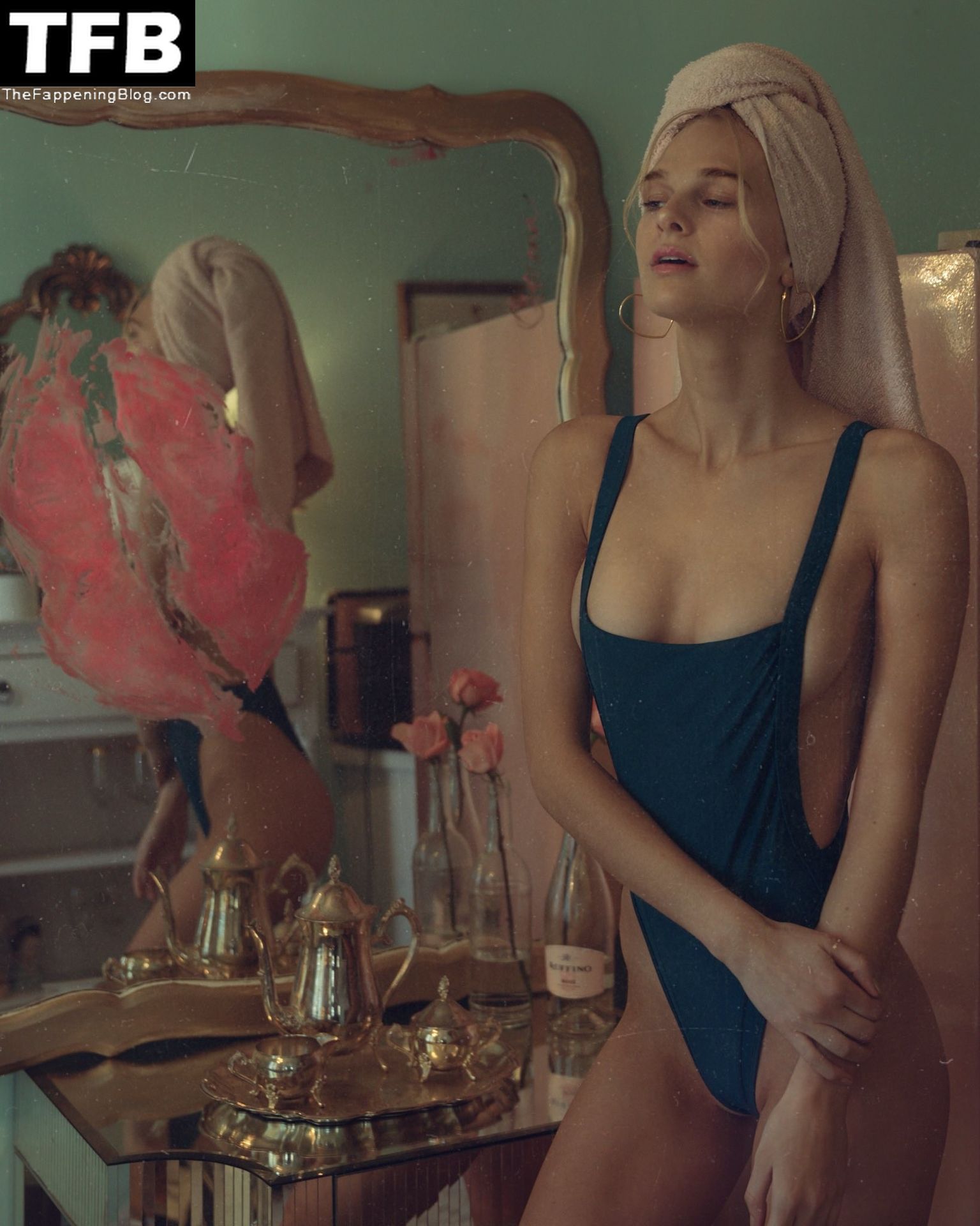 La modella americana KJ Skorge posa in un body e topless, coprendo i suoi seni nudi e sfoggiando il suo sexy sedere in un servizio fotografico di Clint Robert (2018).