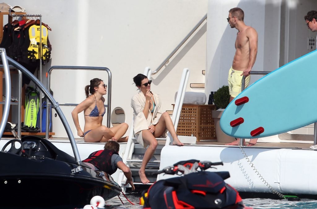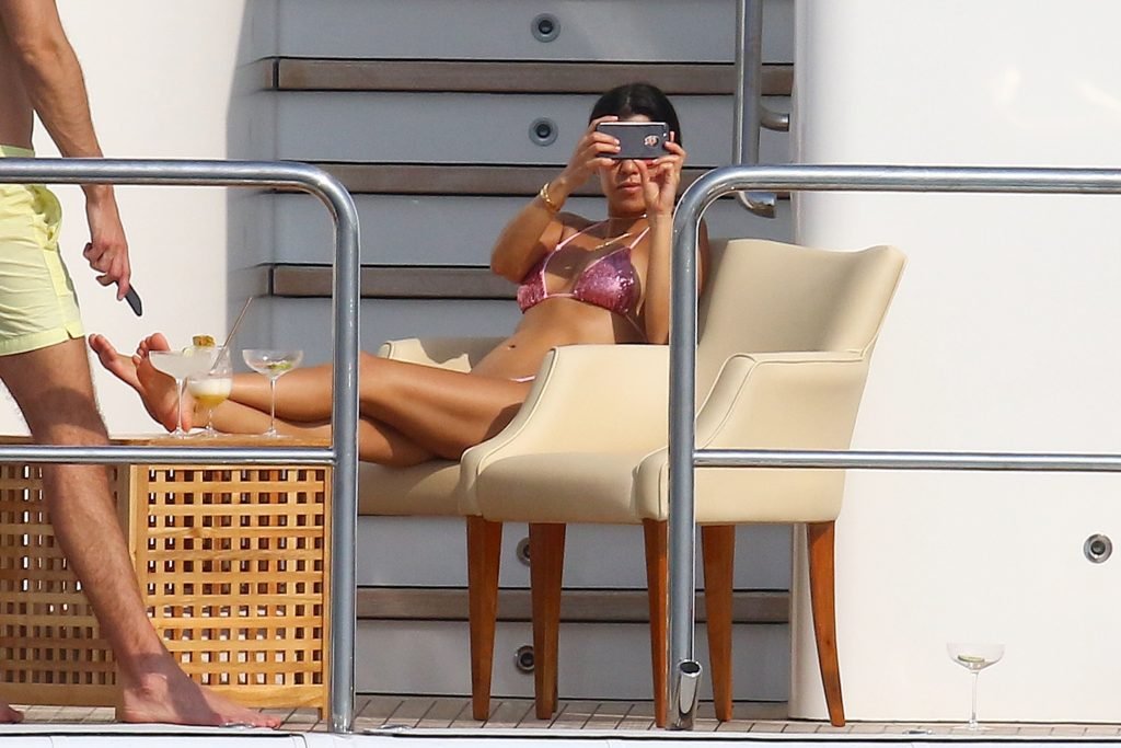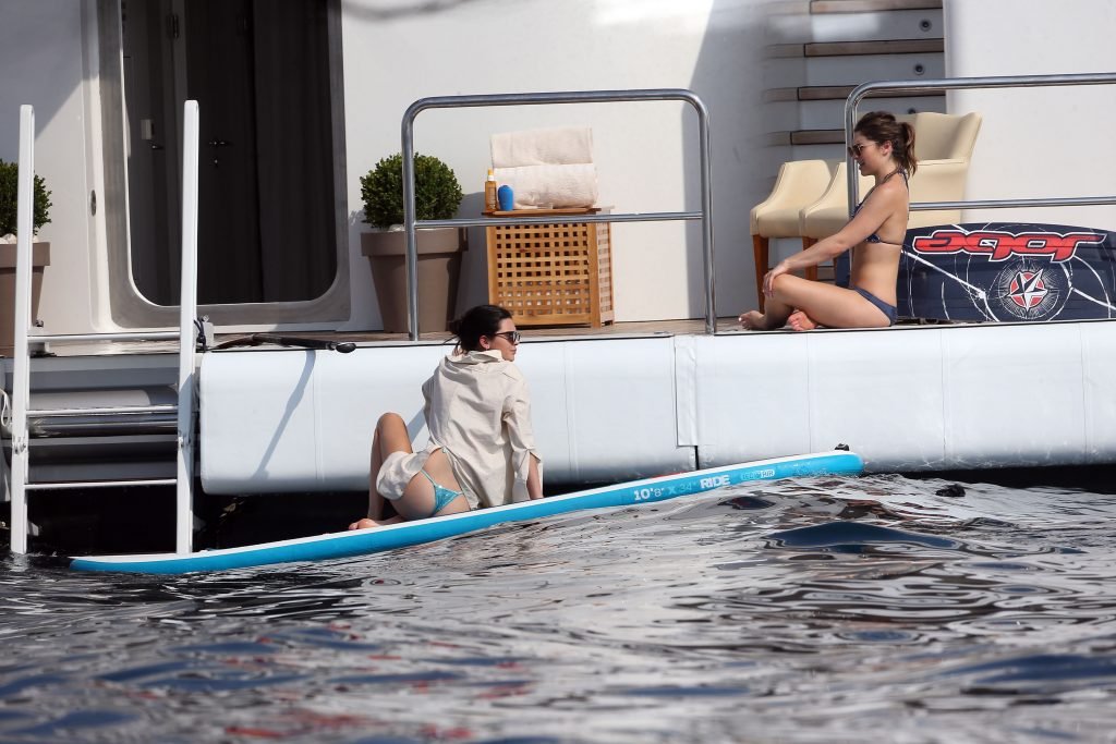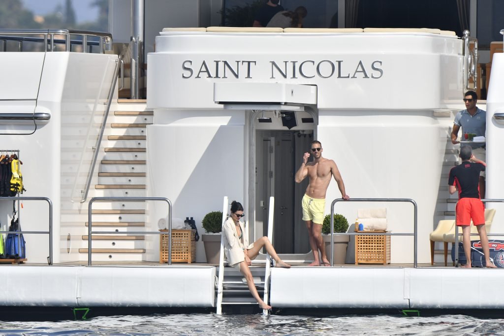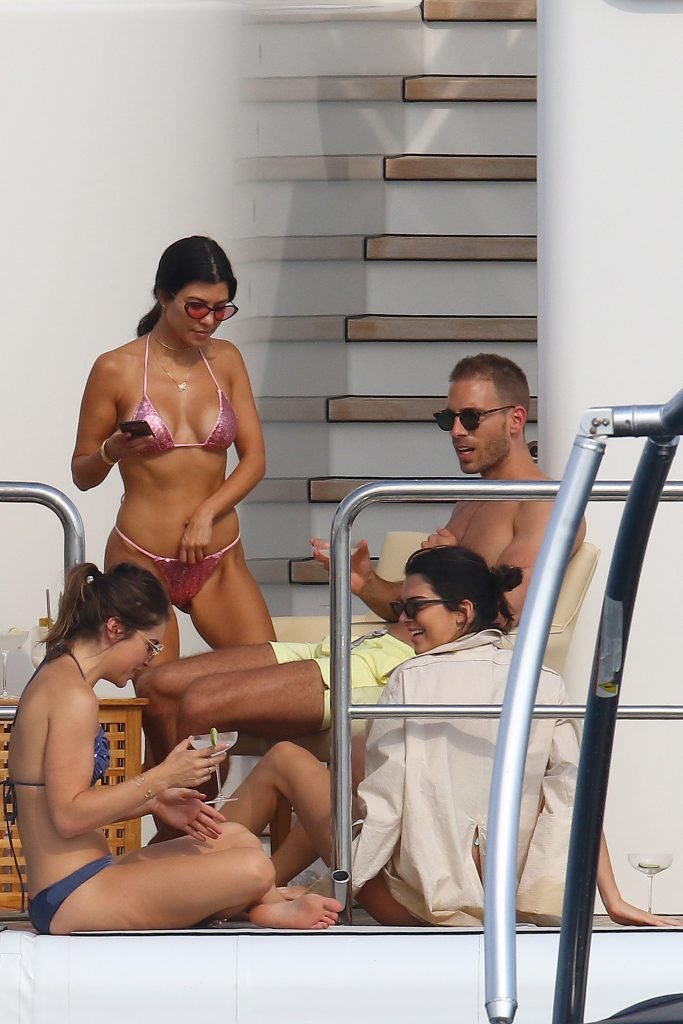 Kourtney Kardashian e Kendall Jenner trascorrono un bel momento su uno yacht ad Antibes durante il festival del cinema di Cannes, 25/05/2017. Kourtney Kardashian è una star americana dello show ‘Keeping Up with the Kardashians’, socialite, modella. Età: 38 anni.