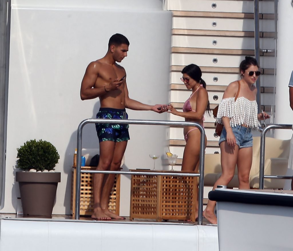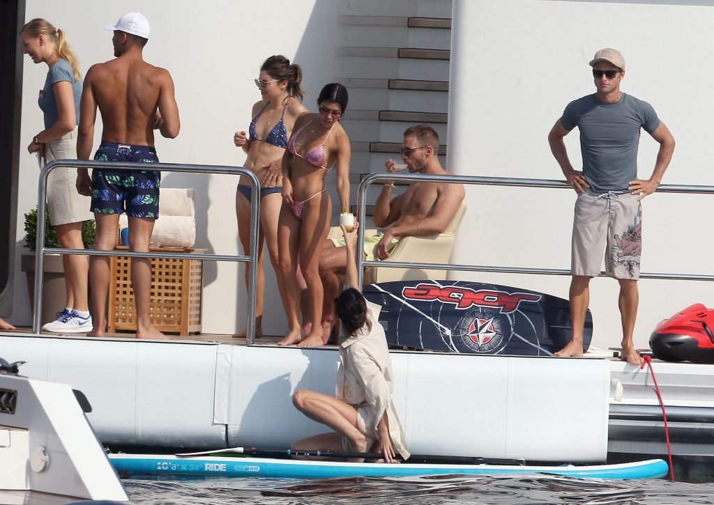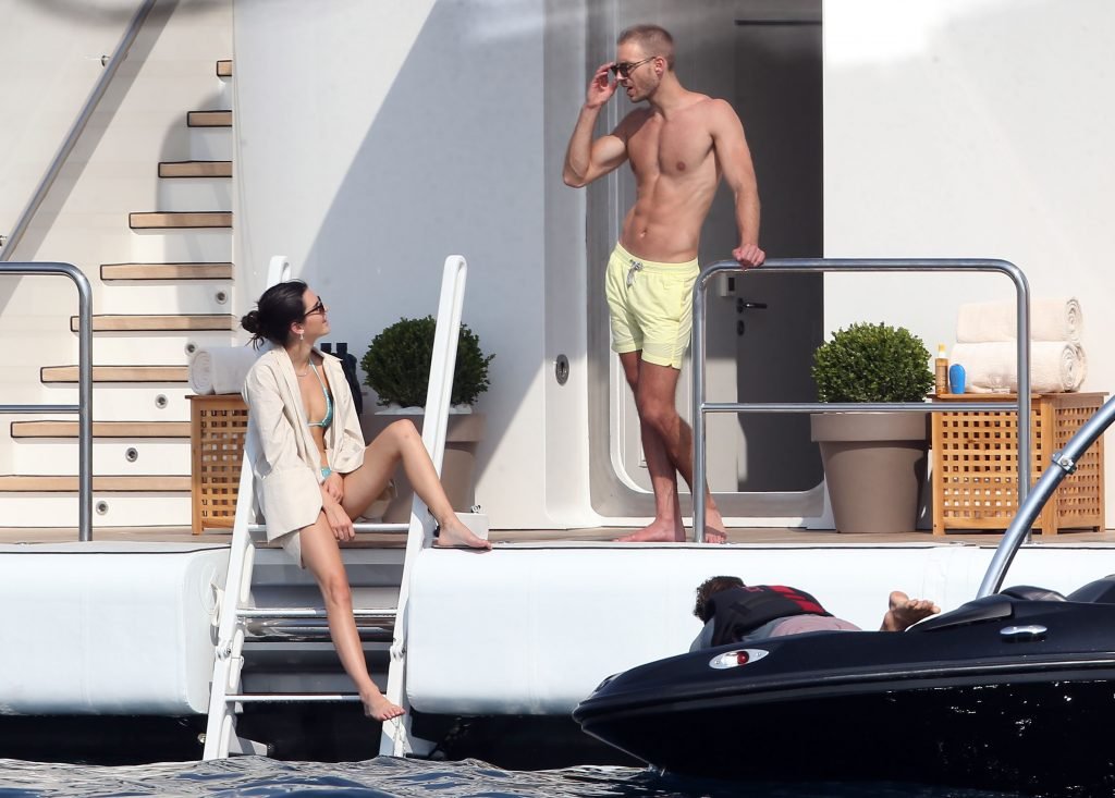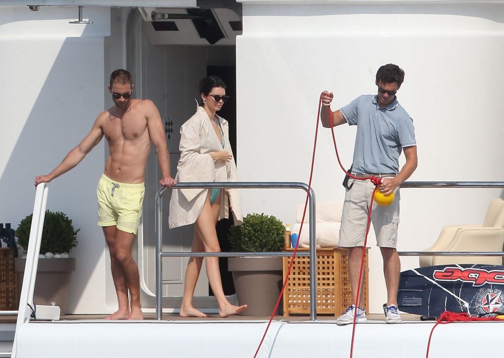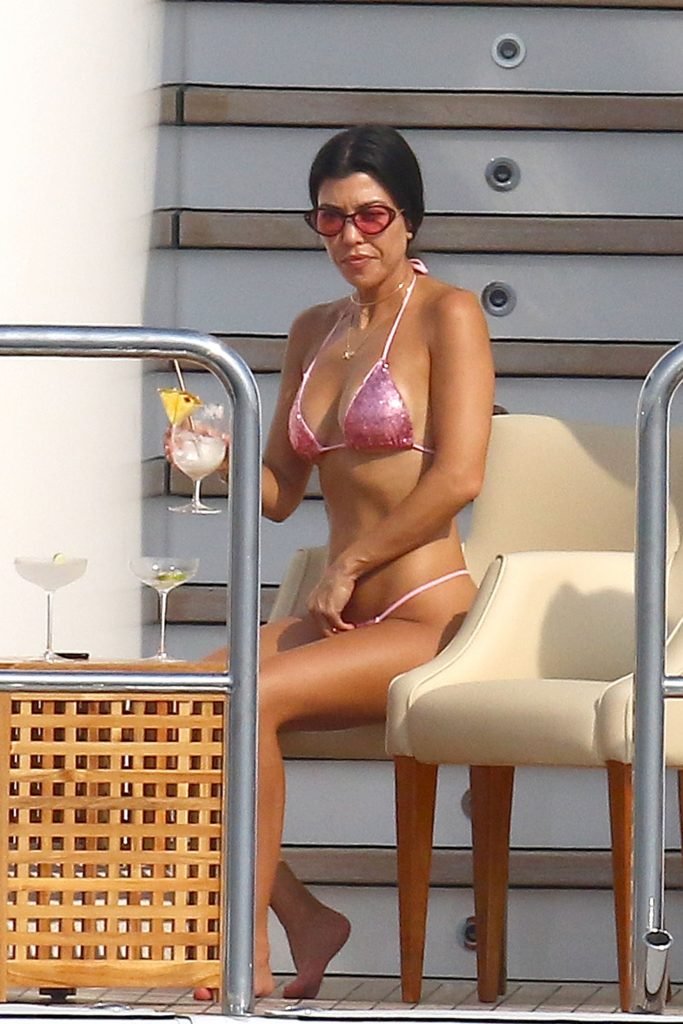 Kourtney Kardashian e Kendall Jenner trascorrono un bel momento su uno yacht ad Antibes durante il festival del cinema di Cannes, 25/05/2017. Kourtney Kardashian è una star americana dello show ‘Keeping Up with the Kardashians’, socialite, modella. Età: 38 anni.