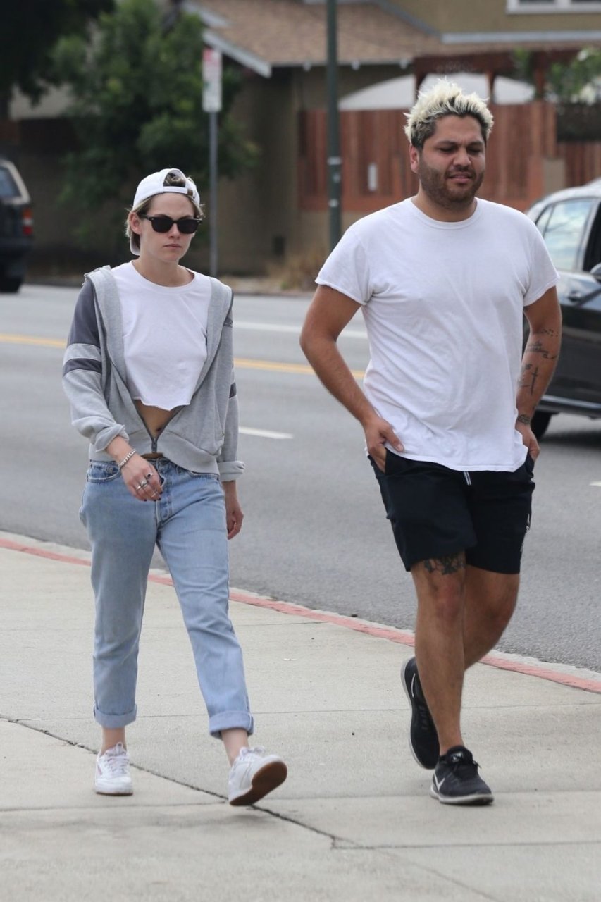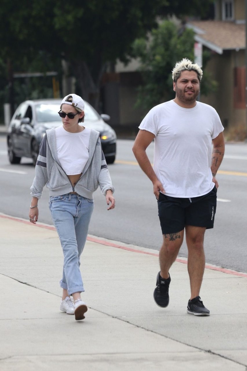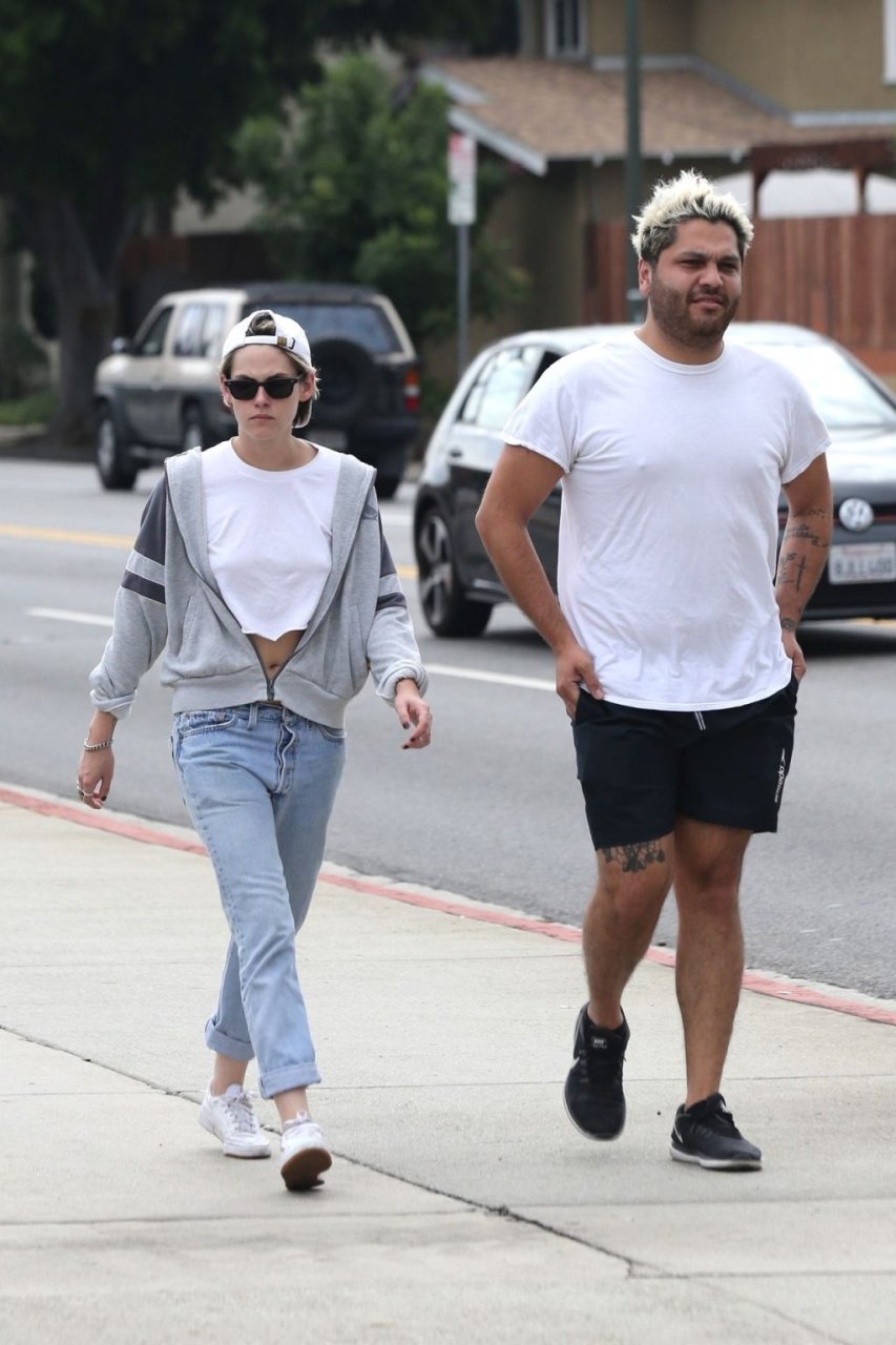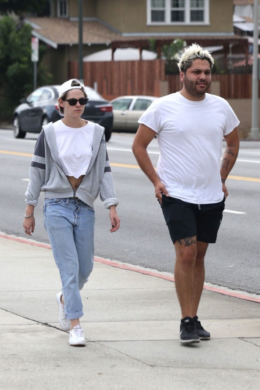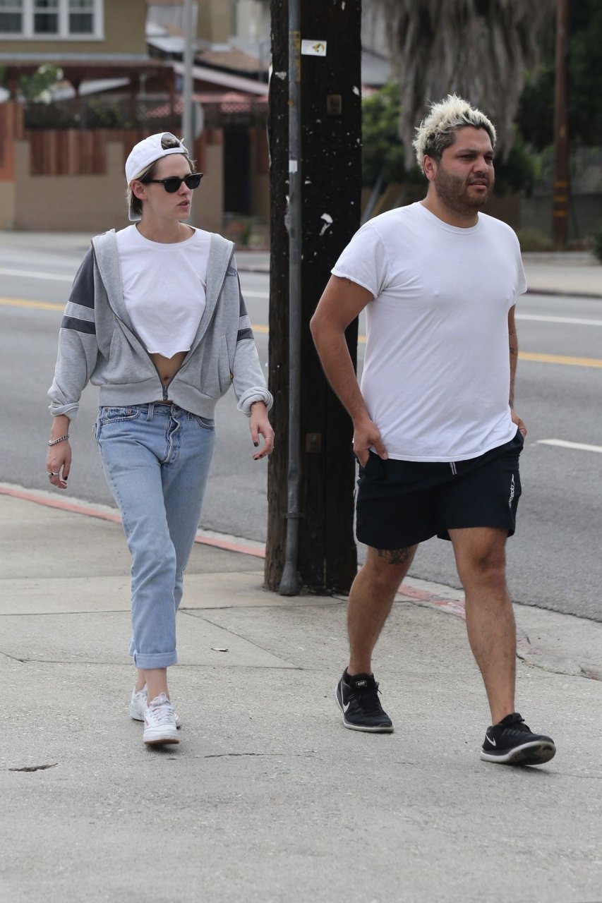 Kristen Stewart sceglie di non indossare il reggiseno mentre cammina verso la colazione con la sua amica a Los Angeles, 23/07/2019. Kristen appare casual con occhiali da sole, un top corto bianco sottile, jeans blu e sneakers bianche.