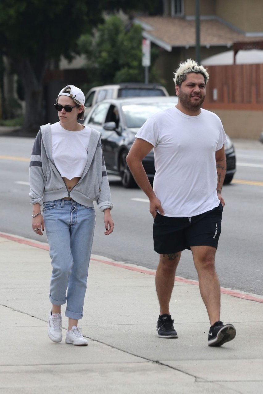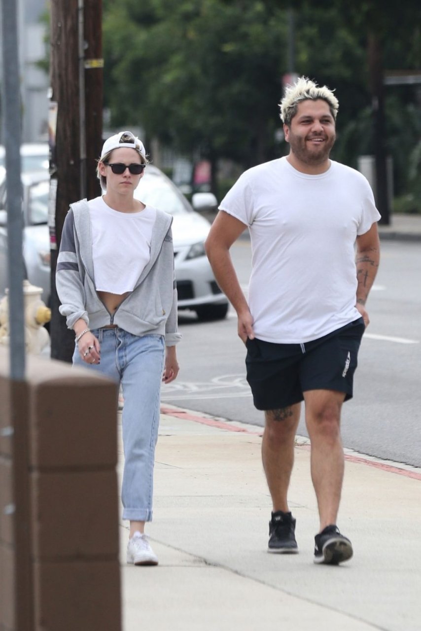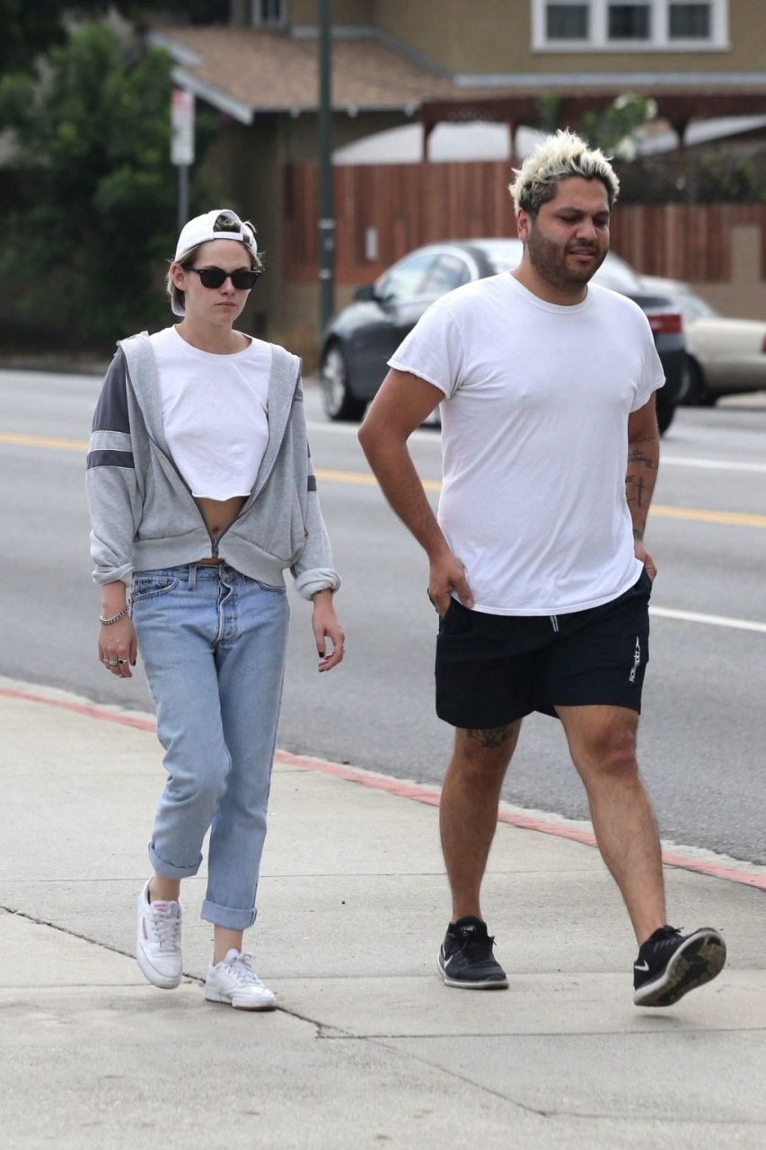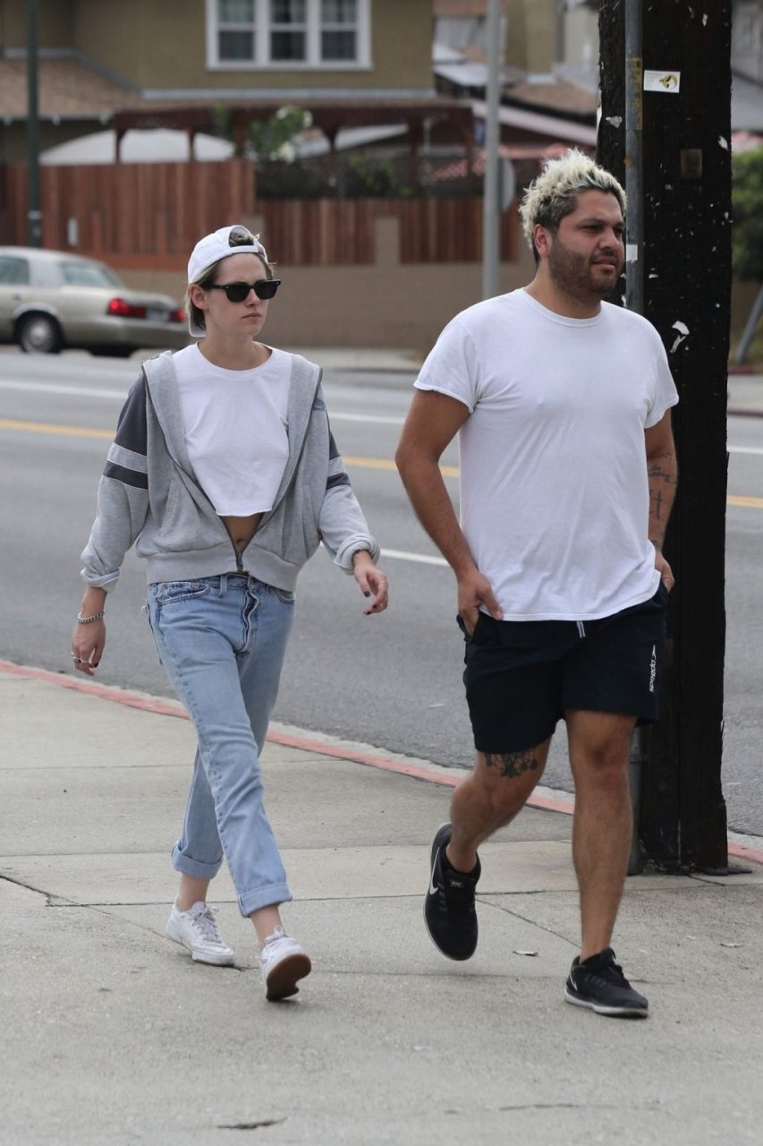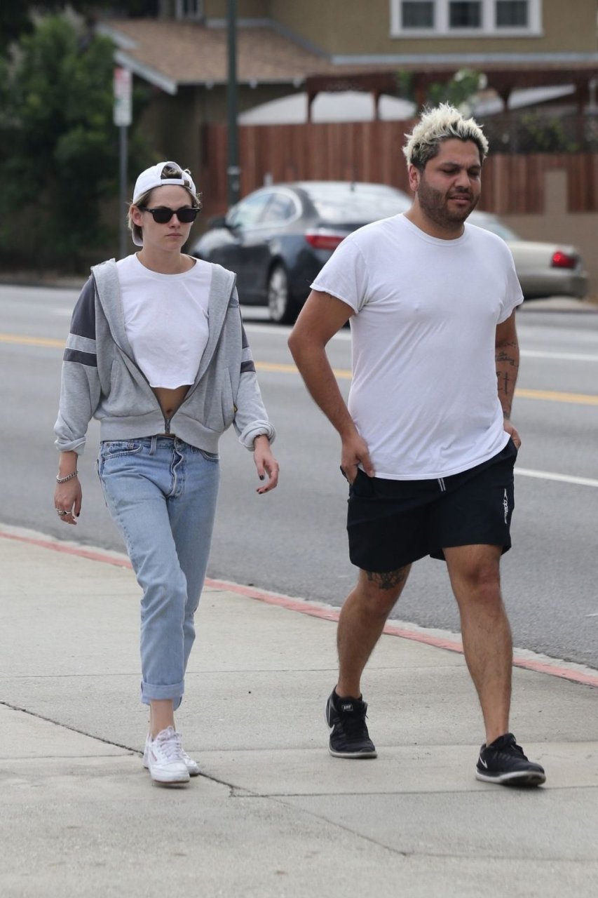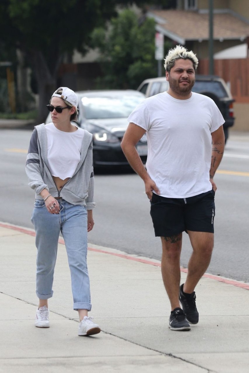 Kristen Stewart sceglie di non indossare il reggiseno mentre cammina verso la colazione con la sua amica a Los Angeles, 23/07/2019. Kristen appare casual con occhiali da sole, un top corto bianco sottile, jeans blu e sneakers bianche.