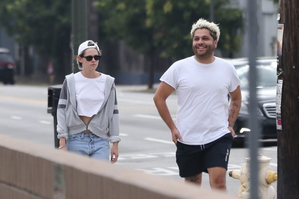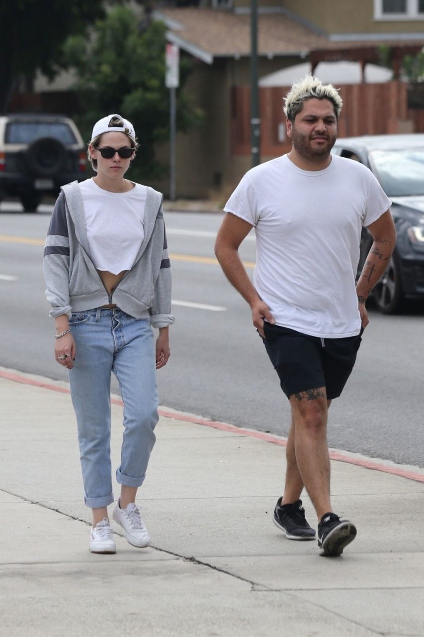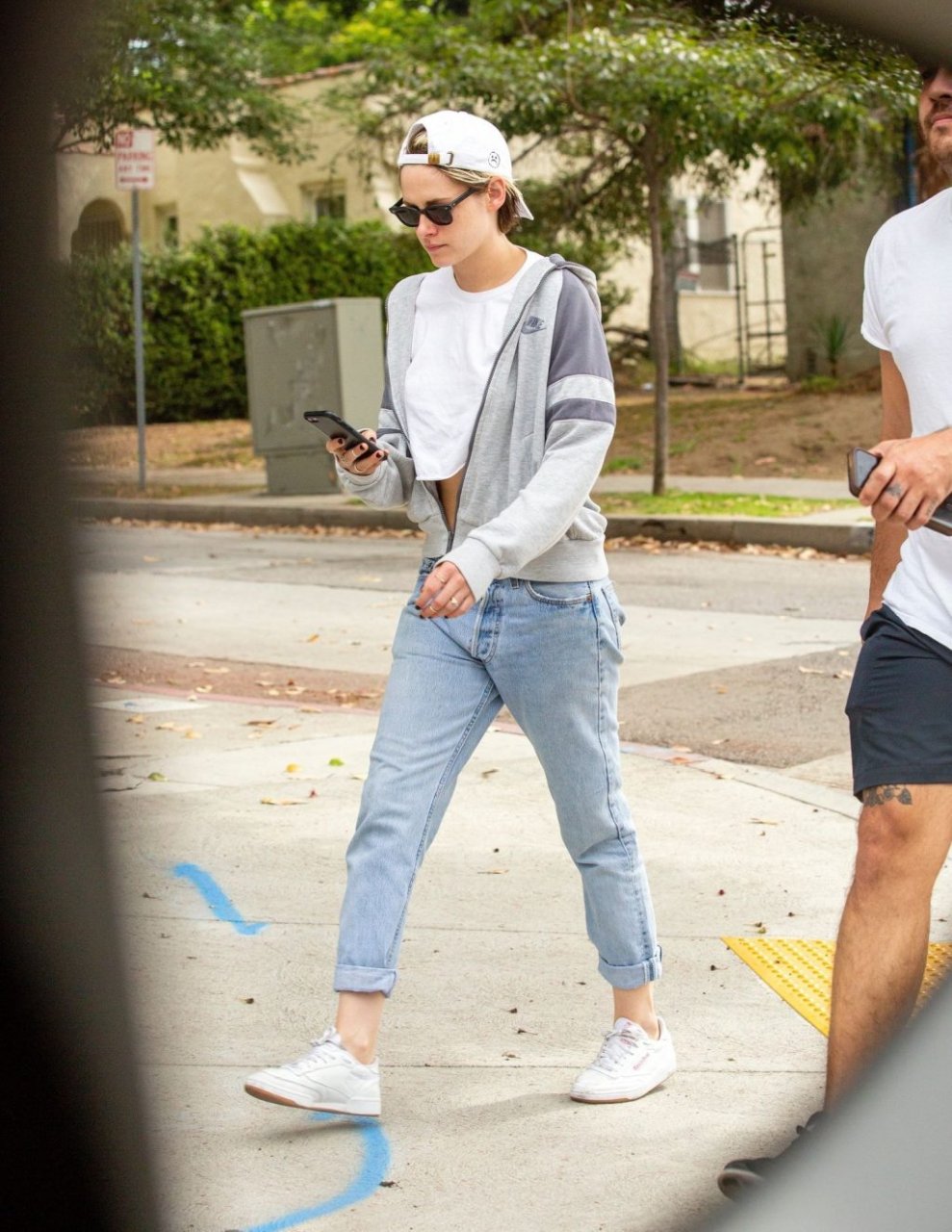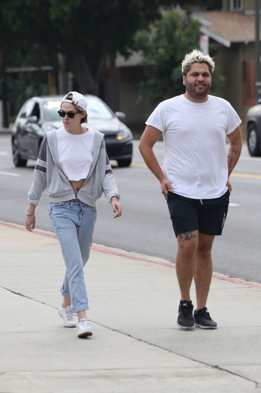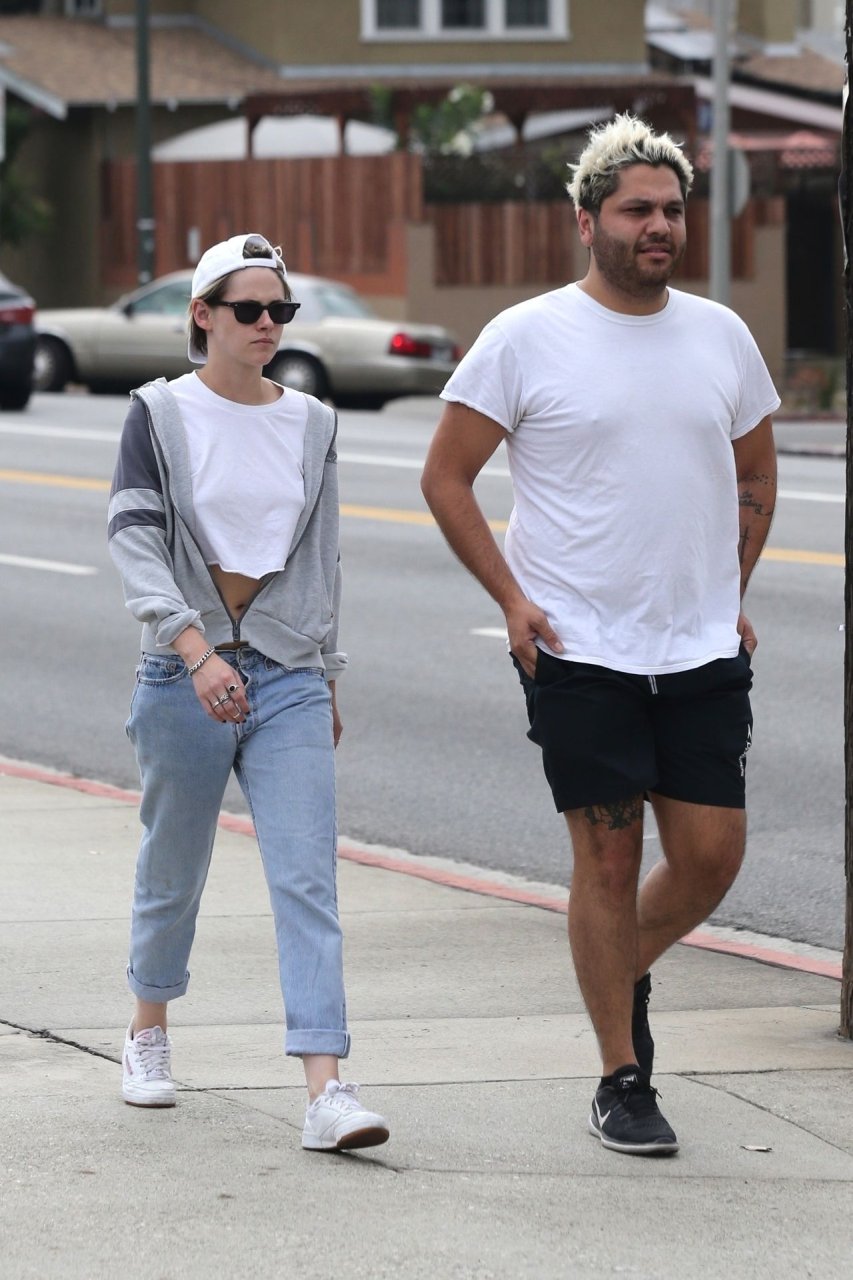 Kristen Stewart sceglie di non indossare il reggiseno mentre cammina verso la colazione con la sua amica a Los Angeles, 23/07/2019. Kristen appare casual con occhiali da sole, un top corto bianco sottile, jeans blu e sneakers bianche.