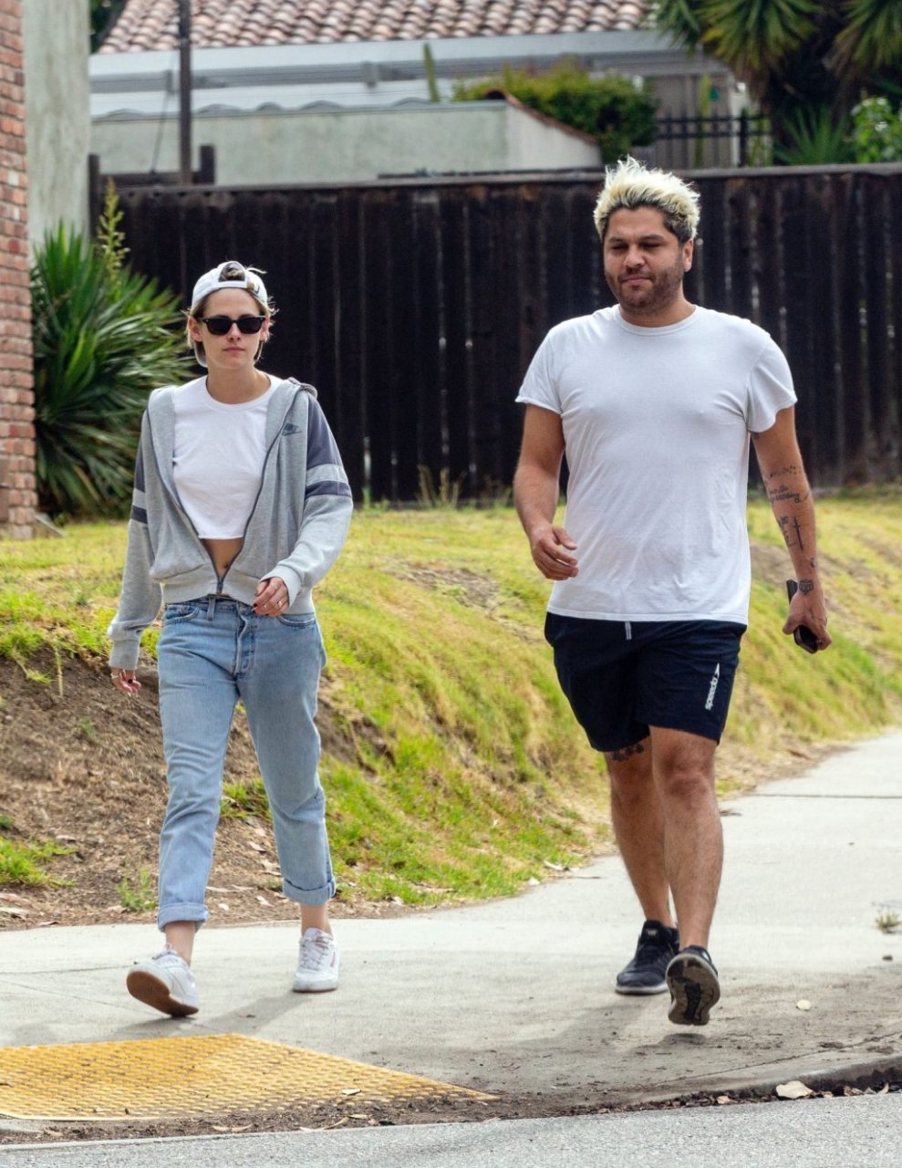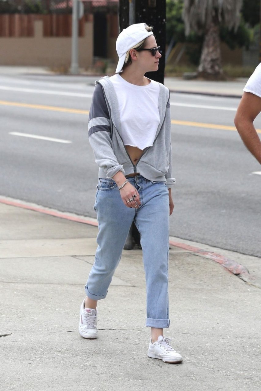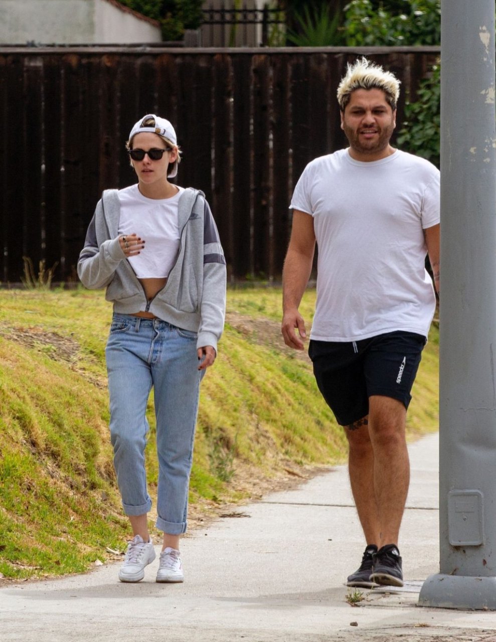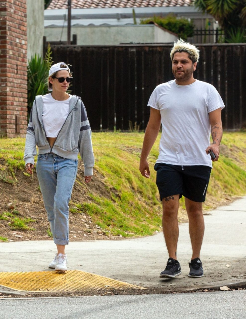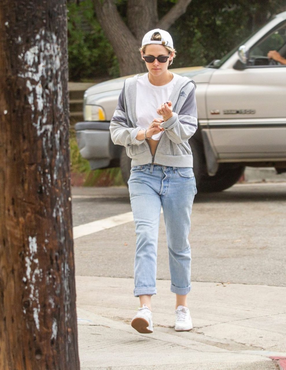 Kristen Stewart sceglie di non indossare il reggiseno mentre cammina verso la colazione con la sua amica a Los Angeles, 23/07/2019. Kristen appare casual con occhiali da sole, un top corto bianco sottile, jeans blu e sneakers bianche.