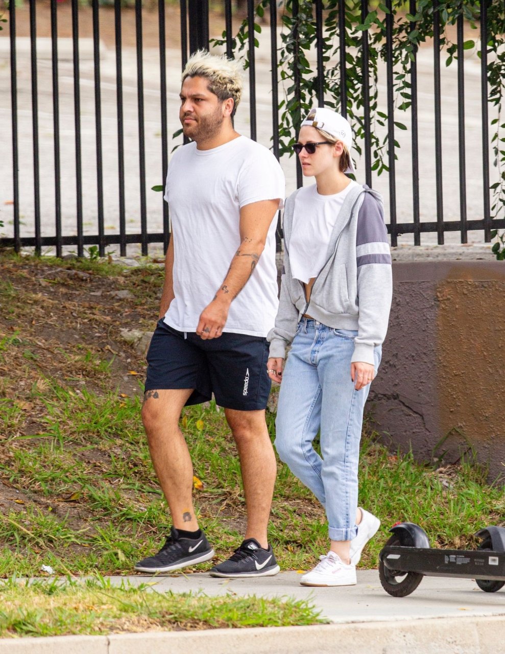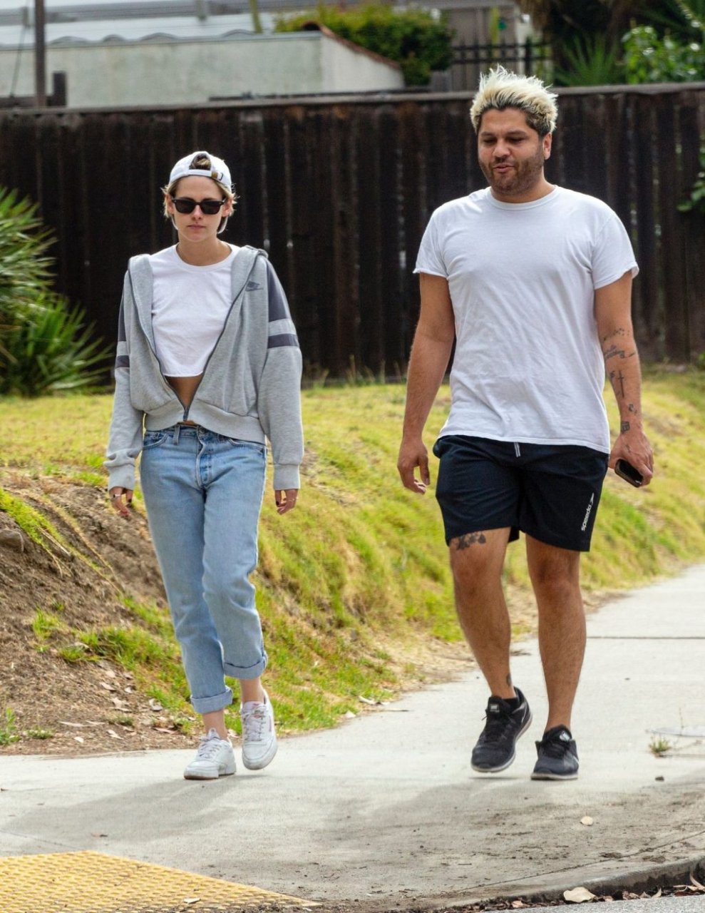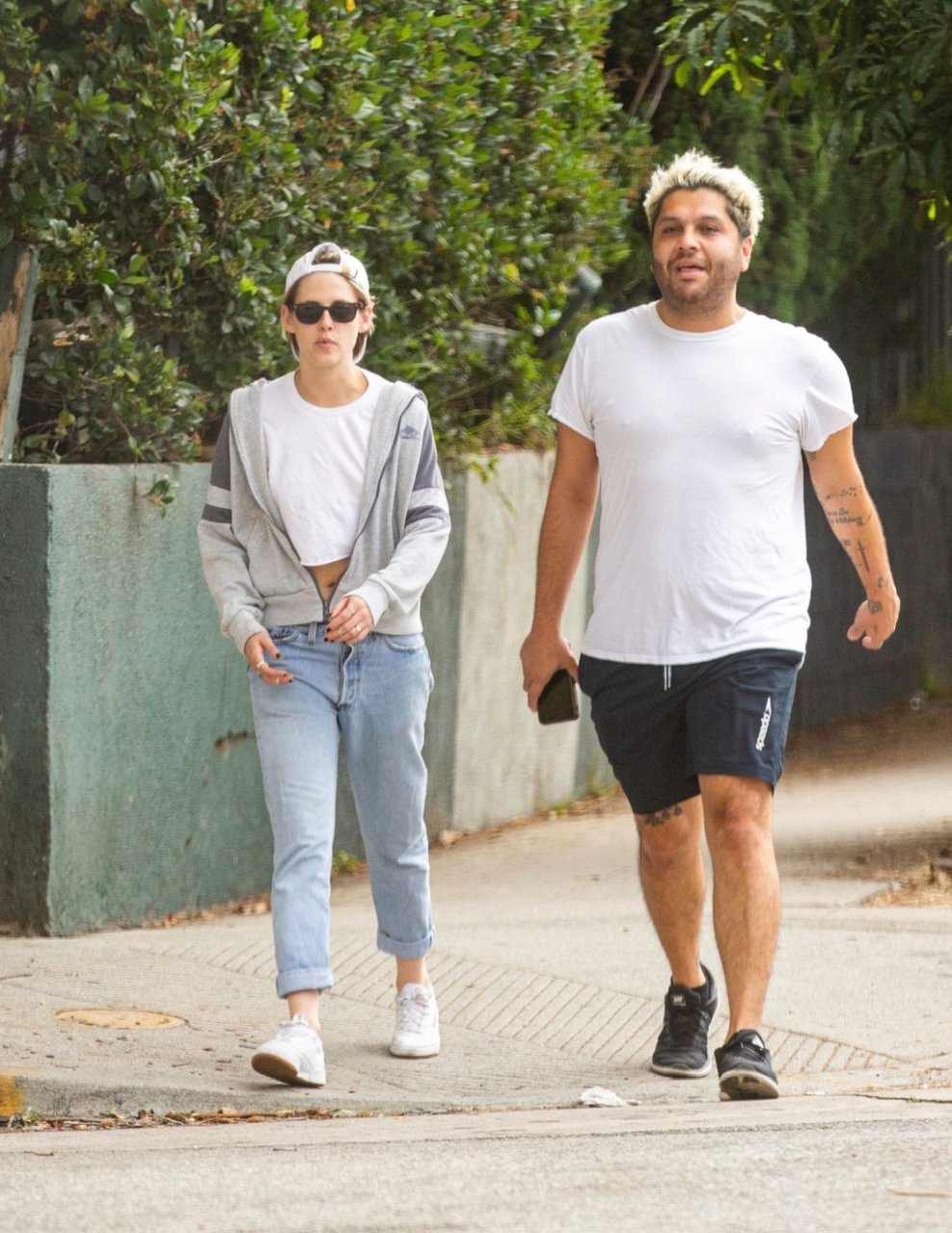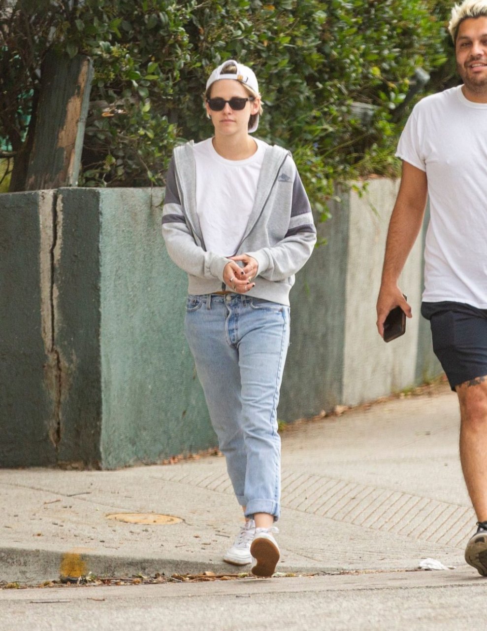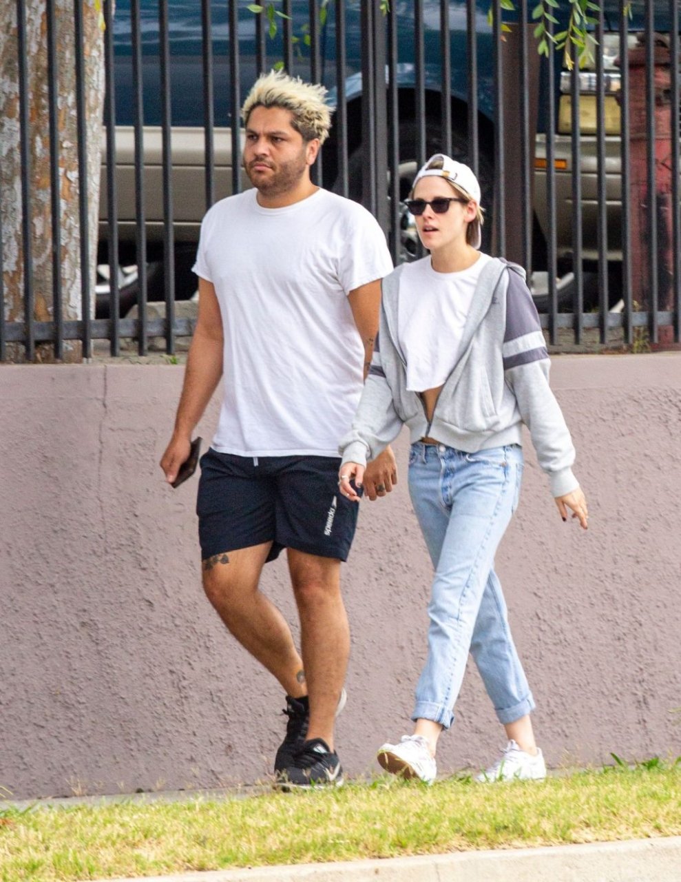 Kristen Stewart sceglie di non indossare il reggiseno mentre cammina verso la colazione con la sua amica a Los Angeles, 23/07/2019. Kristen appare casual con occhiali da sole, un top corto bianco sottile, jeans blu e sneakers bianche.