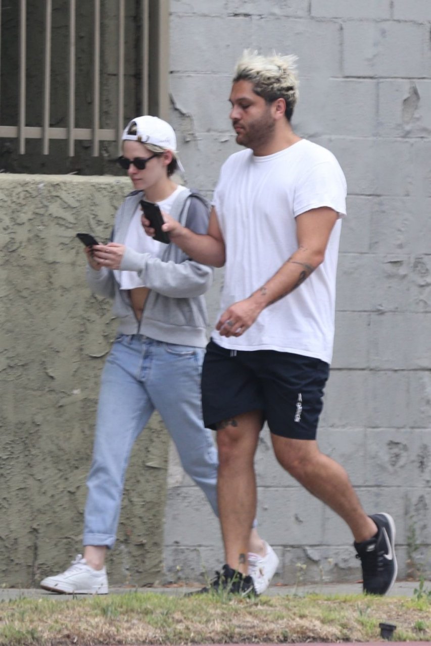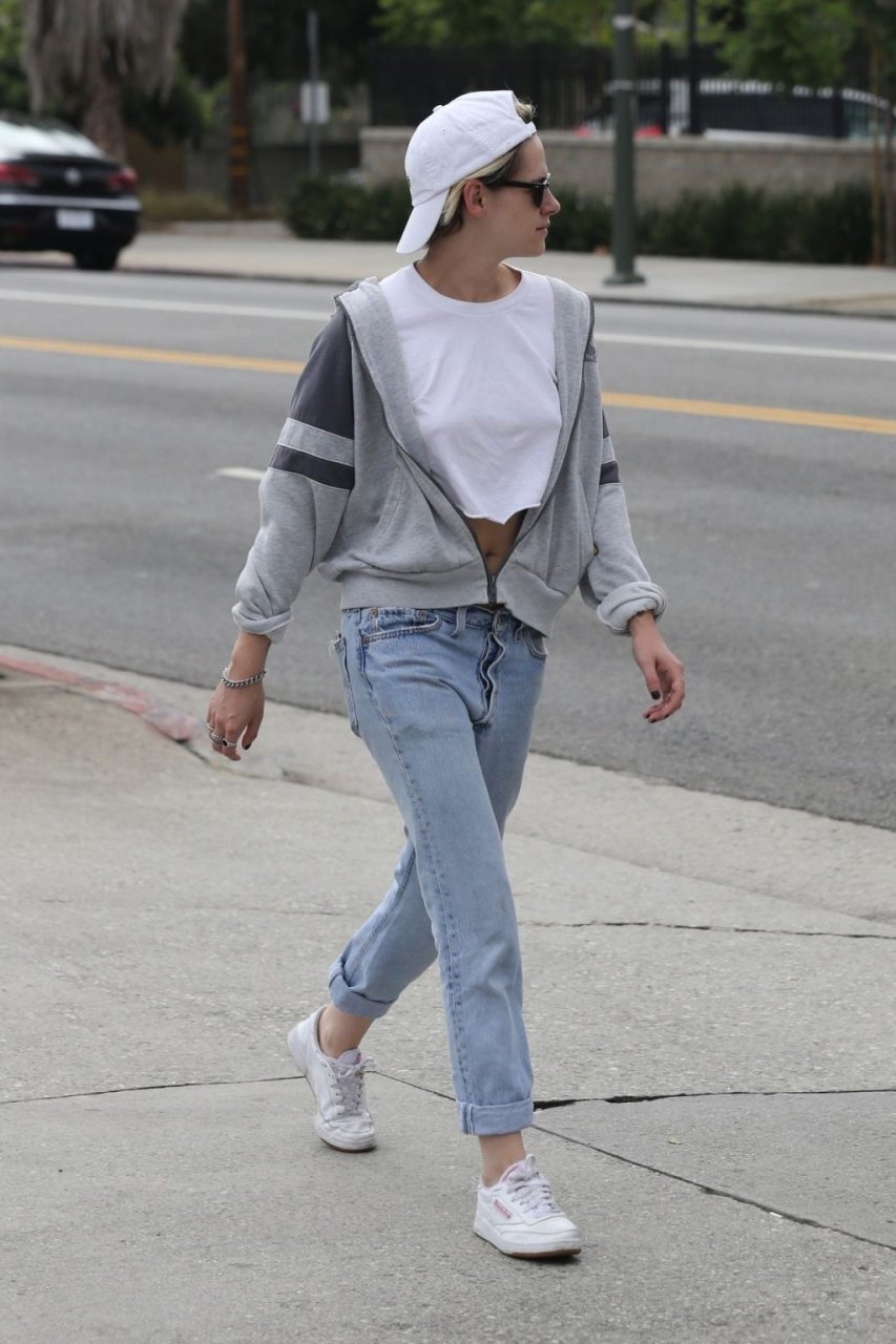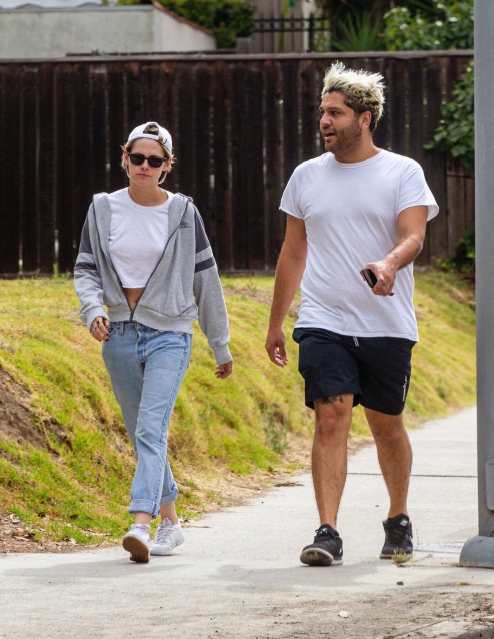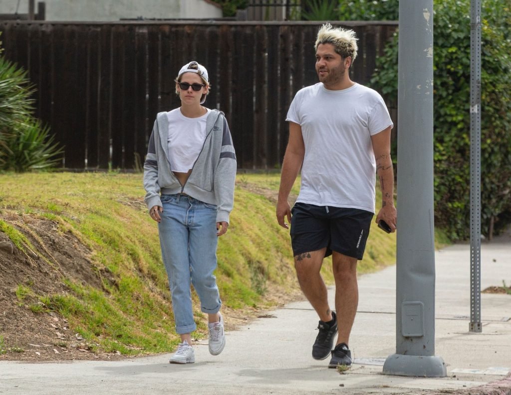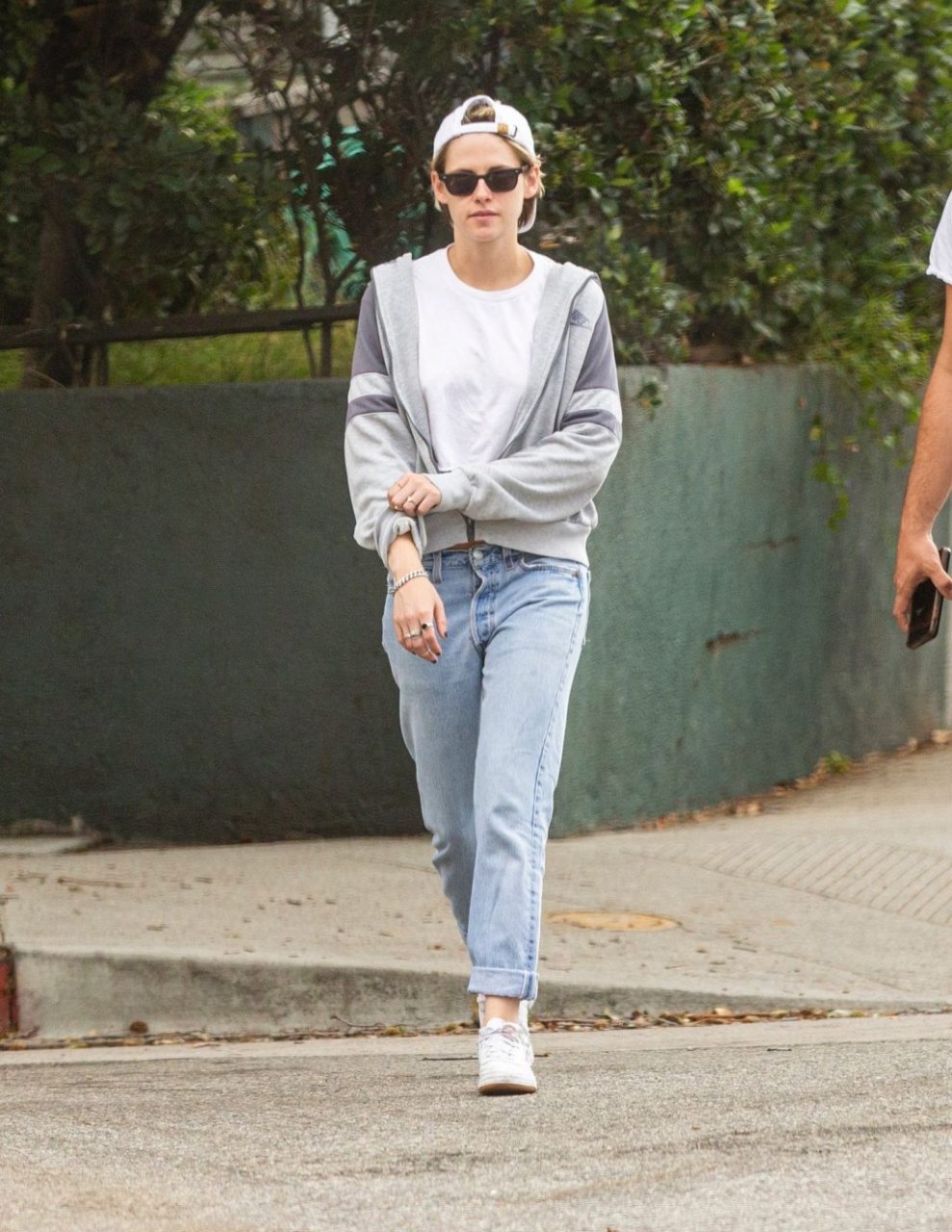 Kristen Stewart sceglie di non indossare il reggiseno mentre cammina verso la colazione con la sua amica a Los Angeles, 23/07/2019. Kristen appare casual con occhiali da sole, un top corto bianco sottile, jeans blu e sneakers bianche.