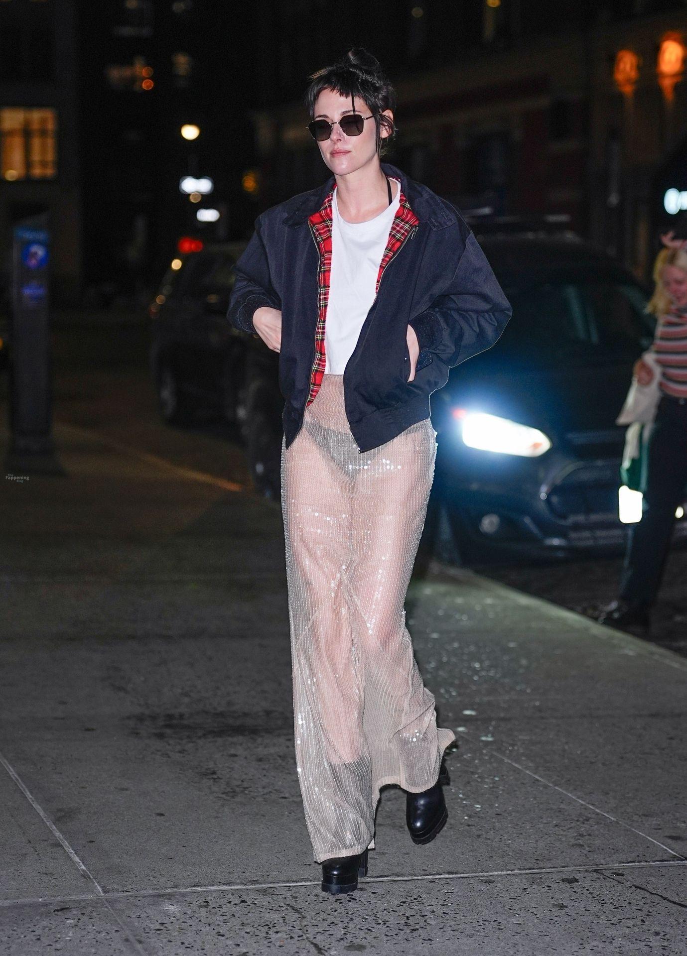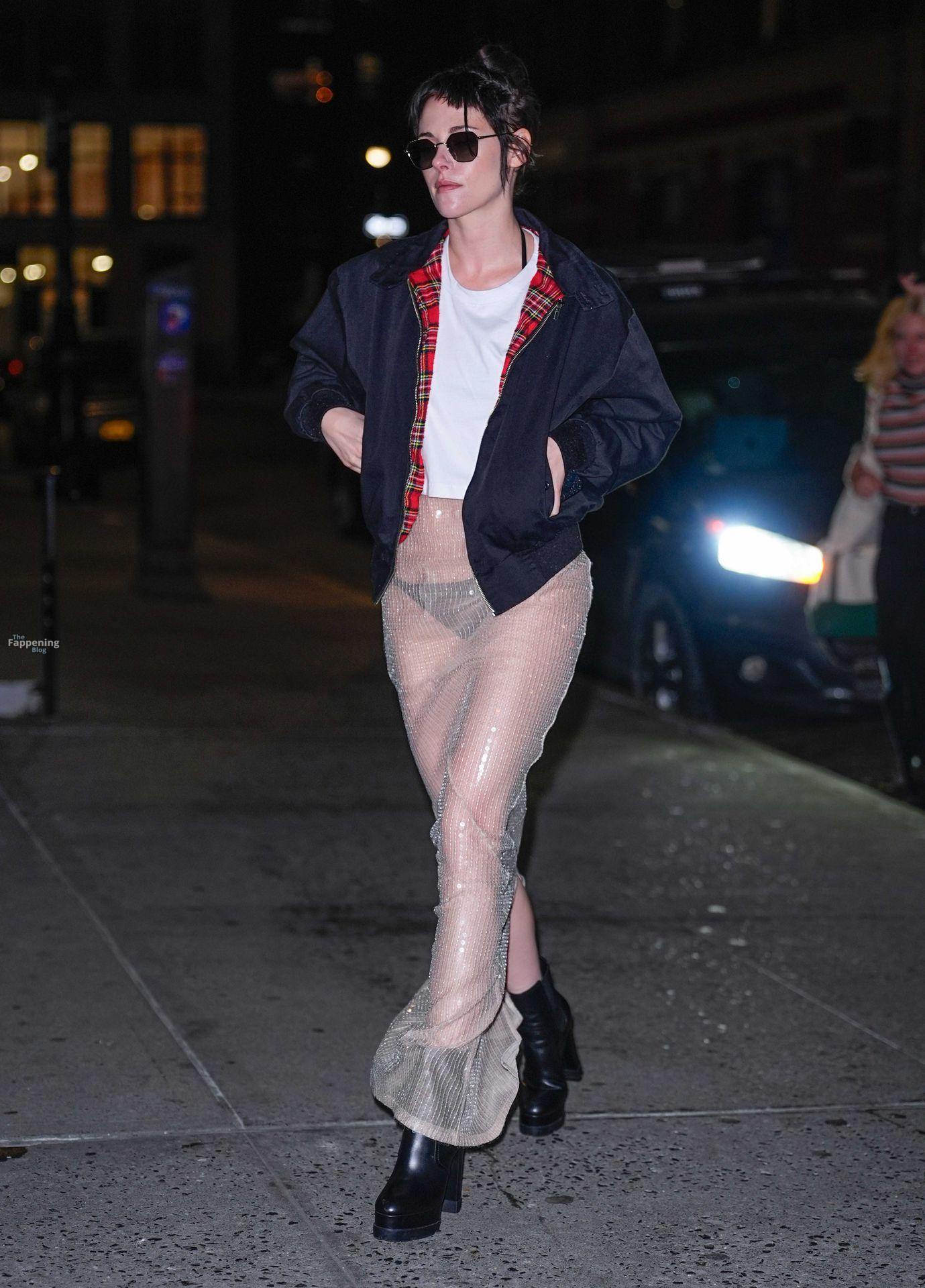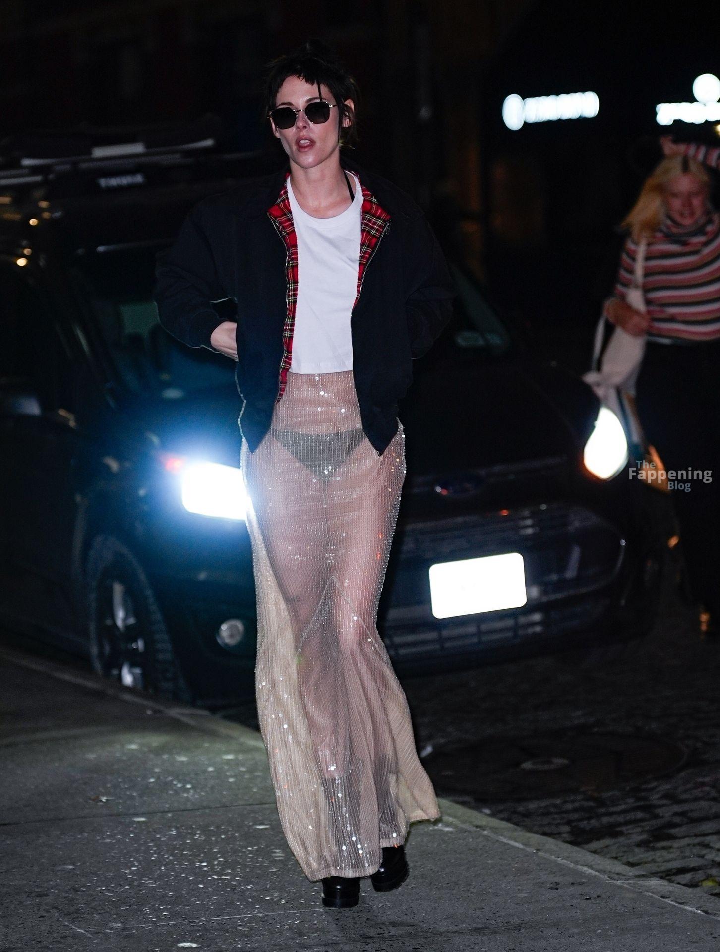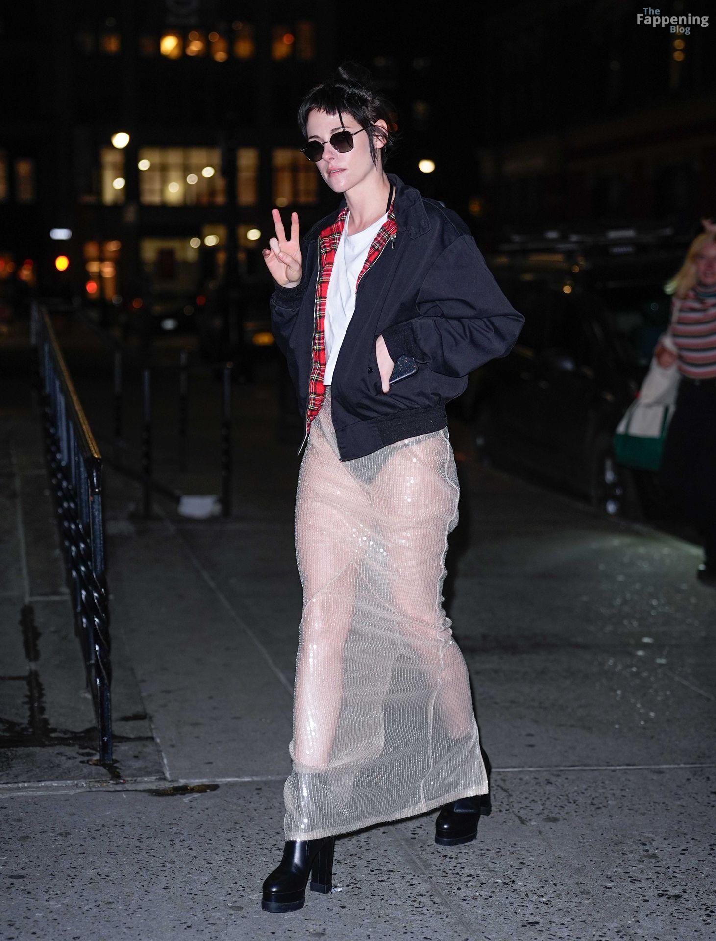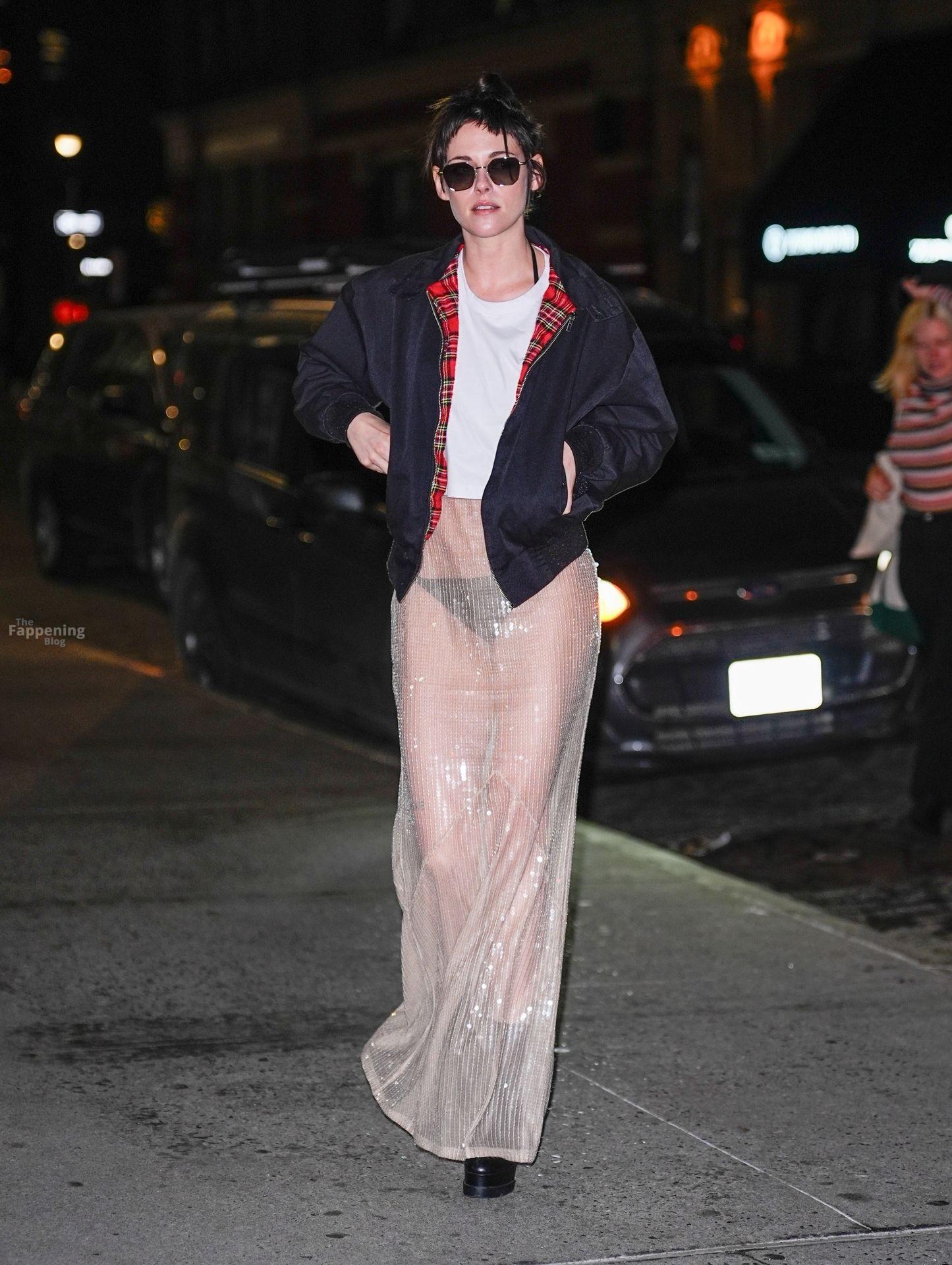 La star di The Fappening Kristen Stewart esce con un outfit rivelatore a New York City. L’attrice americana indossava una giacca nera, un crop top bianco, una gonna trasparente e tacchi piattaforma neri.