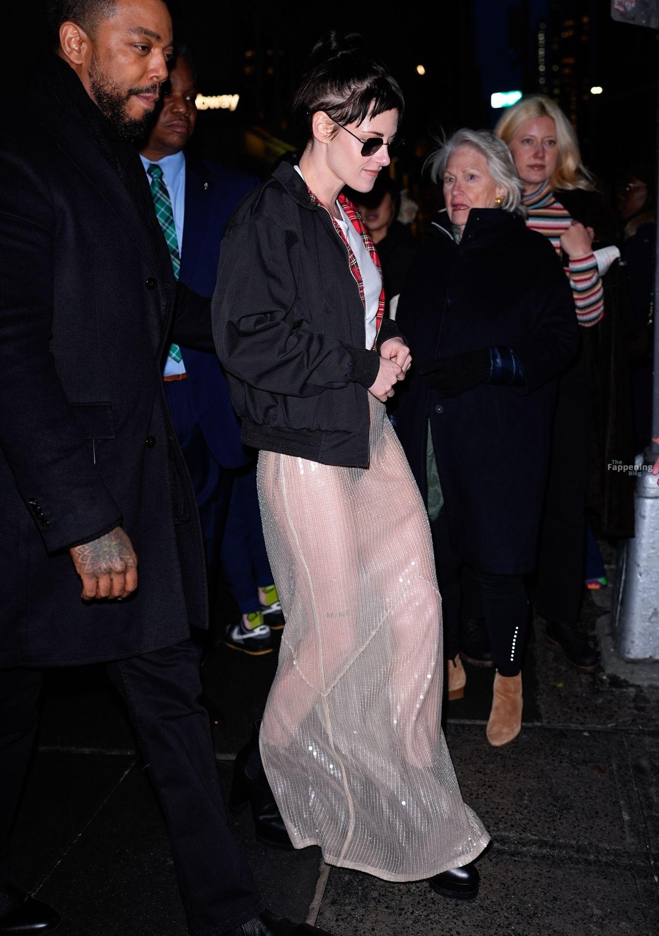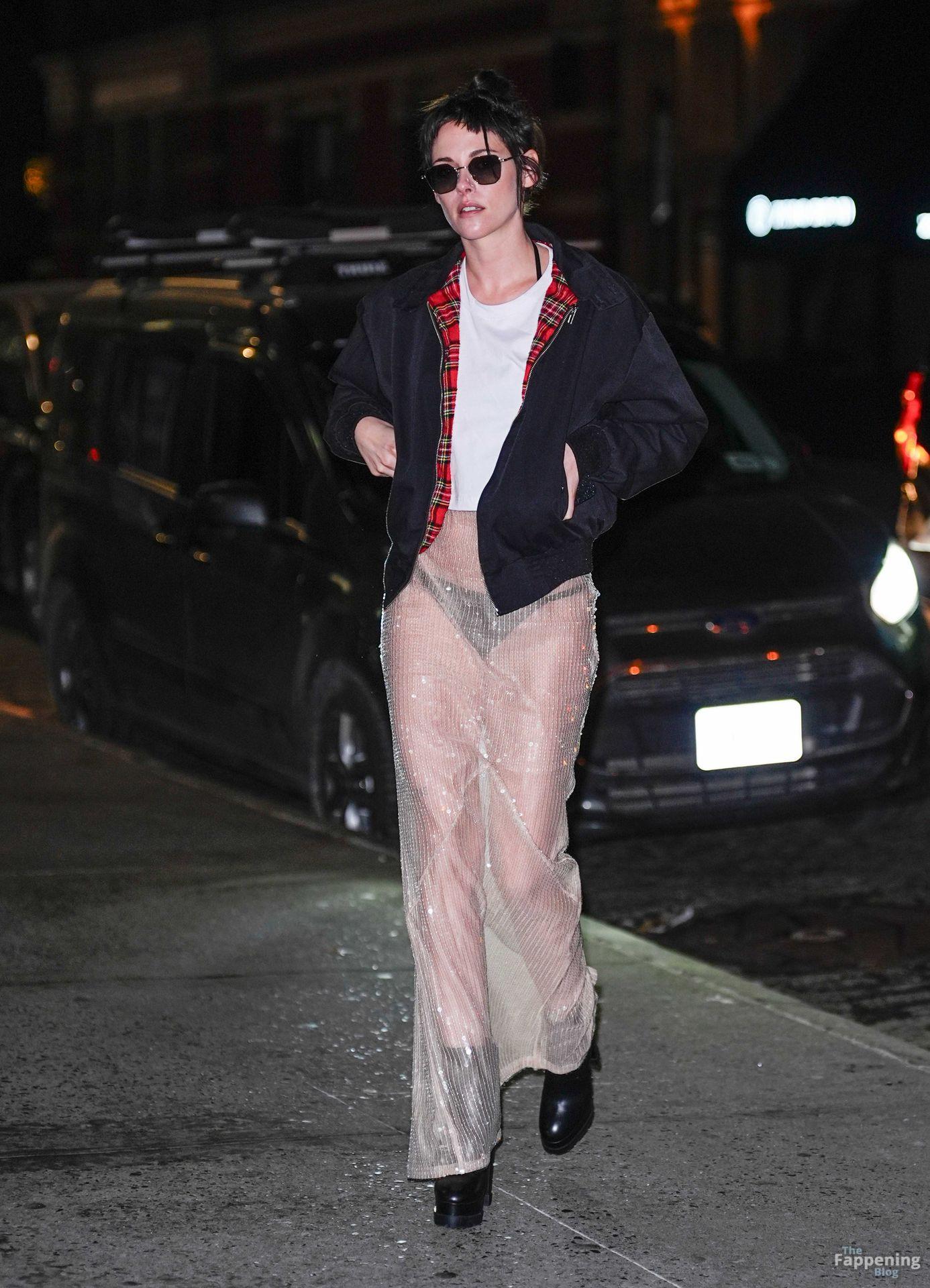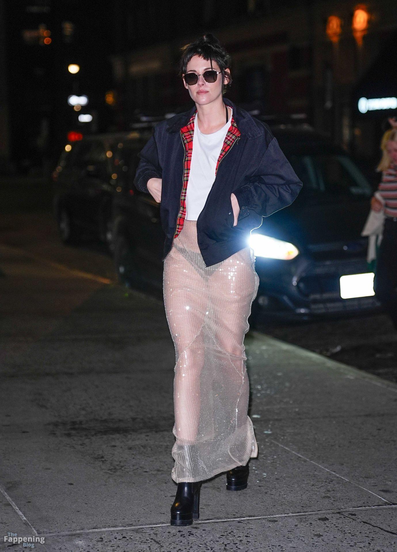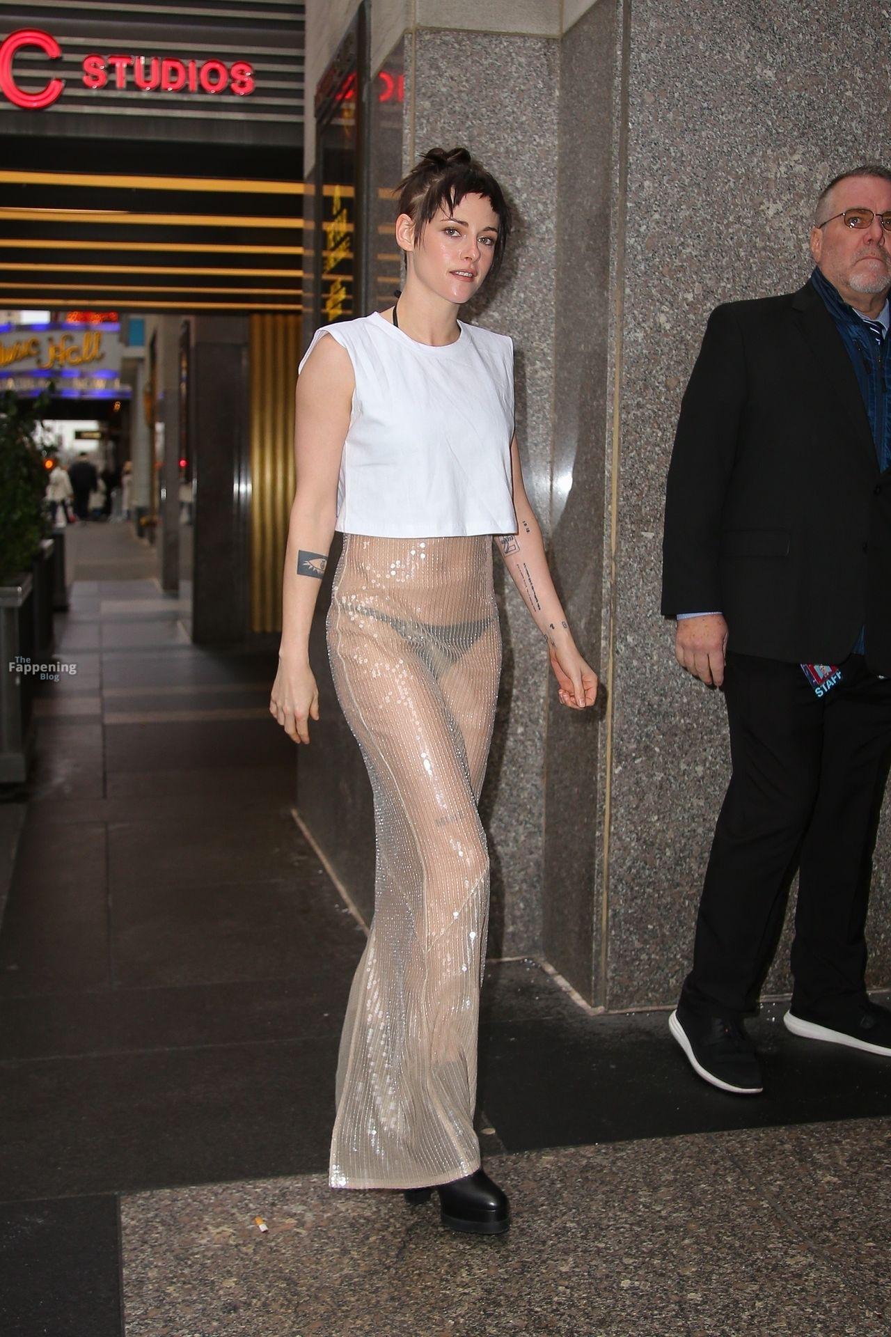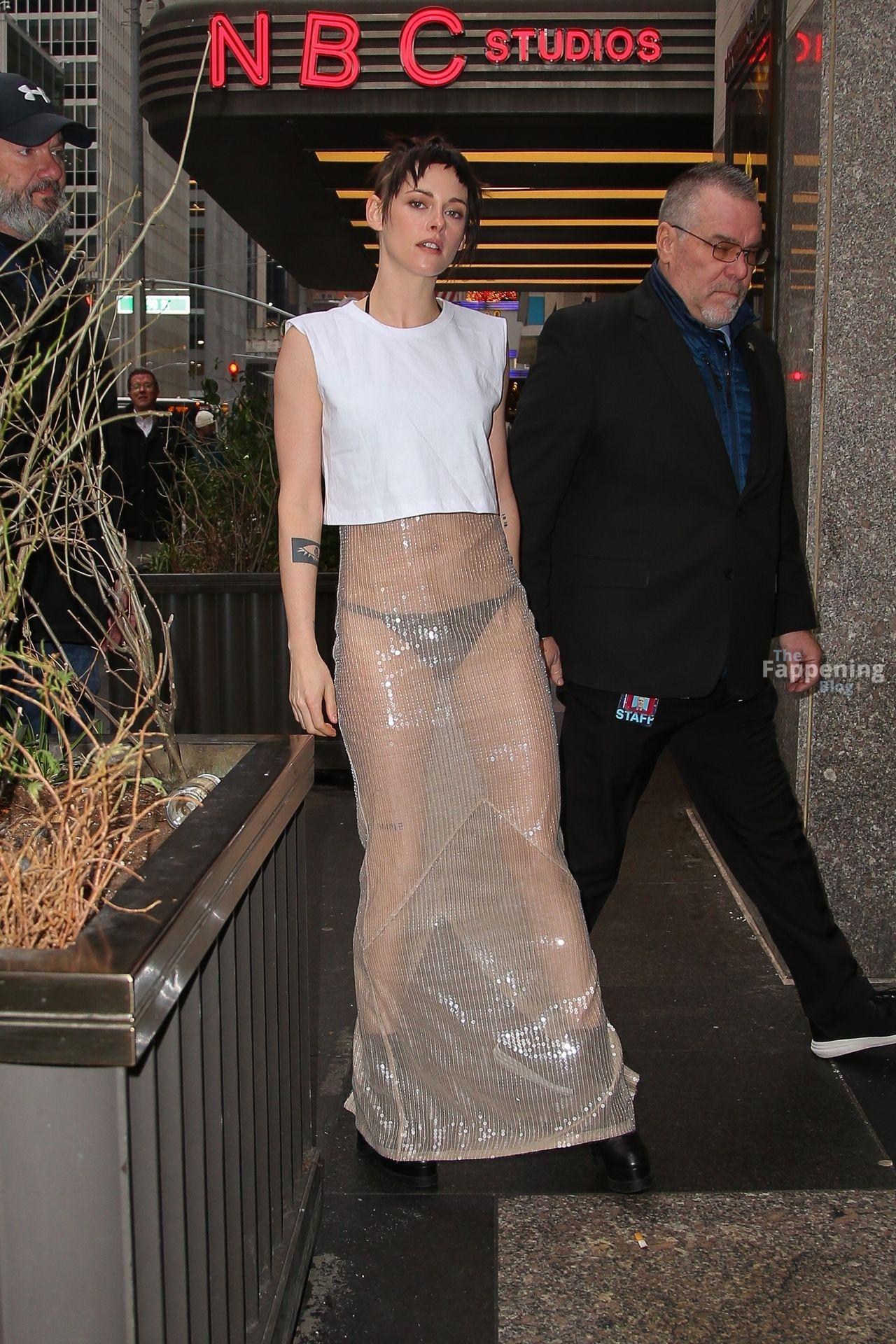 La star di The Fappening Kristen Stewart esce con un outfit rivelatore a New York City. L’attrice americana indossava una giacca nera, un crop top bianco, una gonna trasparente e tacchi piattaforma neri.