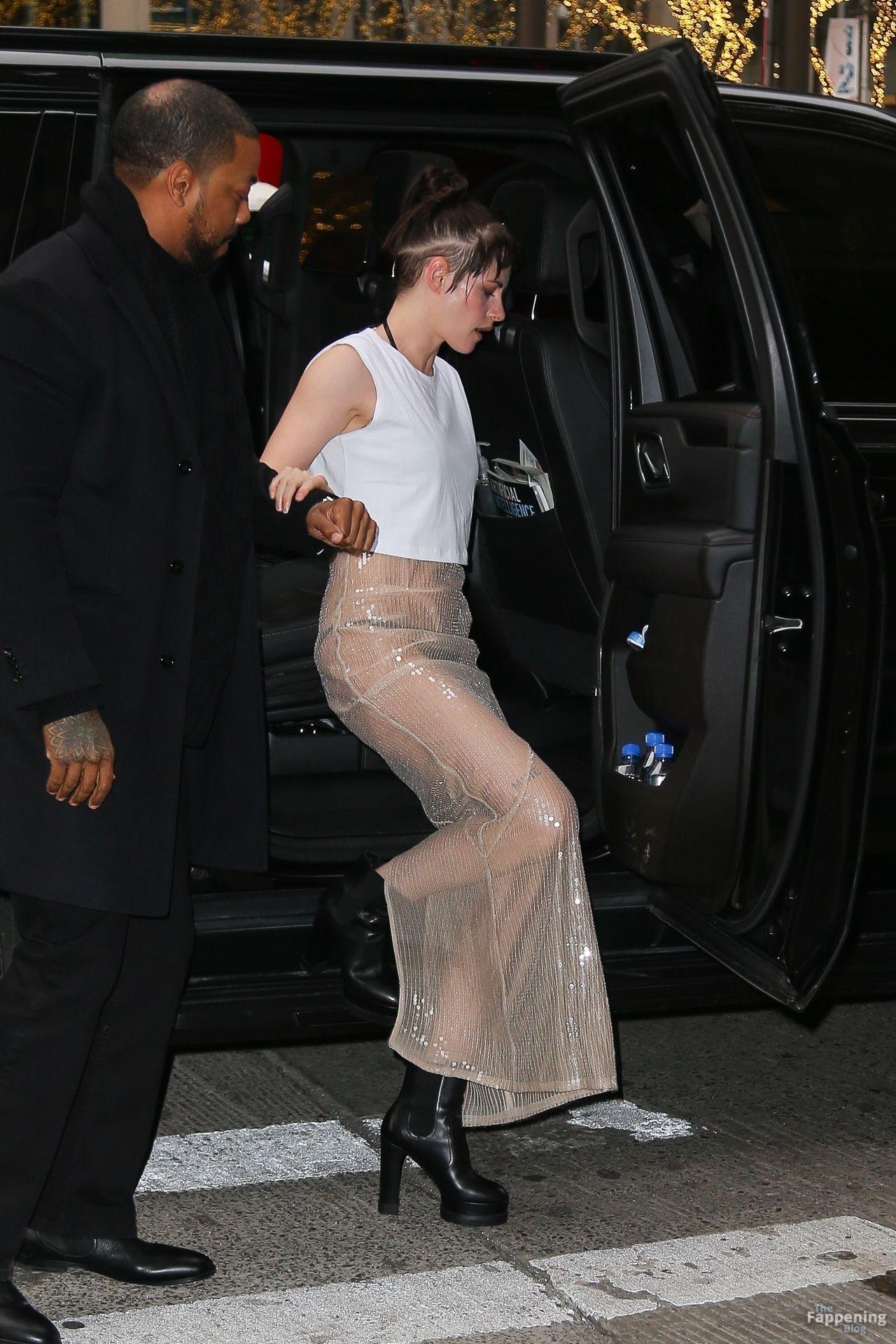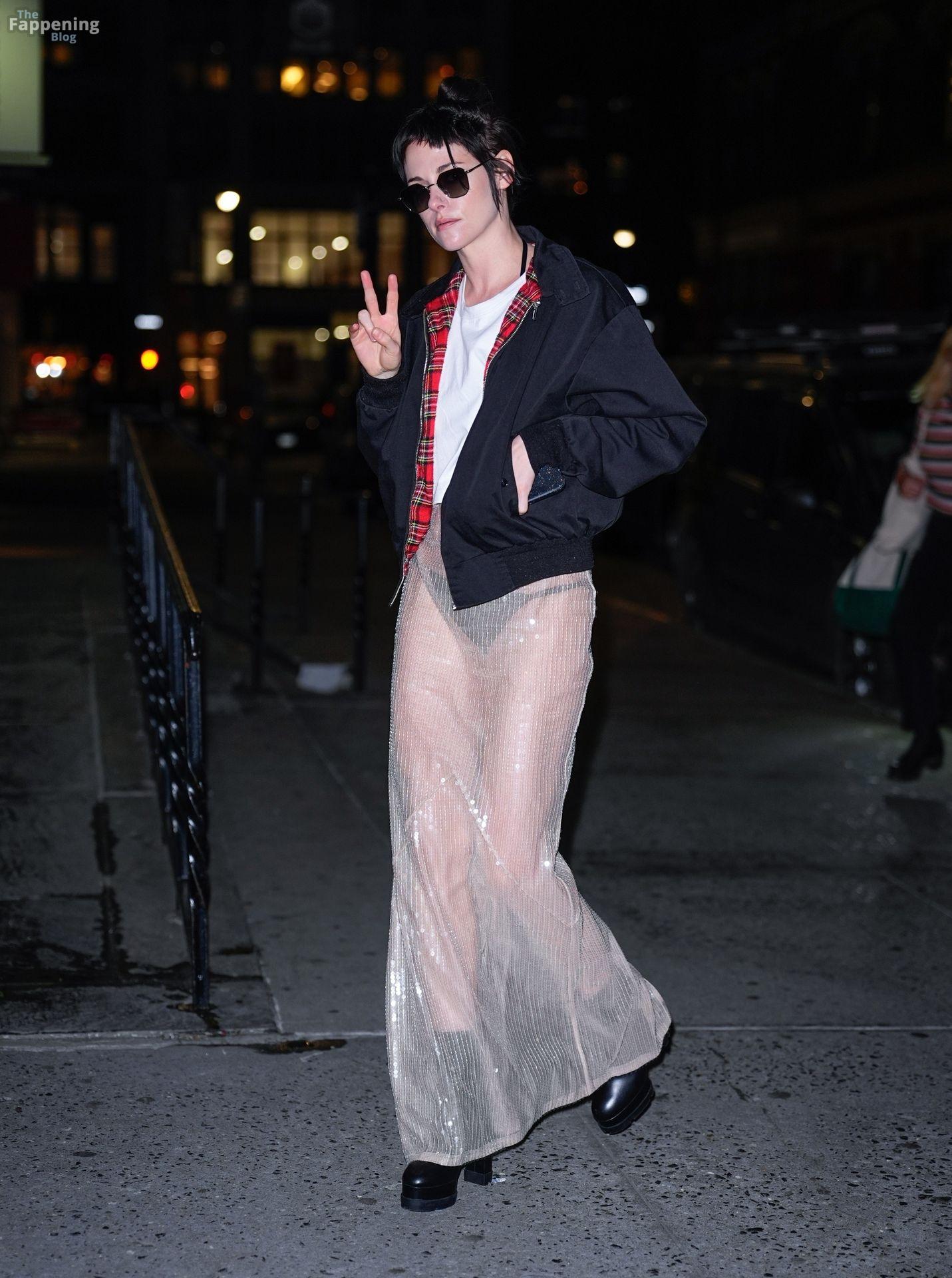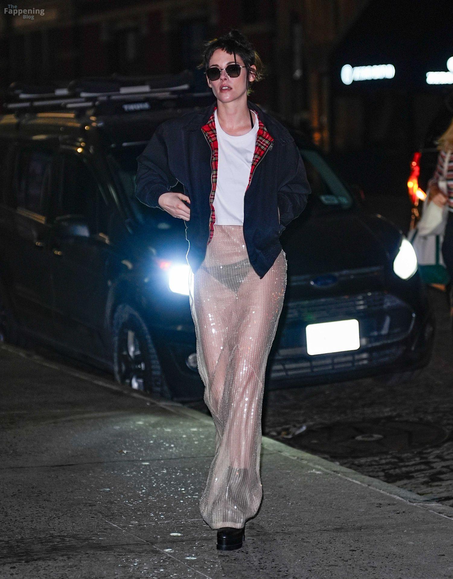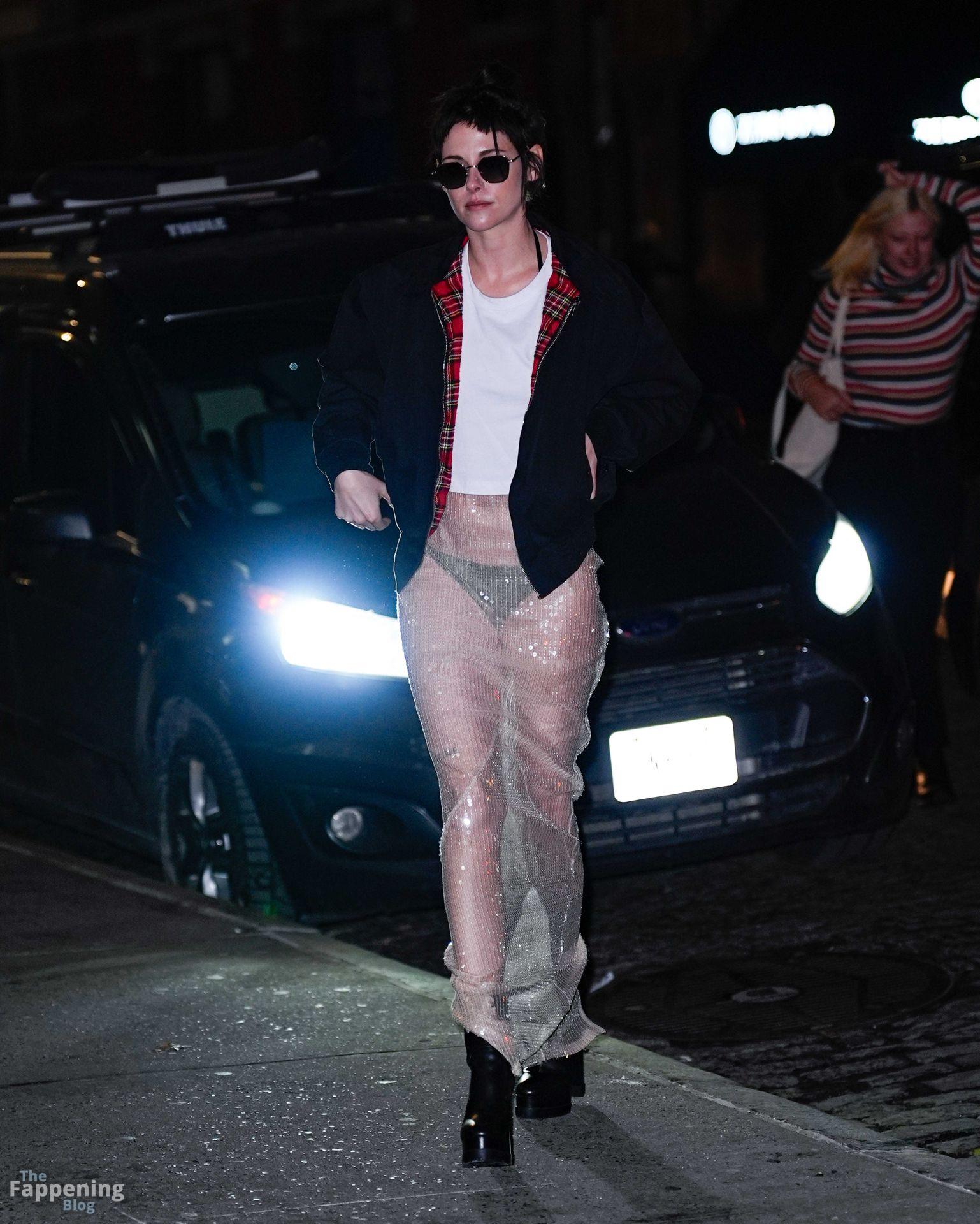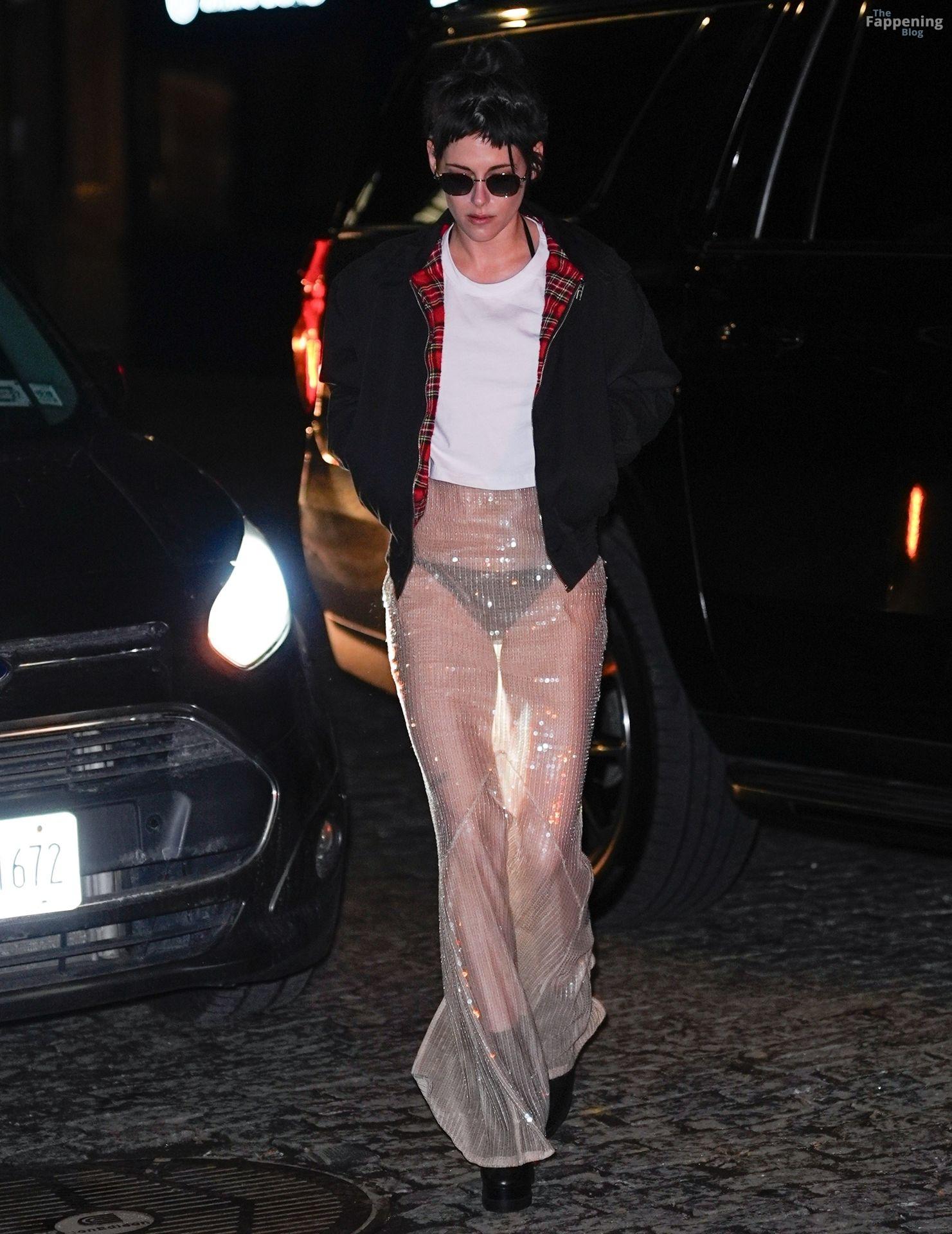 La star di The Fappening Kristen Stewart esce con un outfit rivelatore a New York City. L’attrice americana indossava una giacca nera, un crop top bianco, una gonna trasparente e tacchi piattaforma neri.